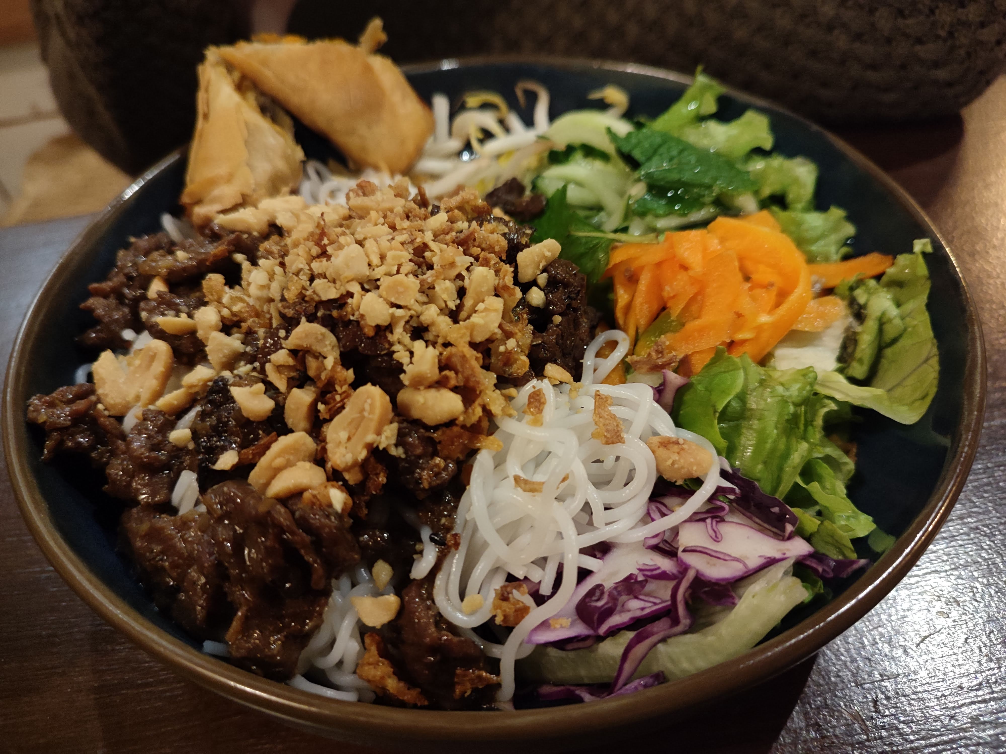 J’ai testé le Bobun bœuf citronnelle et ça a été un vrai plaisir, plein de parfums, et la viande surtout était de qualité! Un vrai régal. La carte est interressante aussi pour les « Com », autre spécialité du lieu, et aussi pour les boissons originales, mais je ne les ai pas encore testées. Bref un endroit charmant pour une cuisine asiatique « street food » de très bonne qualité! Je recommande!
