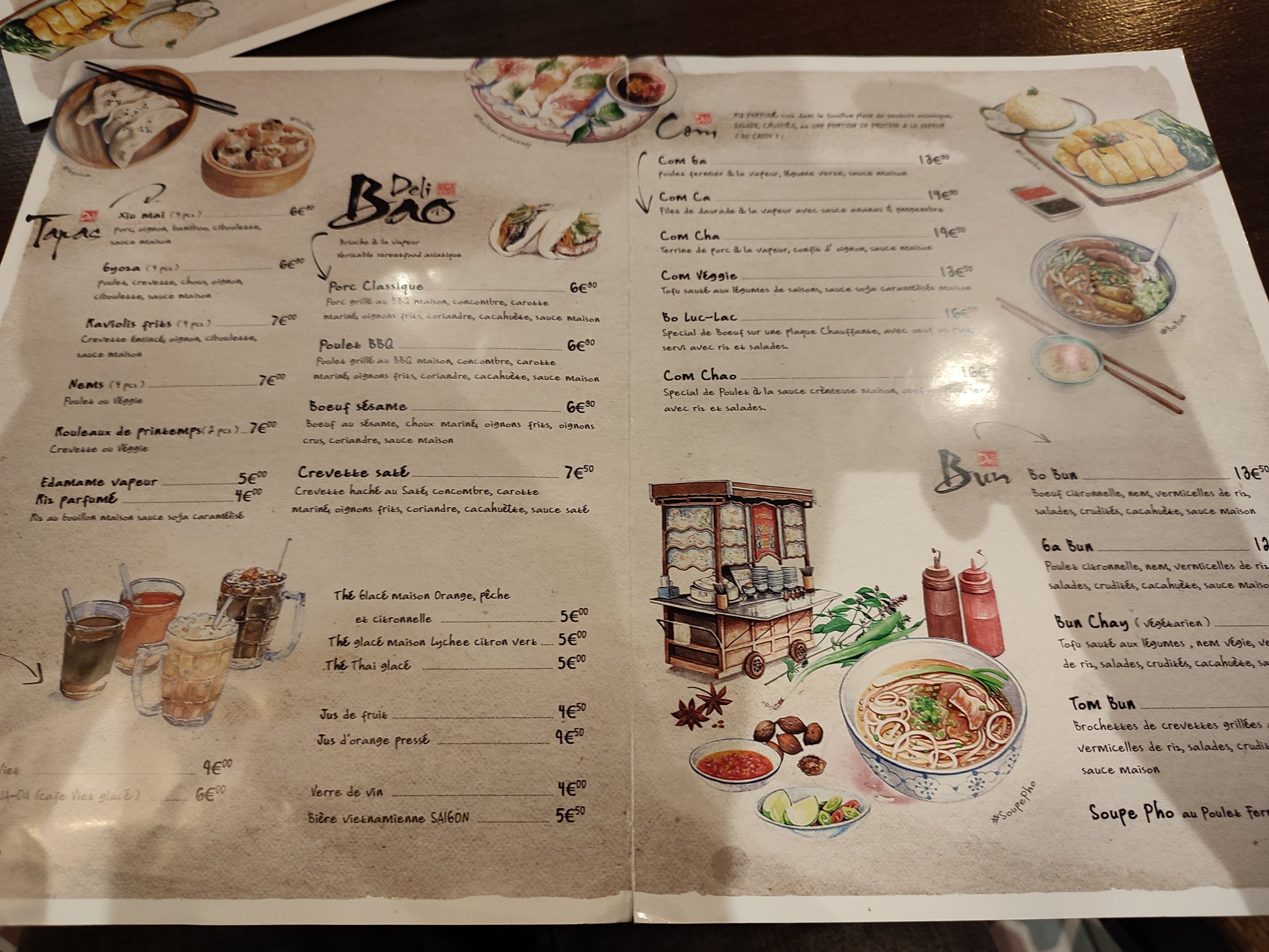 C’est aussi bon sur place qu’à emporter ! Le ba bun (bo bun au poulet) est délicieux et les baos sont à tomber. Les serveurs sont très gentils et attentionnés. Seul petit bémol : il fait assez froid à l’intérieur, même au fond de la salle.