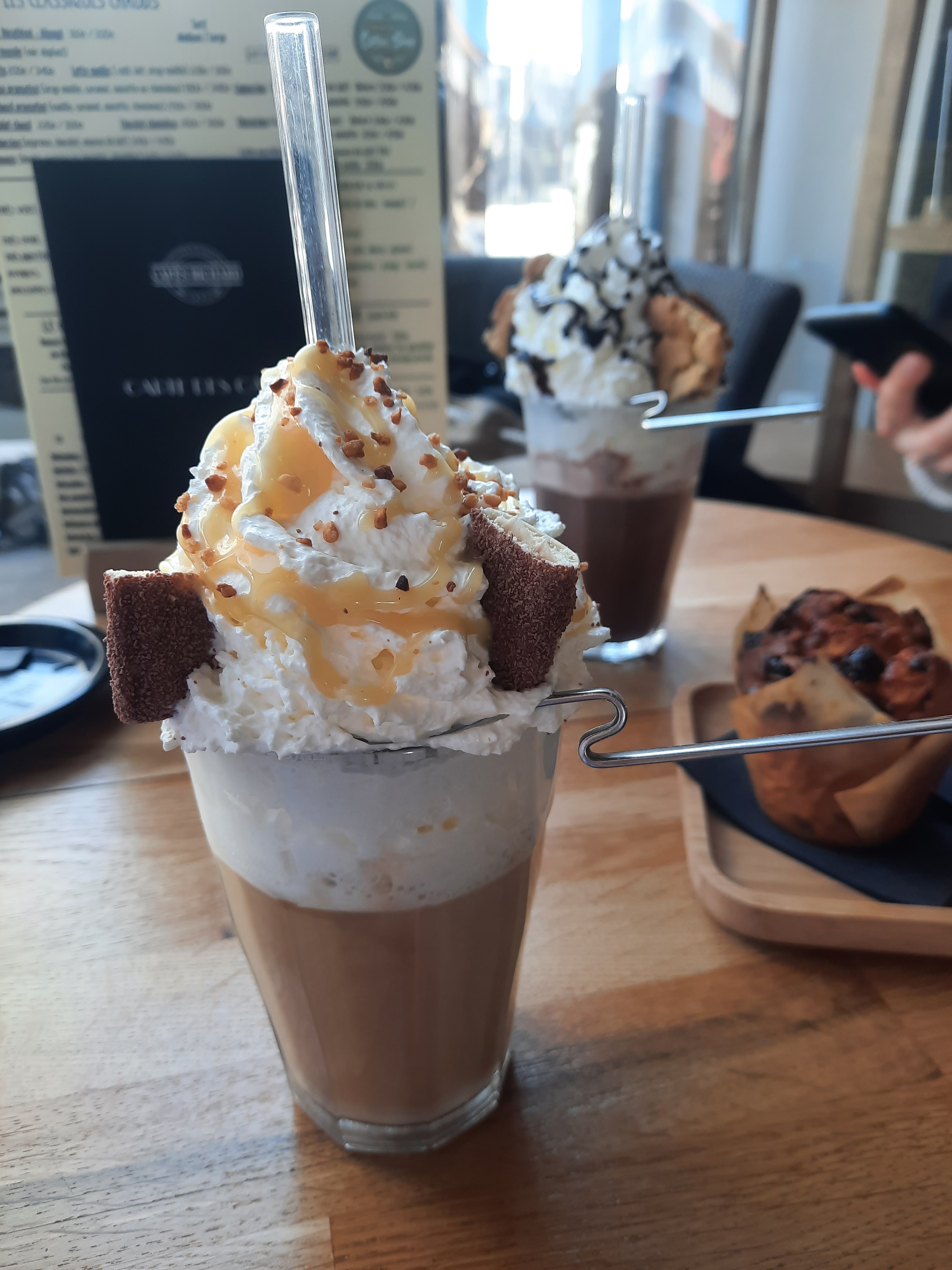 Trop bon! Café frappé, milkshake, chocolat chaud etc tout ça avec des topping de fous! On avait pas assez faim pour prendre des gâteaux en plus, mais ils avaient l'air délicieux. Ambiance sympa en plus !