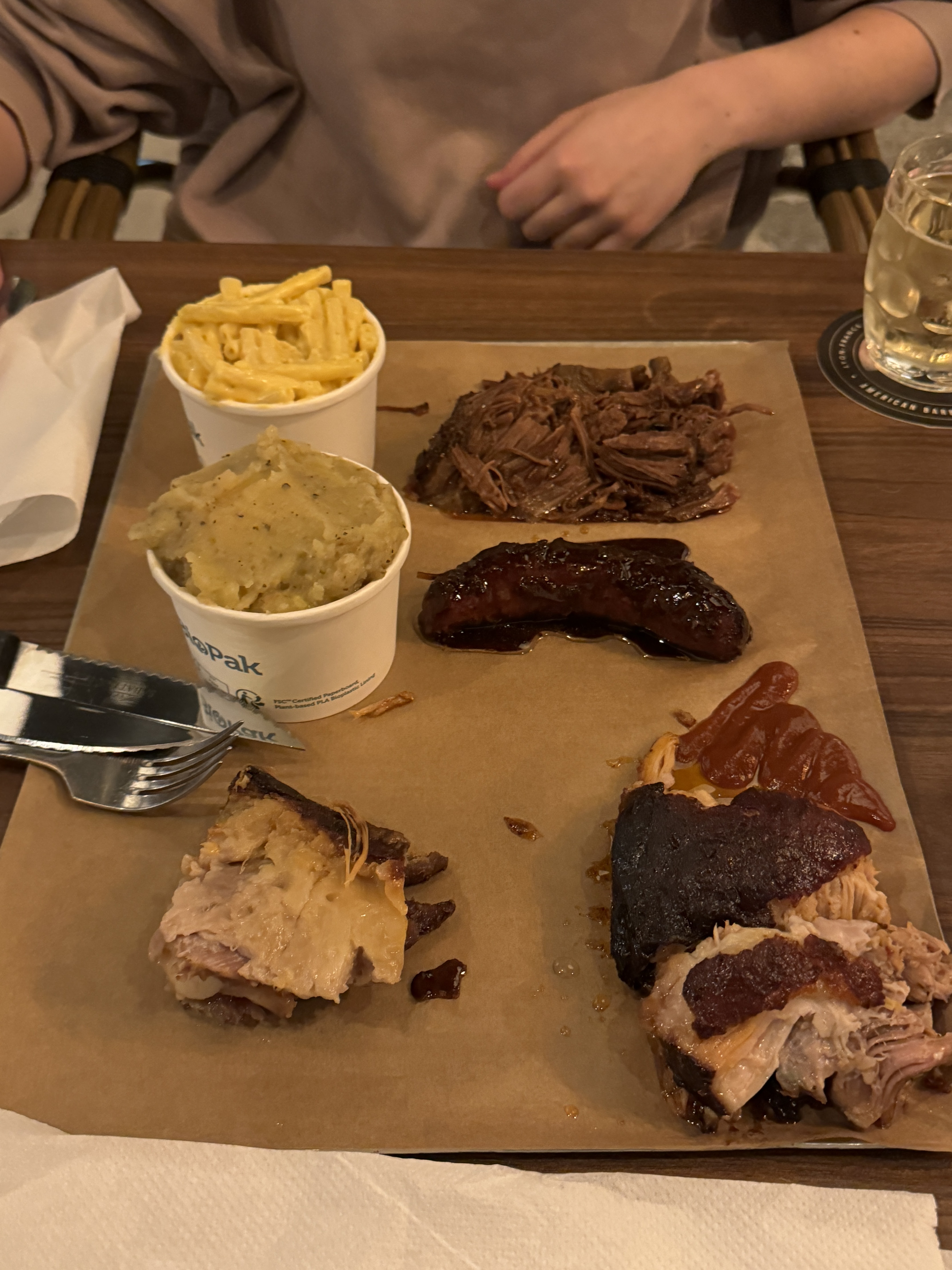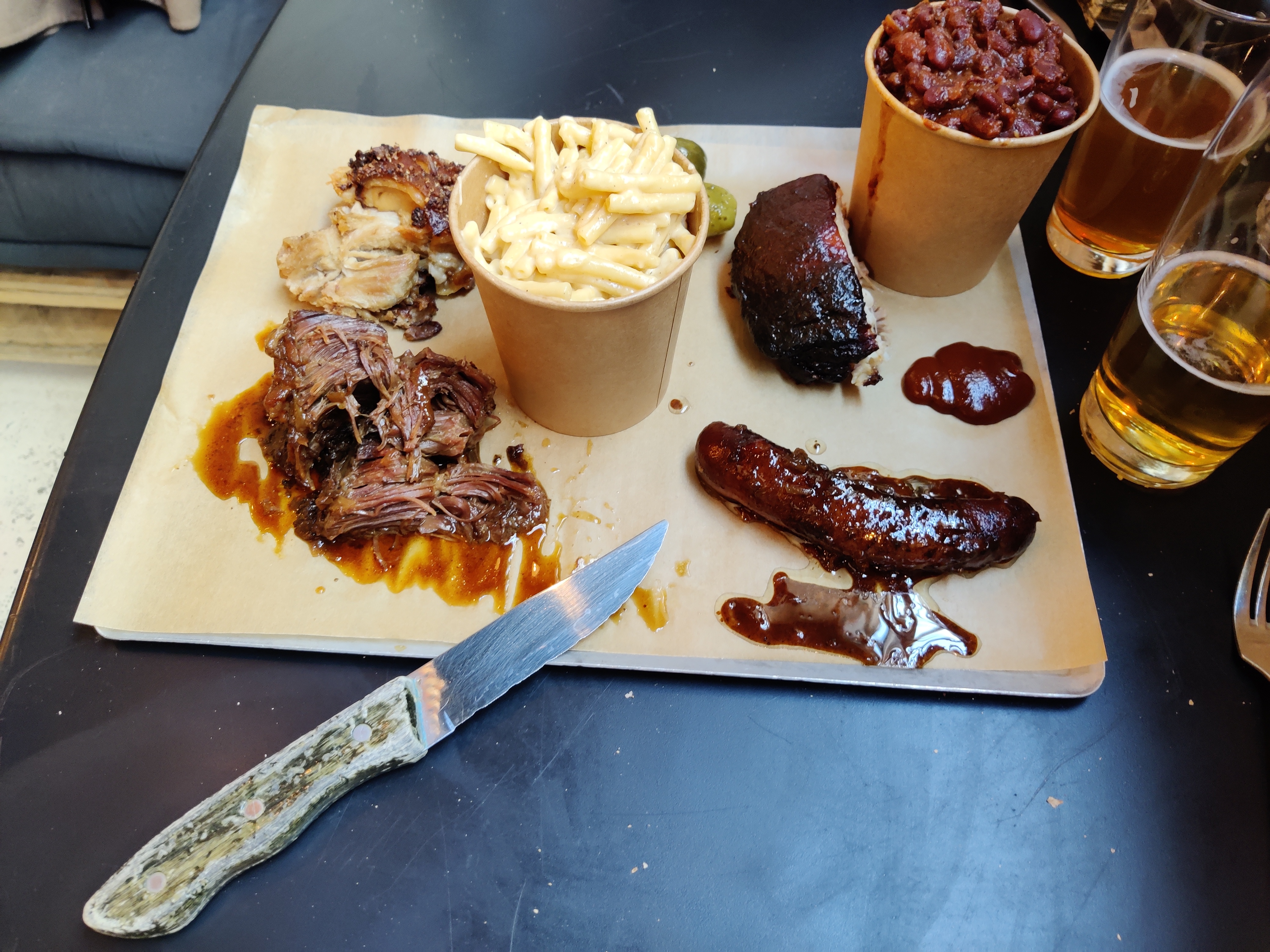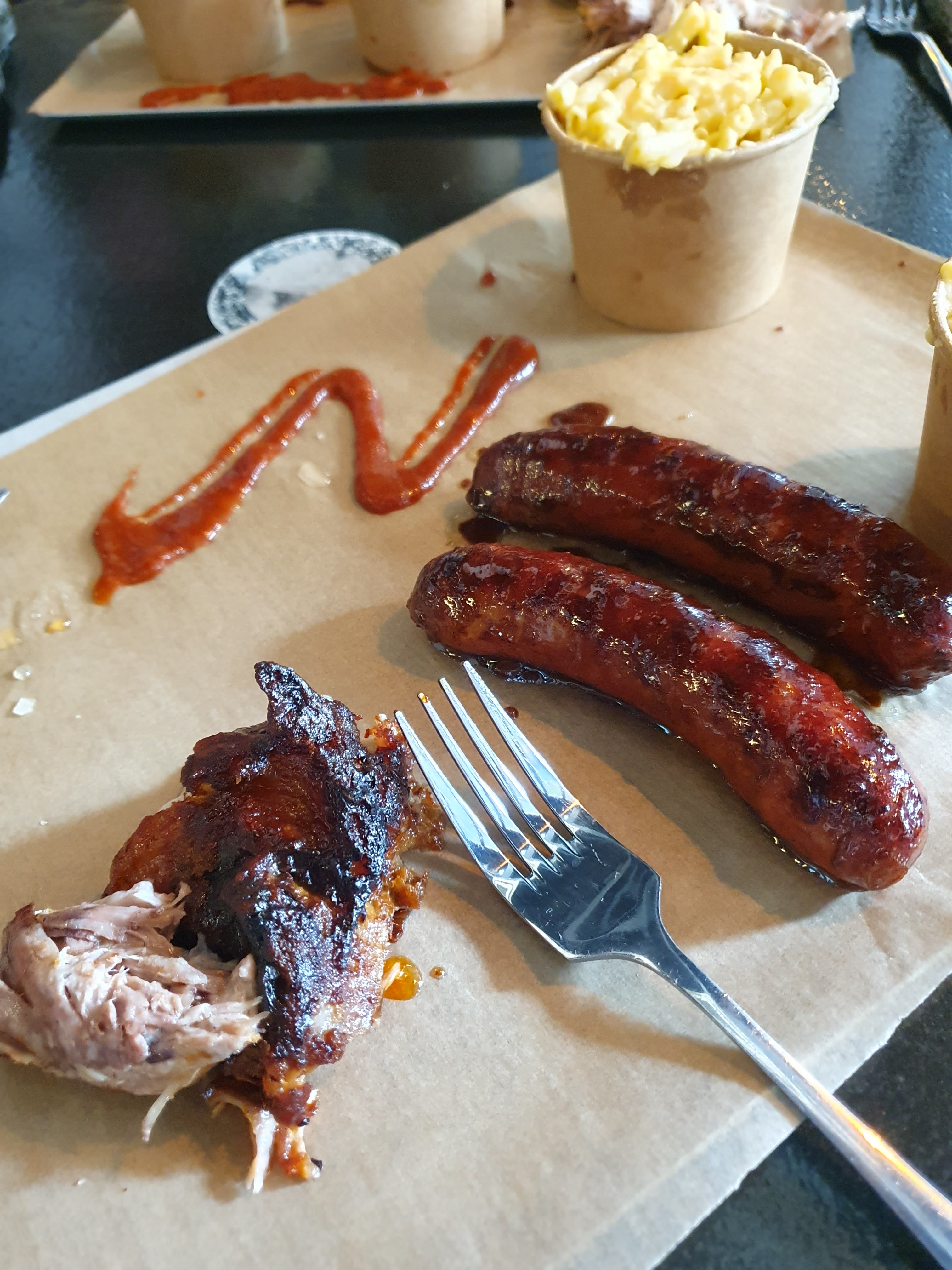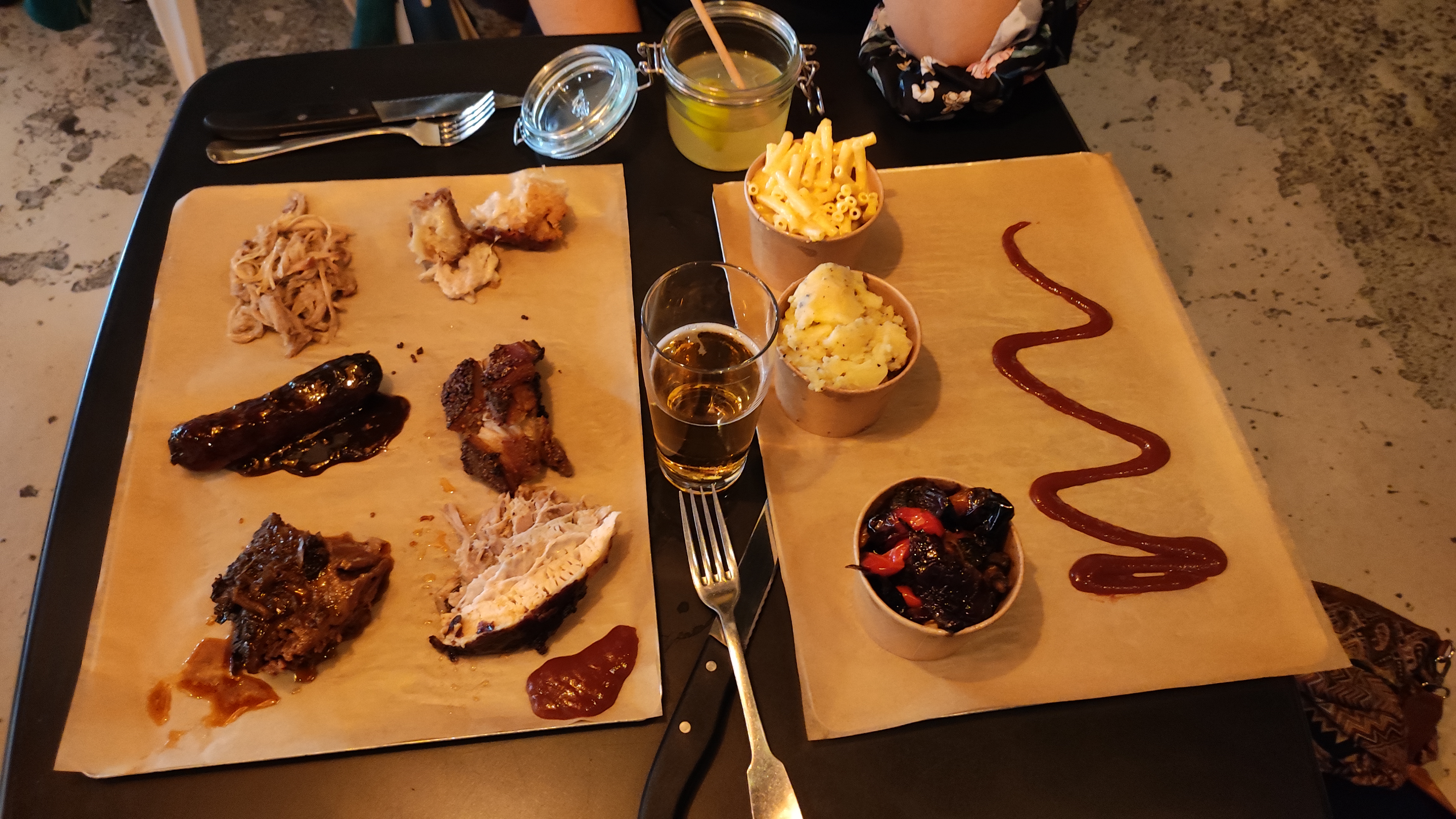 Service au comptoir, équipe accueillante et rodée, il ne reste plus qu'à profiter de la qualité des mets : sélection de viandes (volaille, porc, boeuf, saucisses) de provenance certifiée bien préparées, accompagnements sous forme de Mac & Cheese, maïs à la crème, cow-boy beans le tout servi sur un plateau à partager Très agréable et sympathique.