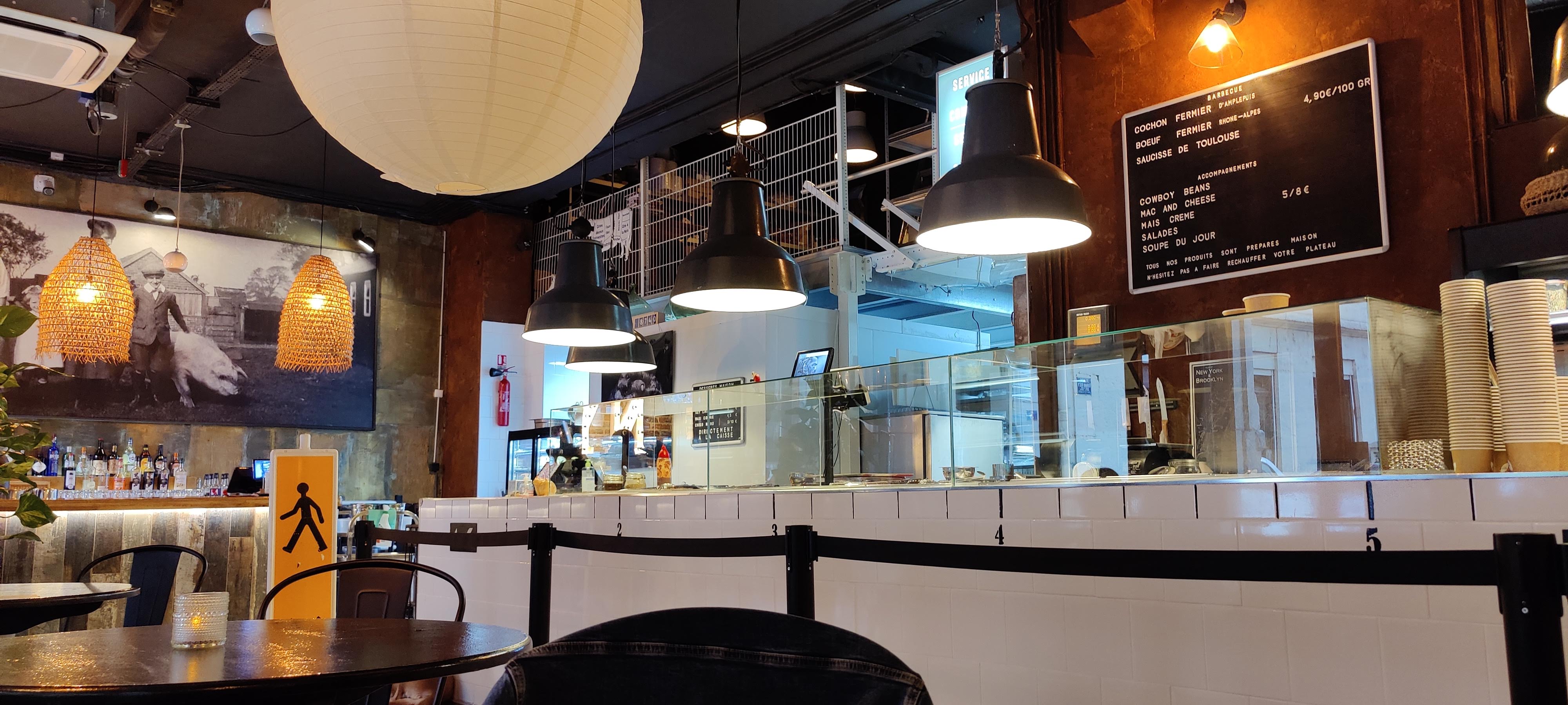 Lieu atypique, ici tout est au poids et se partage. On choisit ce qu’on veut et en quelle quantité et tout est mis sur un seul et même plateau dans lequel chaque convive va piocher. On paye au poids. Ce n’est ni vegan ni healthy mais c’est excellent ! Au choix par exemple : saucisse de Toulouse confite au vinaigre balsamique, paleron de boeuf fermier à la bière noire, épaule de porc fermier de la Loire au sirop d'érable, ribs. En accompagnement, mac and cheese, beans, maïs crémé et cheddar. Très bon potage également (butternut cumin lors de notre venue). N’hésitez pas à faire réchauffer votre plateau en cours de repas, ça refroidit vite. Les desserts sont incroyables, le maxi cookie est gigantesque et délicieux. Et seulement à 4,50€ ! Pour le prix, comptez autour de 20€ par personne hors boisson, avec dessert et des quantités assez généreuses (un petit mangeur comptera plutôt 15€). Grandes tablées bienvenues, il y a de la place. Et en plus, le staff est très sympathique et souriant tout en étant professionnel et efficace. J’y reviendrai avec plaisir.