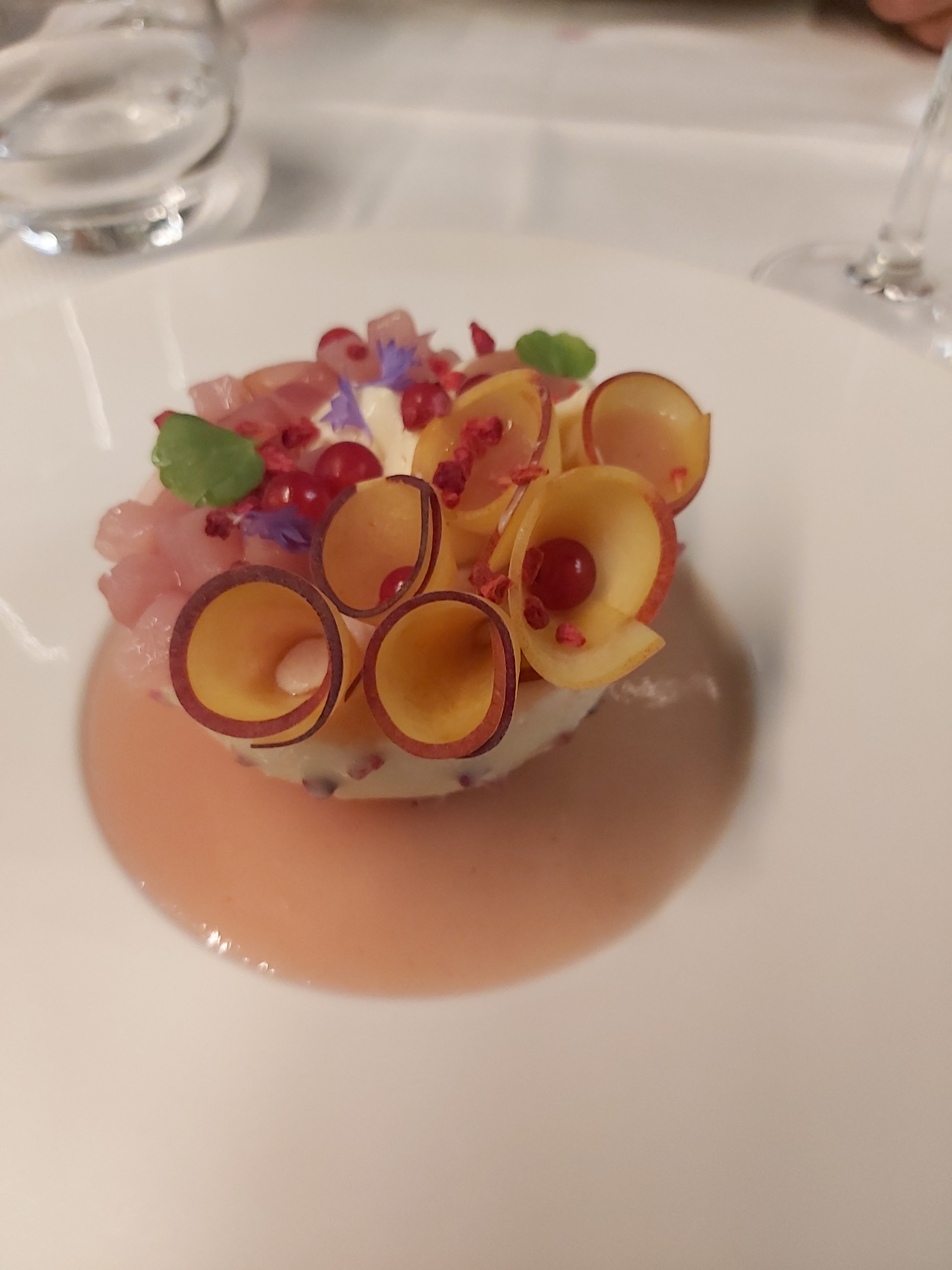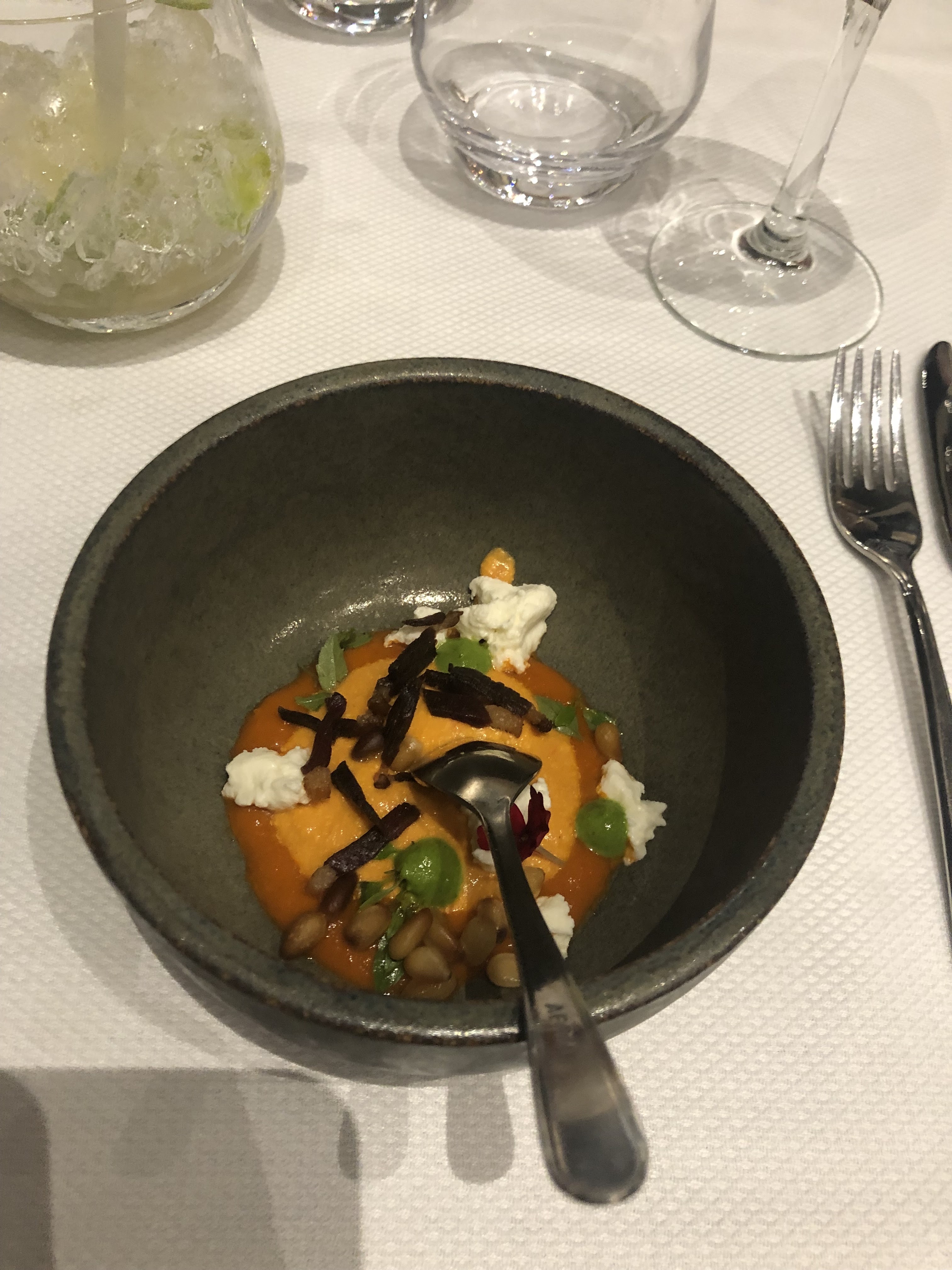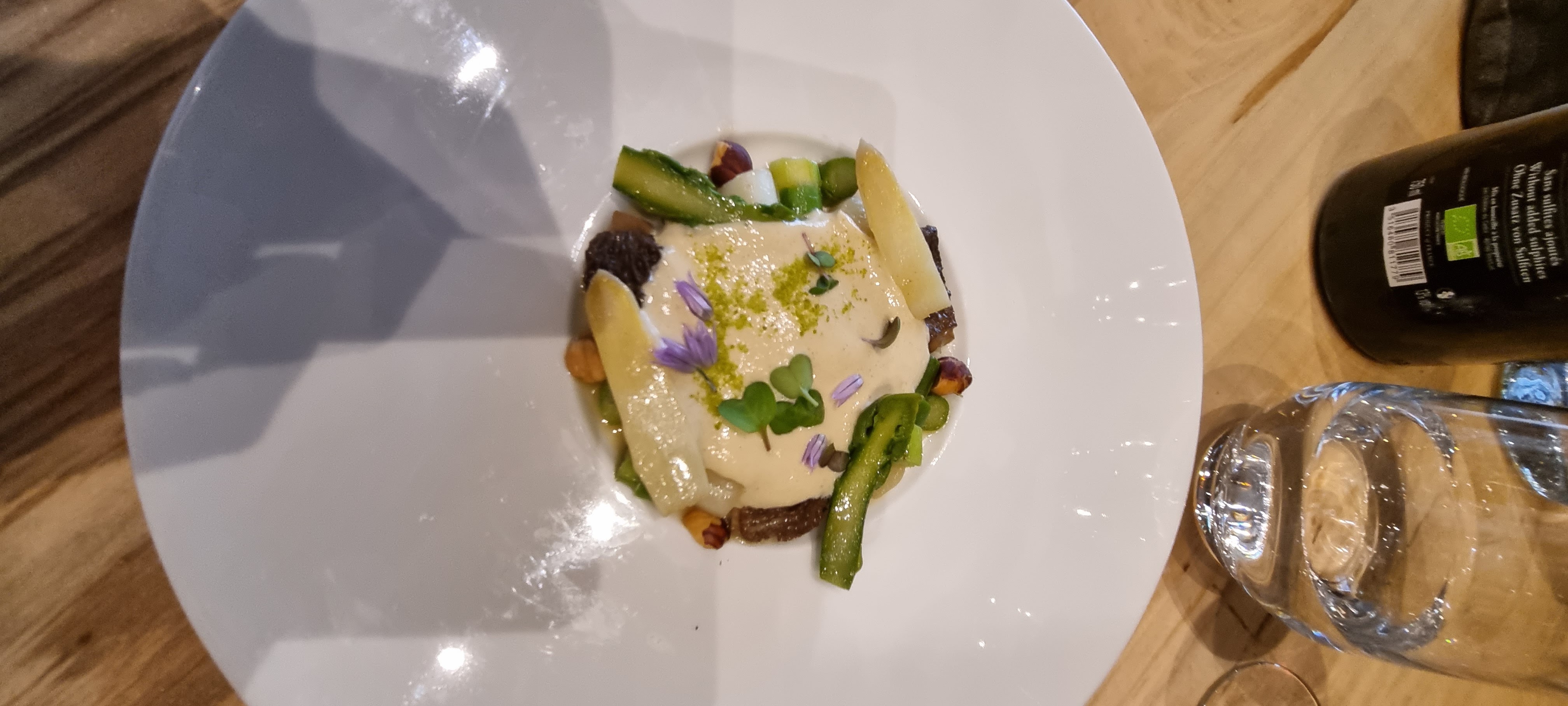 Veuillez noter que manger est un instantané dans le temps et que tout est très changeant. C'est aussi un avis subjectif. La délicatesse n'est pas de trop ici. Chaque plat est composé avec soin et beaucoup de créativité. Le service féminin était hostile. Le cadre n'est pas très cosy. Mais la nourriture est excellente et le vin aussi.