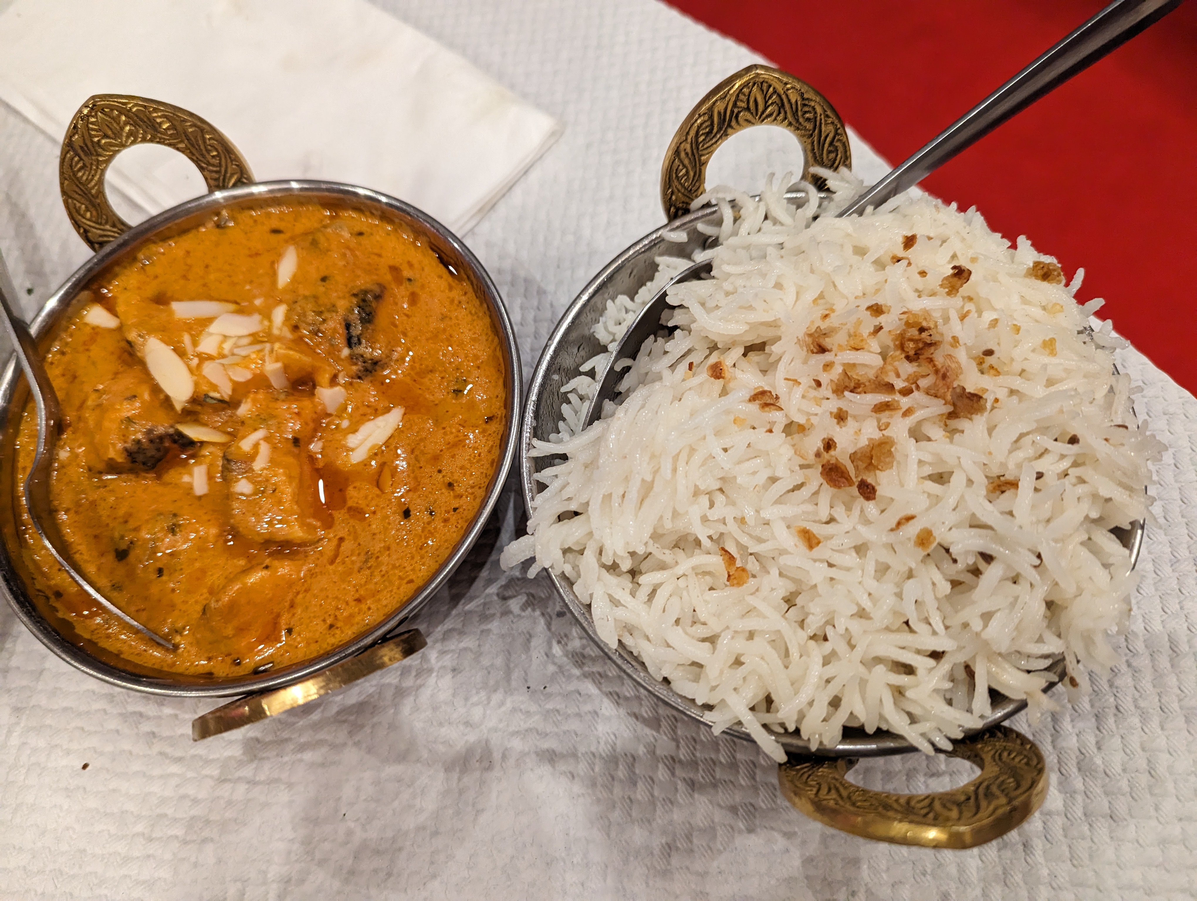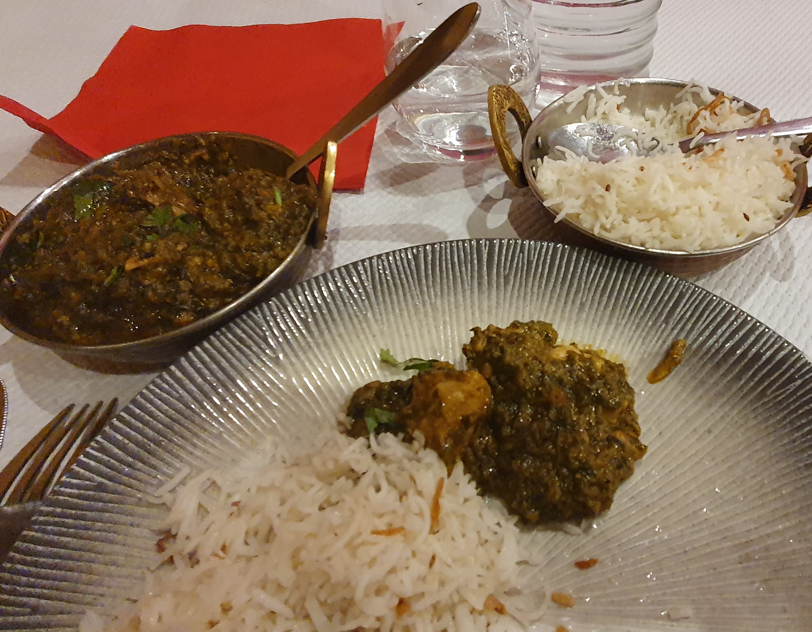 Petit restaurant. Service rapide même avec du monde et des commandes à emporter. Poulet Saag goûteux (mais un peu huileux à mon goût). Bonne portion. Authentique.