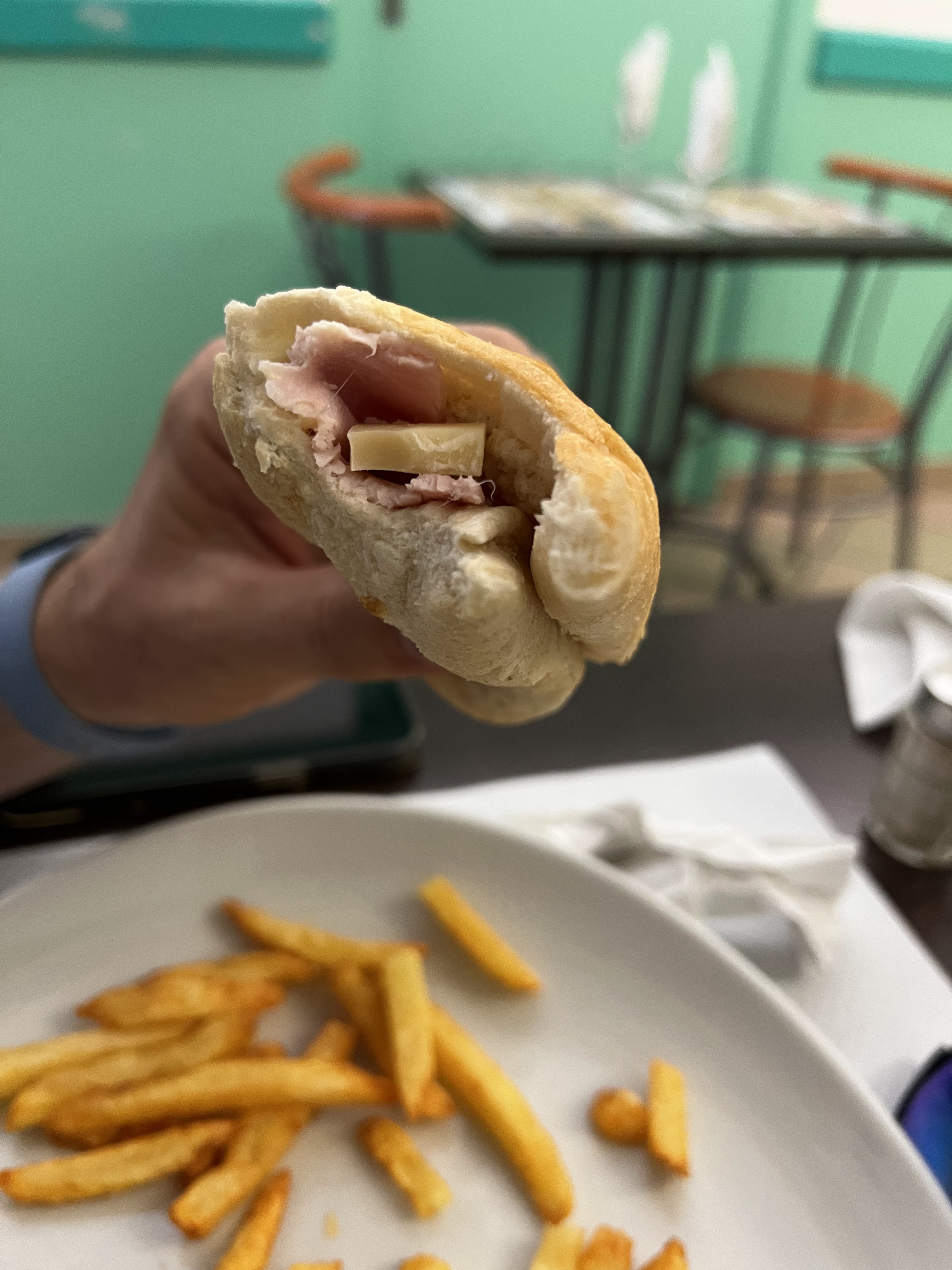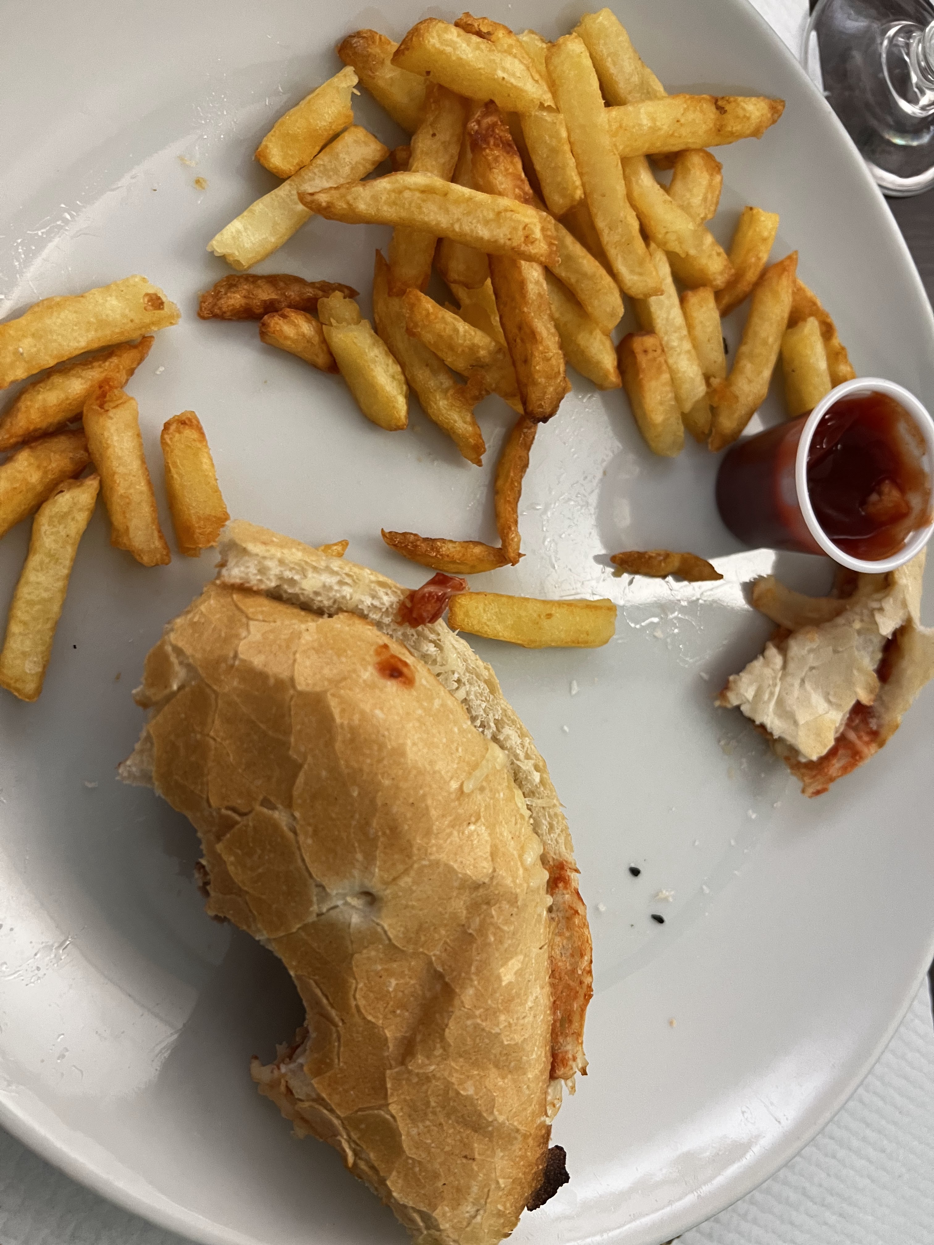 Pain sec donc rassis mergues toujours trop cuire et frites pas terrible