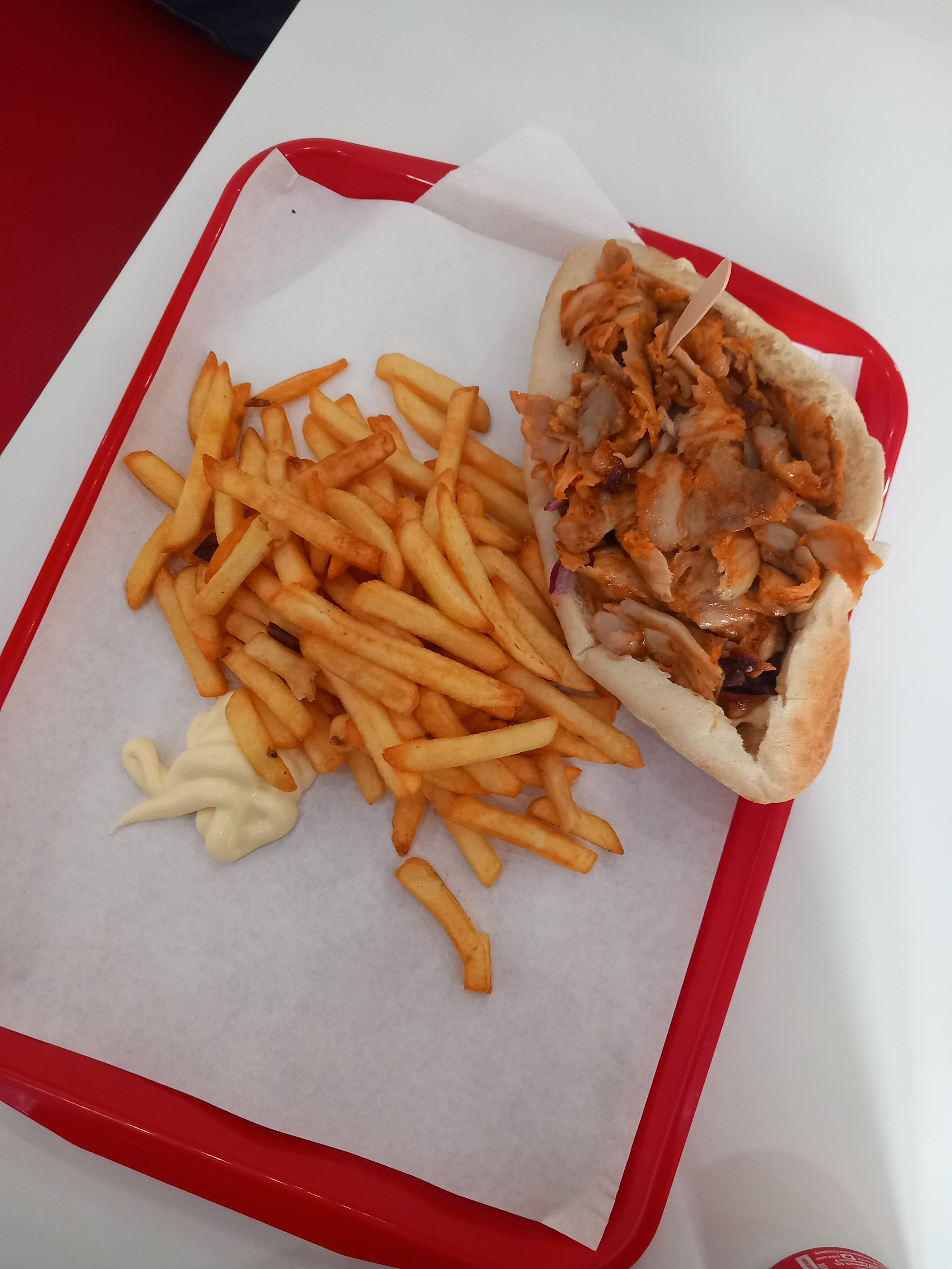 Personnel pas très bavard (sûrement parce qu'ils ne parlent pas bien français) mais hormis ça, endroit très propre et et viandes gyros et poulet d'excellente qualité ! L'occasion aussi de découvrir la sauce Algérienne légèrement épicée (un délice!). Par contre je regrette la sauce et les frites servies à même le plateau, question hygiène et présentation, pas très fan.. Sans quoi, si vous passez par là, n'hésitez pas !