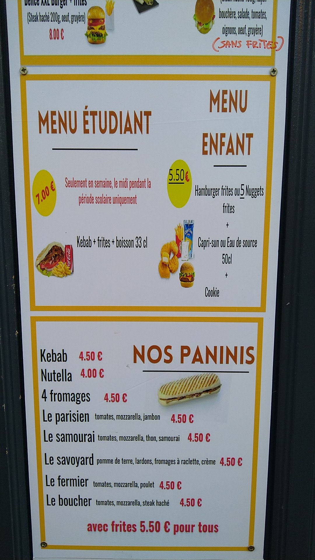 Cette sandwicherie ne mérite même pas une étoile, entre l'hygiène déplorable ( pas de lavage de mains ni pendant la pause clope ni après une manipulation d'argent), un repas mal cuisiné avec des frites servies directement depuis la friteuse limite, le mode de paiement non indiqué ( pas de cb) mais bien décrié sur un ton odieux, un patron qui parle aussi mal à la clientèle qu'à ses employés et surtout l'amabilité qui doit peut-être s'acheter... Si vous ne voulez pas faire ce métier où il faut être un minimum aimable ne le faîtes pas surtout! À fuire car il y a d'autres commerces où c'est moins cher et avec un personnel plus aimable.
