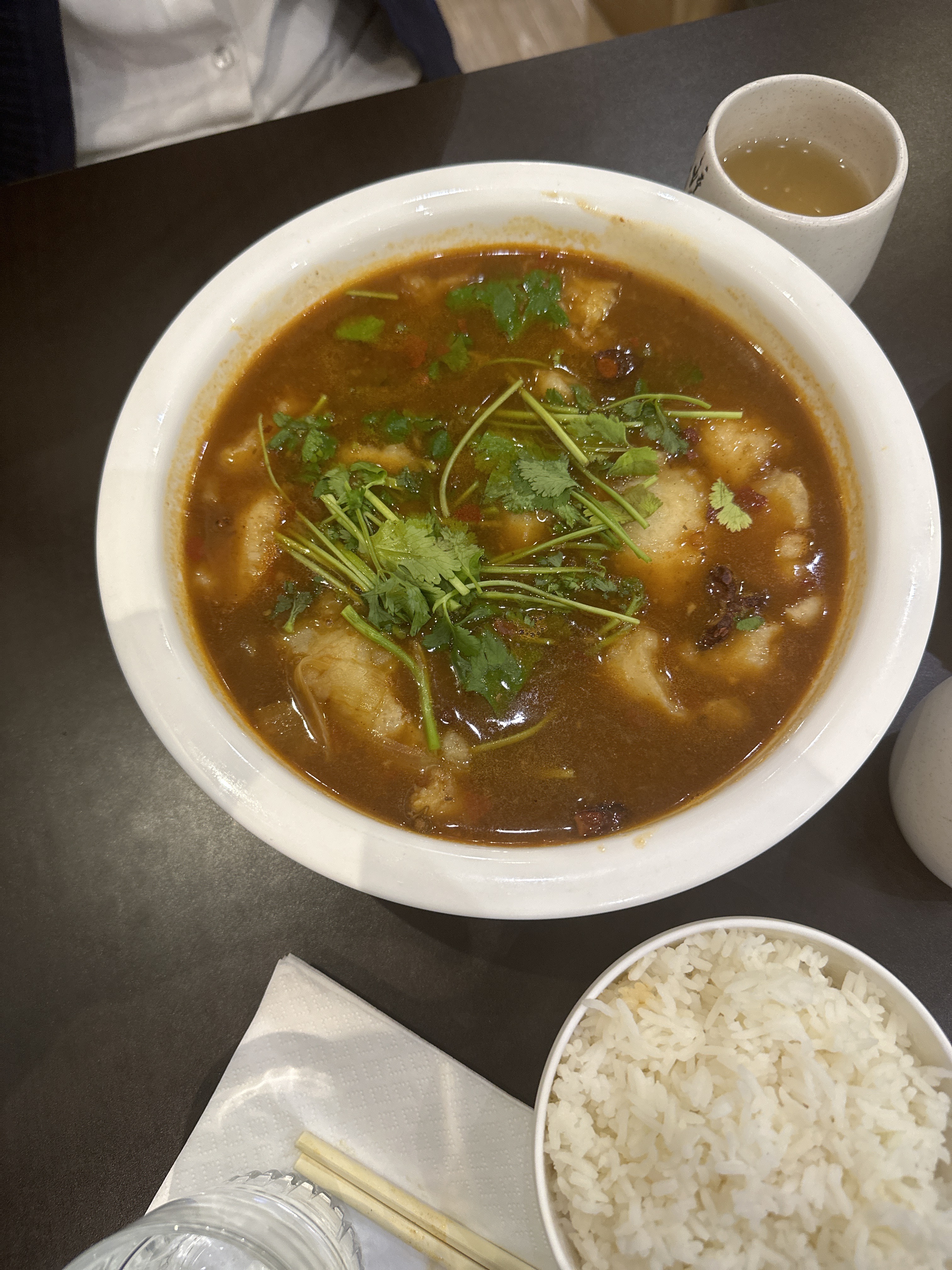 J'ai commandé du poisson bouilli, mais il ne me semblait pas très authentique et avait un goût moyen. Il devrait être amélioré selon les goûts locaux, car de nombreux étrangers venaient manger dans le magasin et la portion était plus que suffisante pour qu'une fille mange seule. A noter que le riz ici n'est pas calculé par portion mais par bol. Le riz coûte 2 euros le bol, ce qui n'est pas indiqué sur la carte. Le patron est originaire de Wenzhou, il est poli et a une bonne attitude.