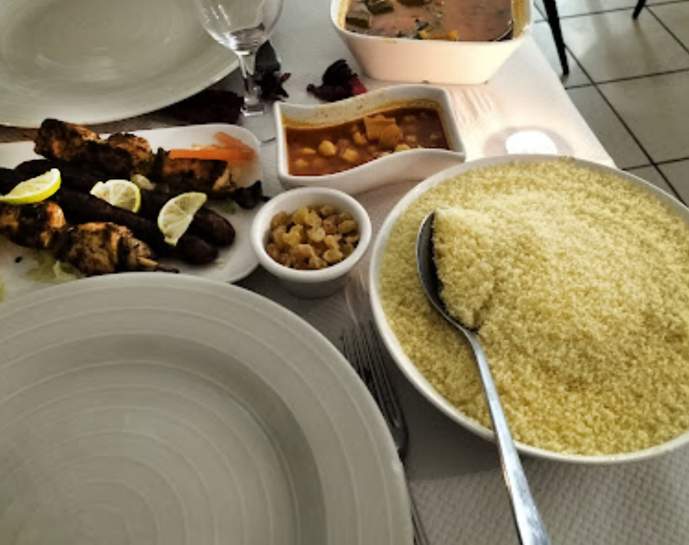 3* pour le service agréable sinon pas terrible. Pas de Chorba ni de soupe aux poivrons. On a commandé la chekchouka qui est une entrée à base d’oignons, poivrons et tomates. À la place on a eu des merguez coupés en morceaux dans une sauce tomate en boîte et un œuf sur le plat. Le couscous et les tajines étaient copieux mais ils manquaient de saveurs. Je ne recommande absolument pas…