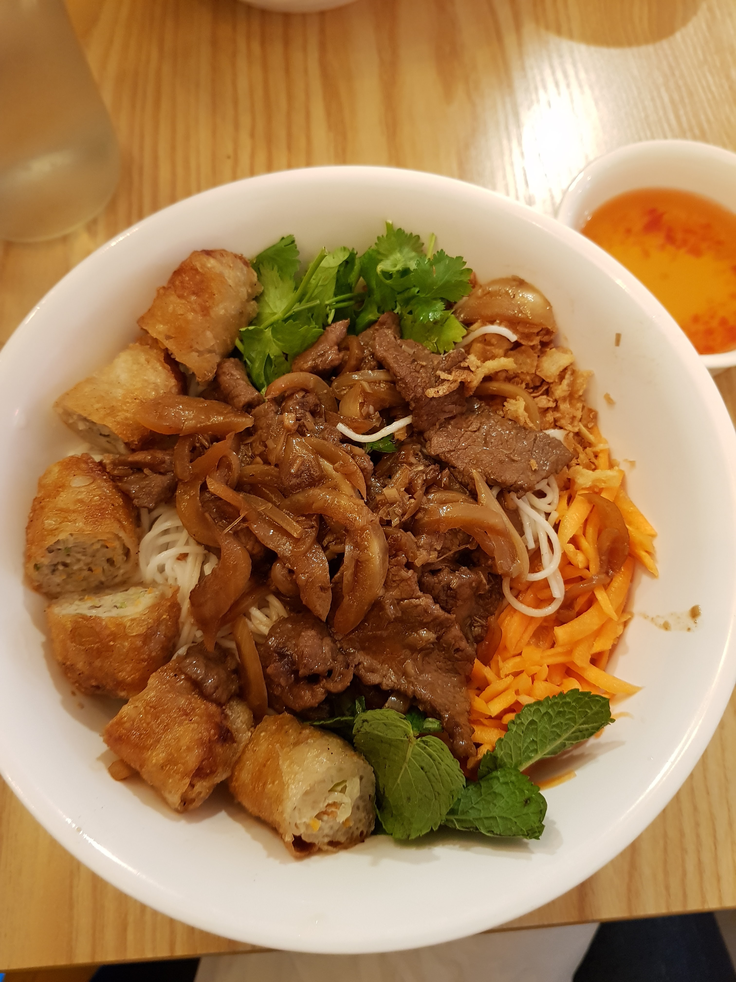 Nourriture plutôt bonne, le pho semble excellent (il dégageait une odeur exquise). La sauce pour le poulet croustillant est très sympa ! Le décor est charmant.