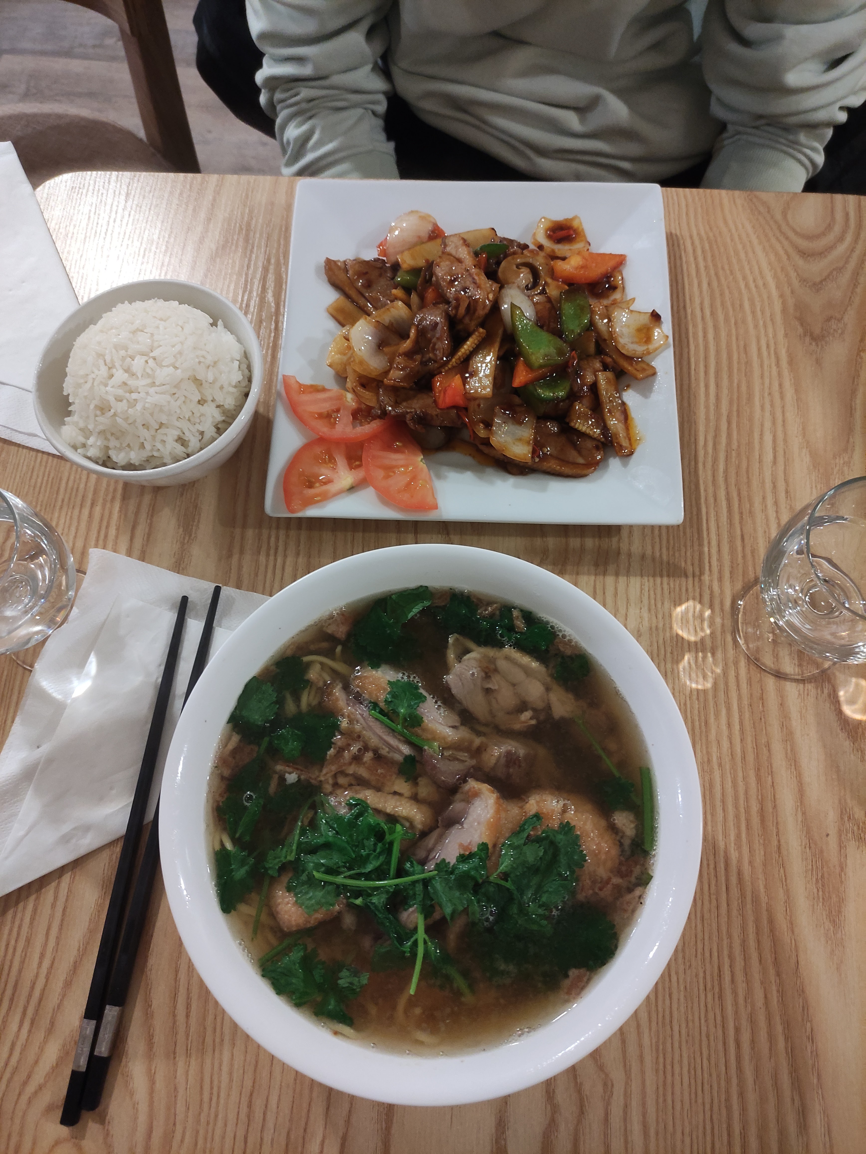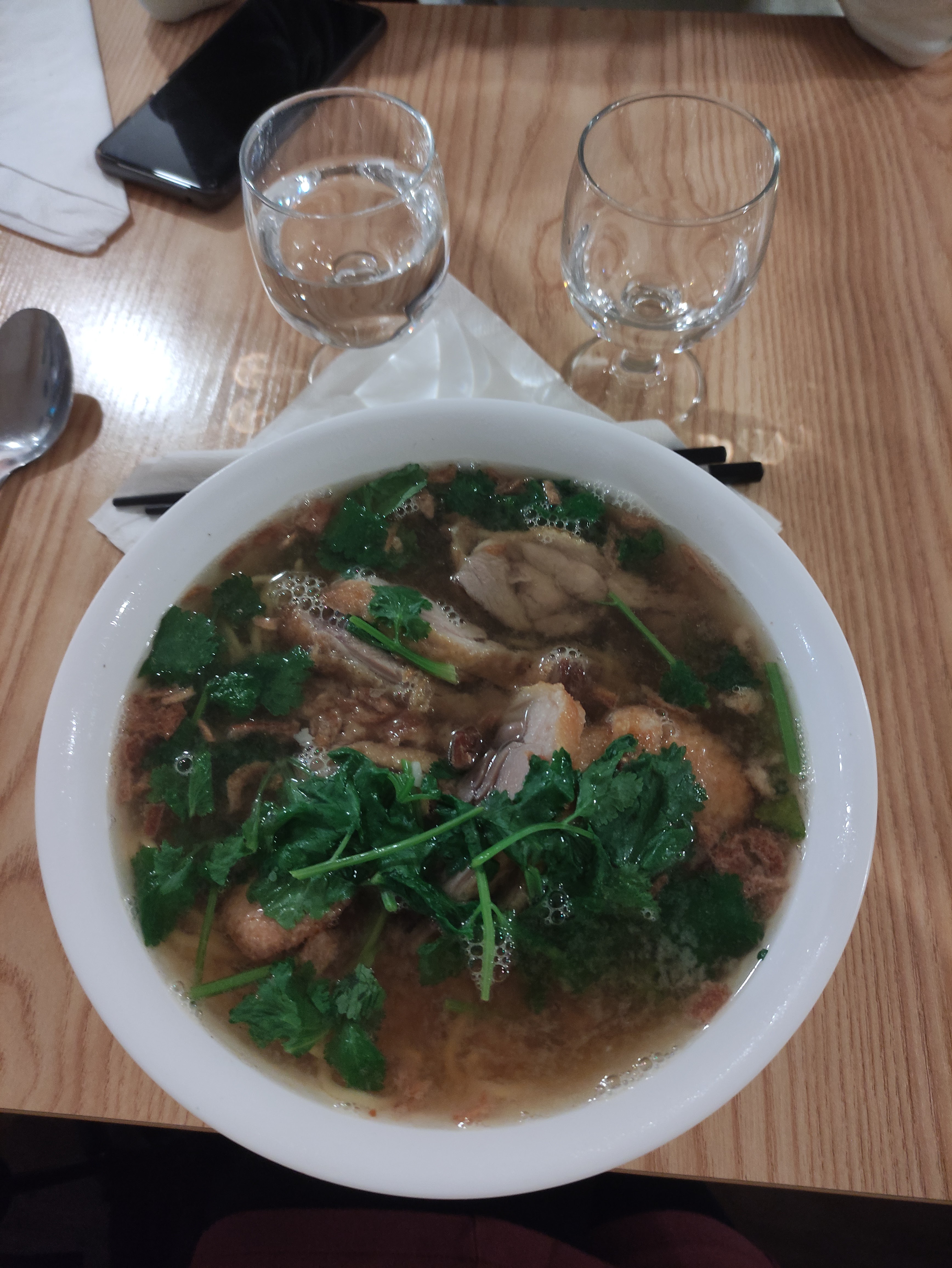 Les serveuses ont été agréable. Excellent potage au poulet citronnelle. J’étais moins fan de mon pho. Il n’y avait pas les nouilles et les accompagnements habituels qui me plaisent plus. Pas forcément le meilleur bouillon. Mais le reste de la table a apprécié le repas.