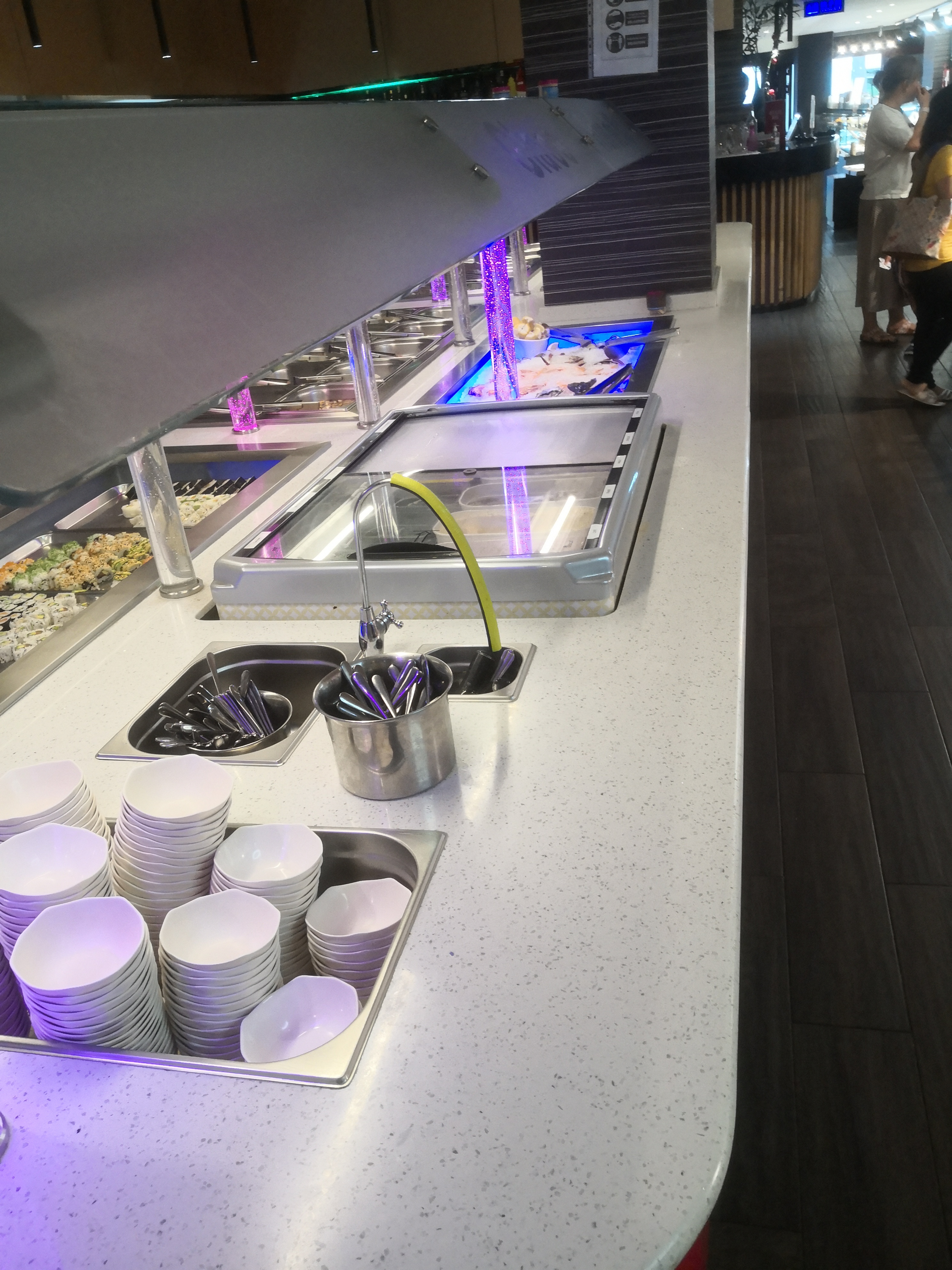 Endroit spacieux, personnel agréable et souriant, même si pressé car beaucoup de monde, je les salue. Choix varié et diversifié, aussi bien au niveau des sushis (préparés sur place, frais, devant nos yeux), des plats chauds que du wok, mais aussi des desserts. Cocktails préparés par la bermaid sont excellents et réalisés sur place également.