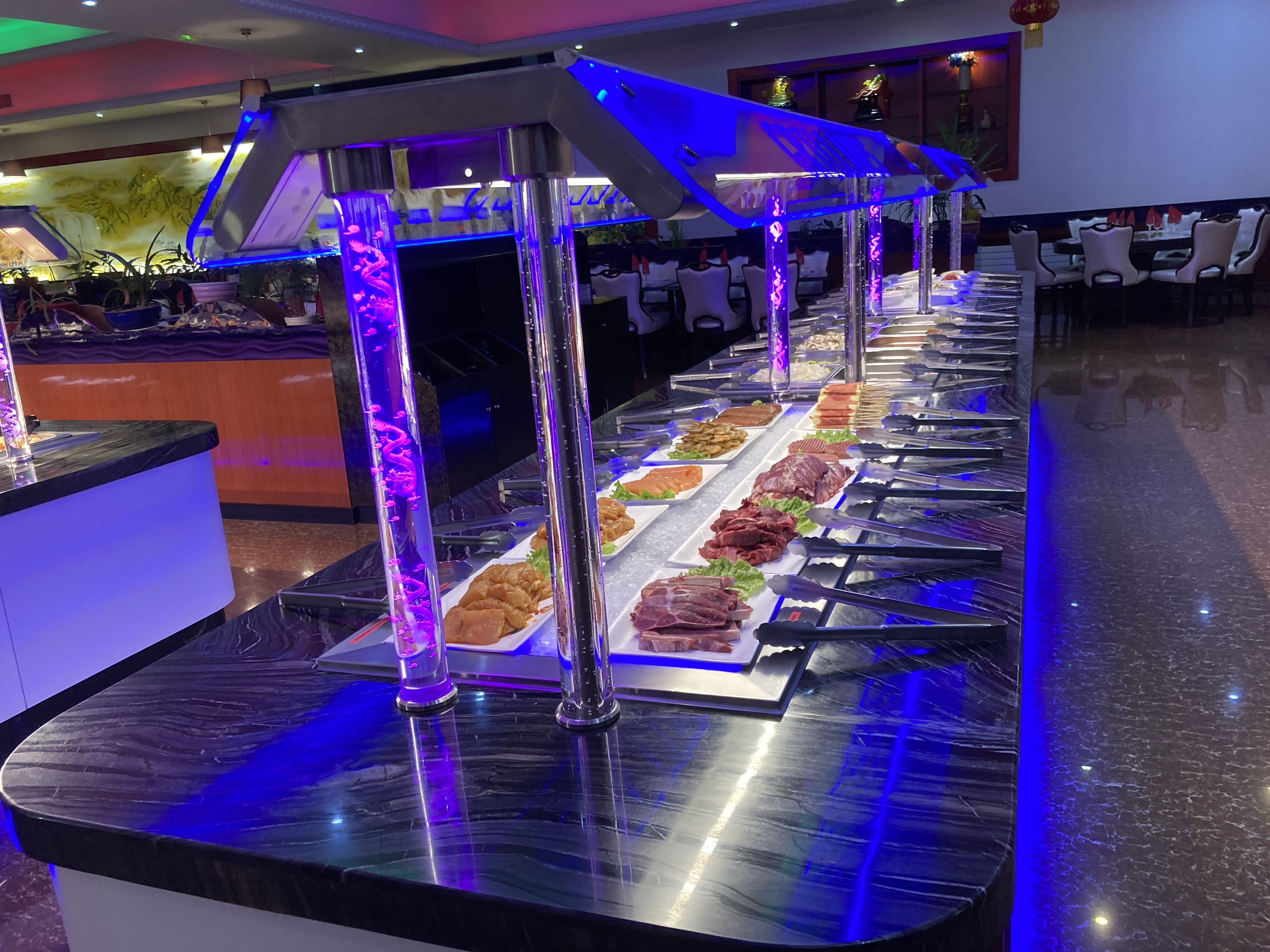 La cuisine est excellente avec une grande variété de choix, ce qui est un point positif, mais je soustrais des points pour le service. À plusieurs reprises pendant la soirée, le buffet n'a pas été réapprovisionné pour certains desserts et plats chauds, notamment la viande rouge au wok. Cependant, l'endroit est excellent avec une belle décoration intérieure, et les serveurs étaient très réactifs dès qu'on les appelait, ce qui est plaisant.