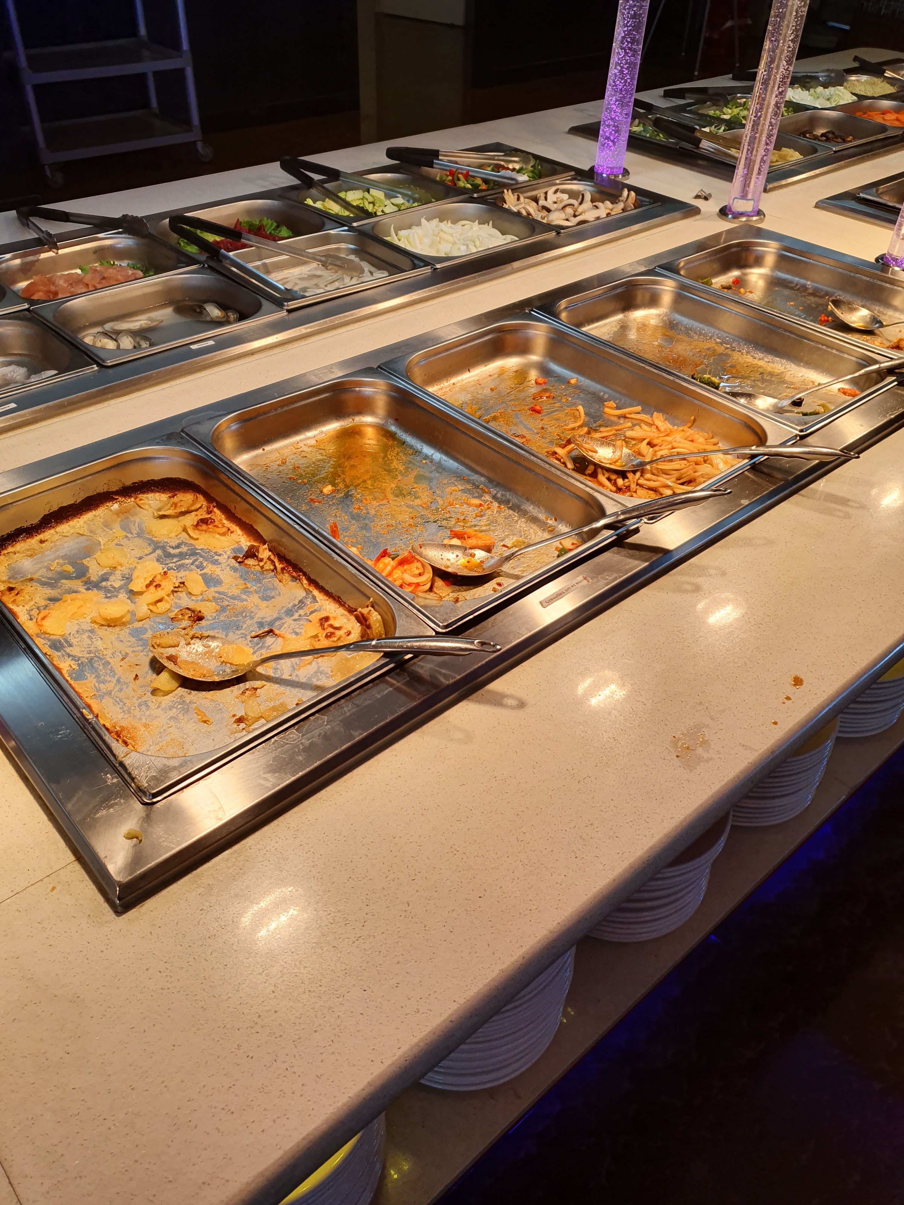 D'habitude je ne suis pas déçue, mais là, je suis arrivée après 21h certe un peu tard mais quand même, il restait très peu de nourriture, d'accord 21h il ferme à 22h30 je peux comprendre, mais la plupart des plats étaient froid ou croustillantes comme le riz ,. Et mon coktail à la place de glace pilée, c'était des glaçons, dommage. Et la vaisselle était grâce.. plus jamais après 21h.