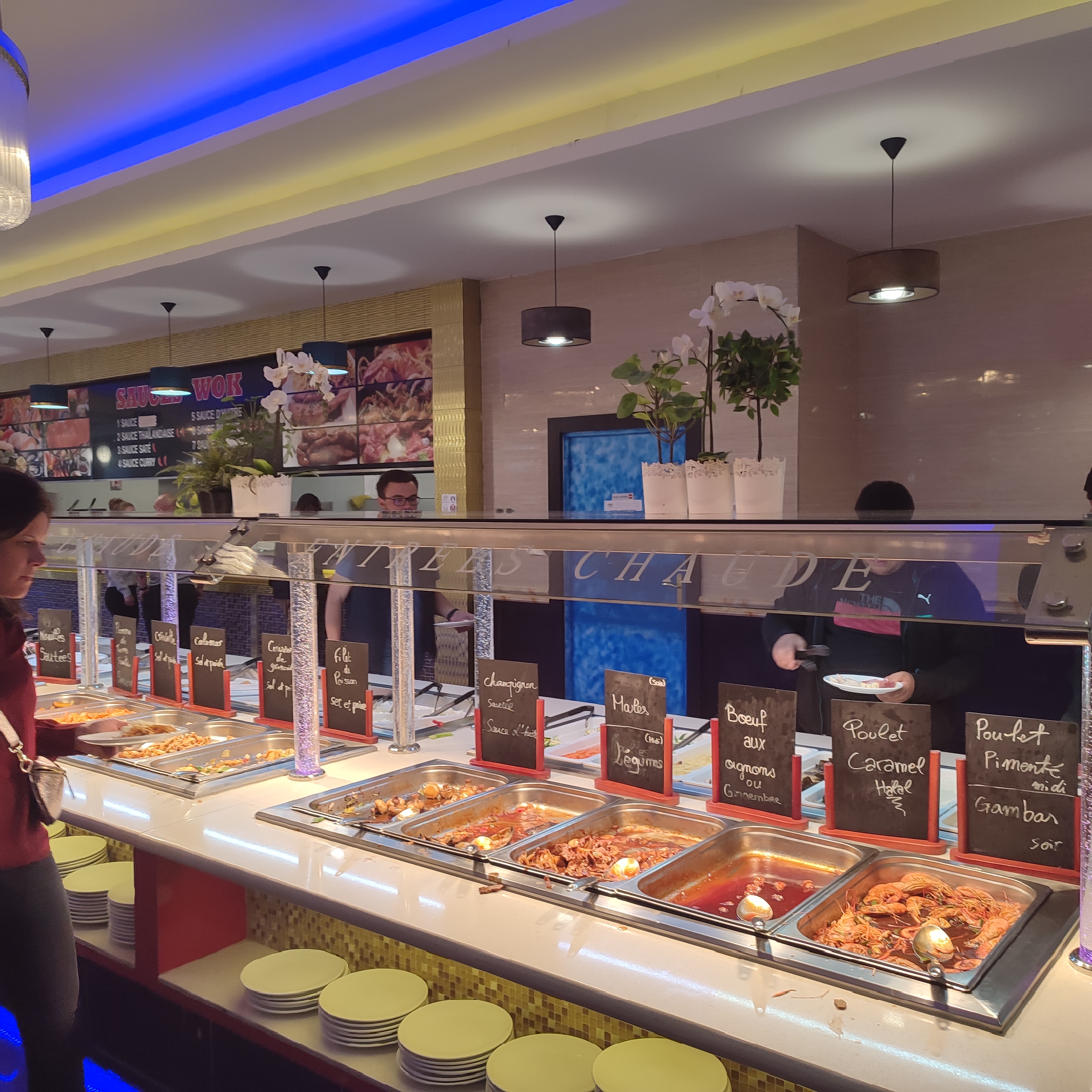 Il y a le wok mais pas les délices promis... Plein de produits à l'ouverture mais qui ne sont pas forcément complétés au fur et à mesure. Pour l'hygiène,.... Un enfant vomi à côté de nous... On le signale mais personne nettoie.... Le chef de salle prefere accueillir les nouveaux clients...
