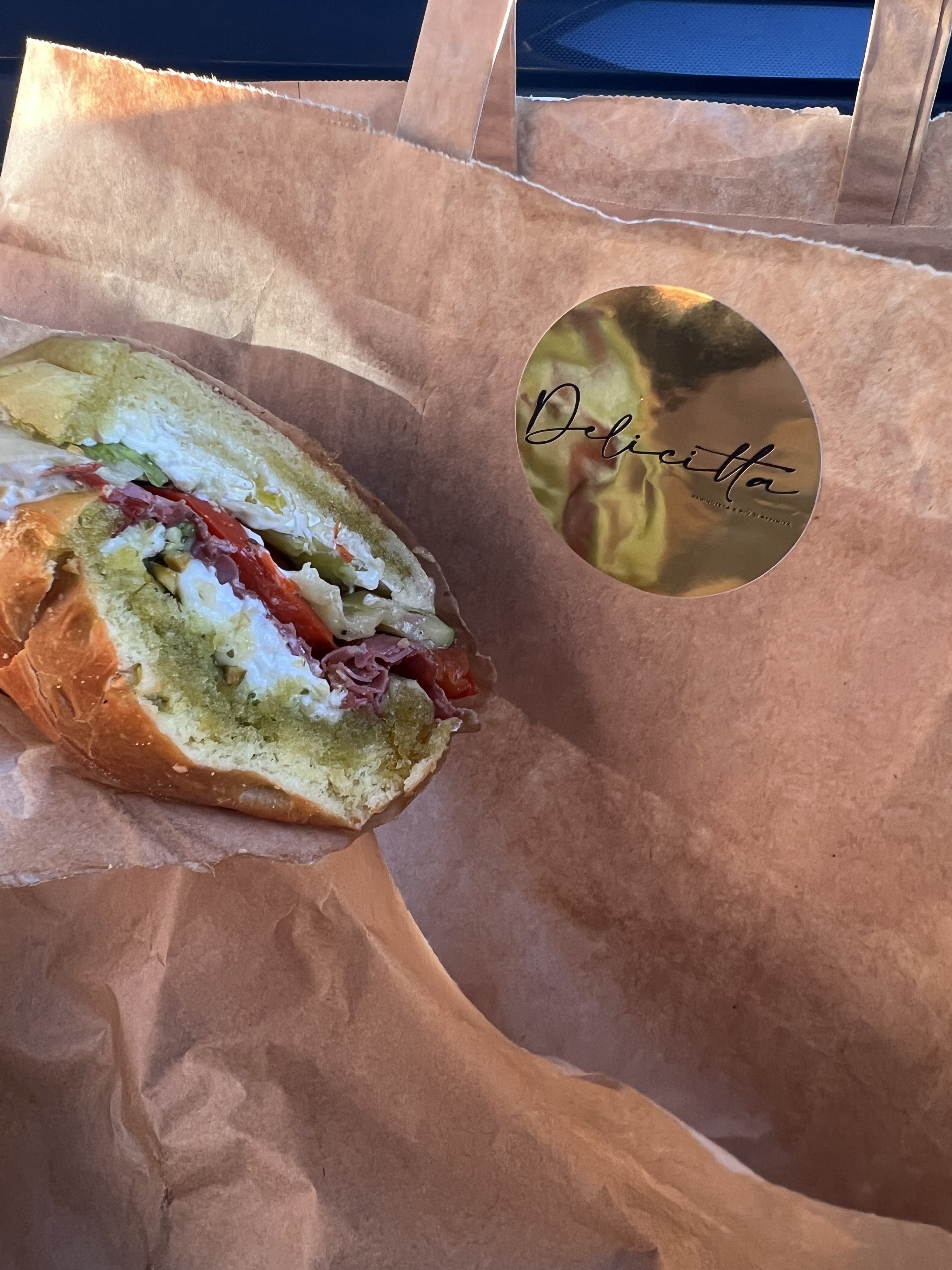 Nous nous sommes rendu au Delicitta ce samedi ! Nous avons mangé un MILANO et nous avons composé un second sandwich ! INCROYABLE sans compter la gentillesse du Monsieur ! Surtout n’oubliez pas de goûter le pain au nocciallata et à la pistache au dessert ! 10/10