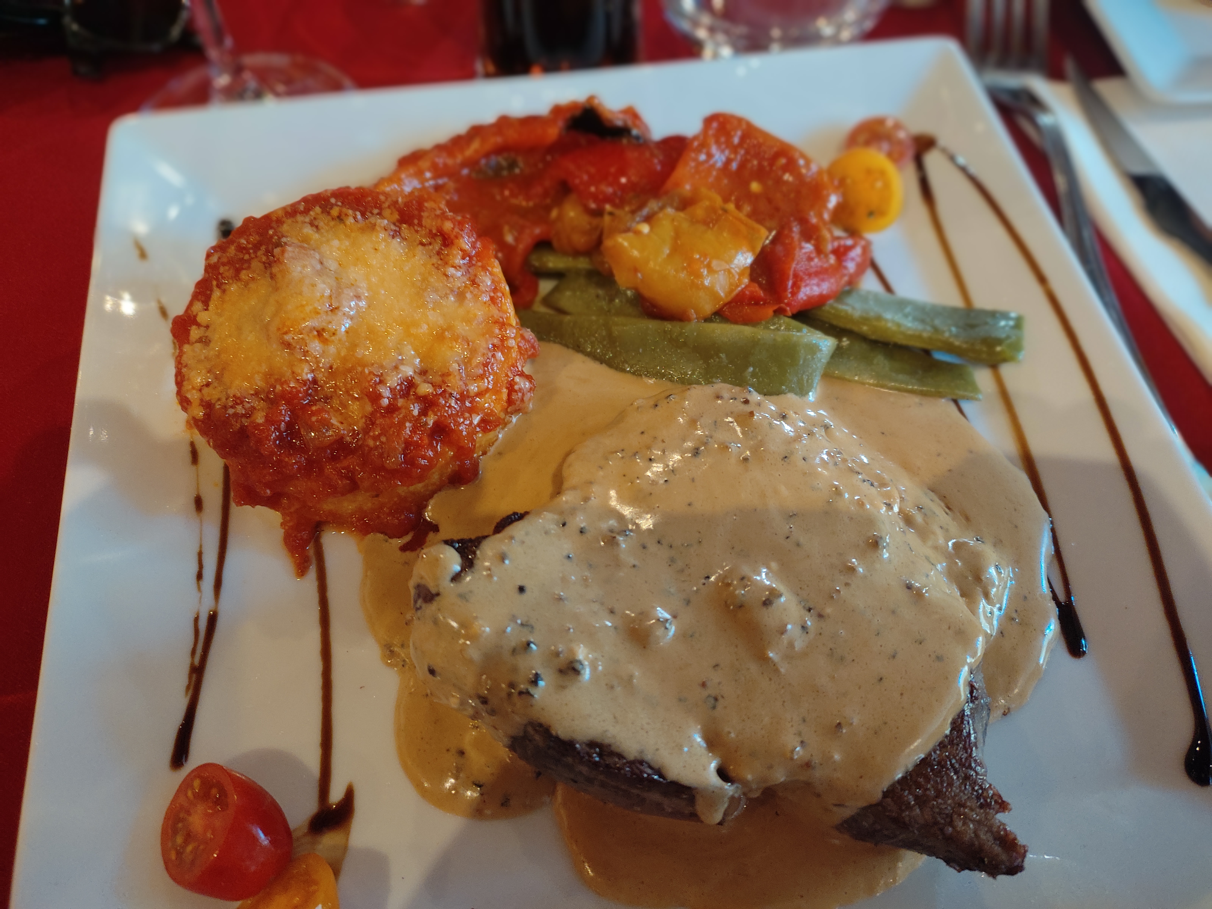 Bon restaurant, les plats sont copieux, mes deux fils auraient mis 5* (filet de bœuf et pâte aux palourdes) De mon côté l’escalope de veau panée était bonne, sans plus.Mais le service est excellent et l’ambiance sympathique ,avec une bande son adaptée , Ennio Moricone entre autre) Je recommande…