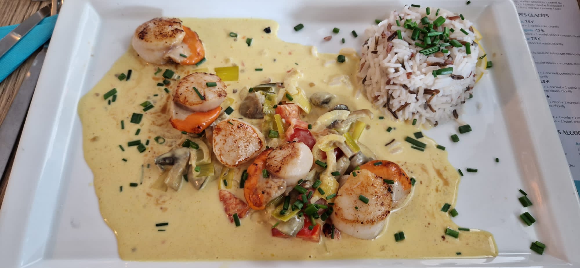 St Jacques aux poireaux, un délice. Entrecôte, parfaite. Pierrade, pizza verdi. Le service, sympathique et efficace. Belle ambiance, sous le soleil. Merci à eux.