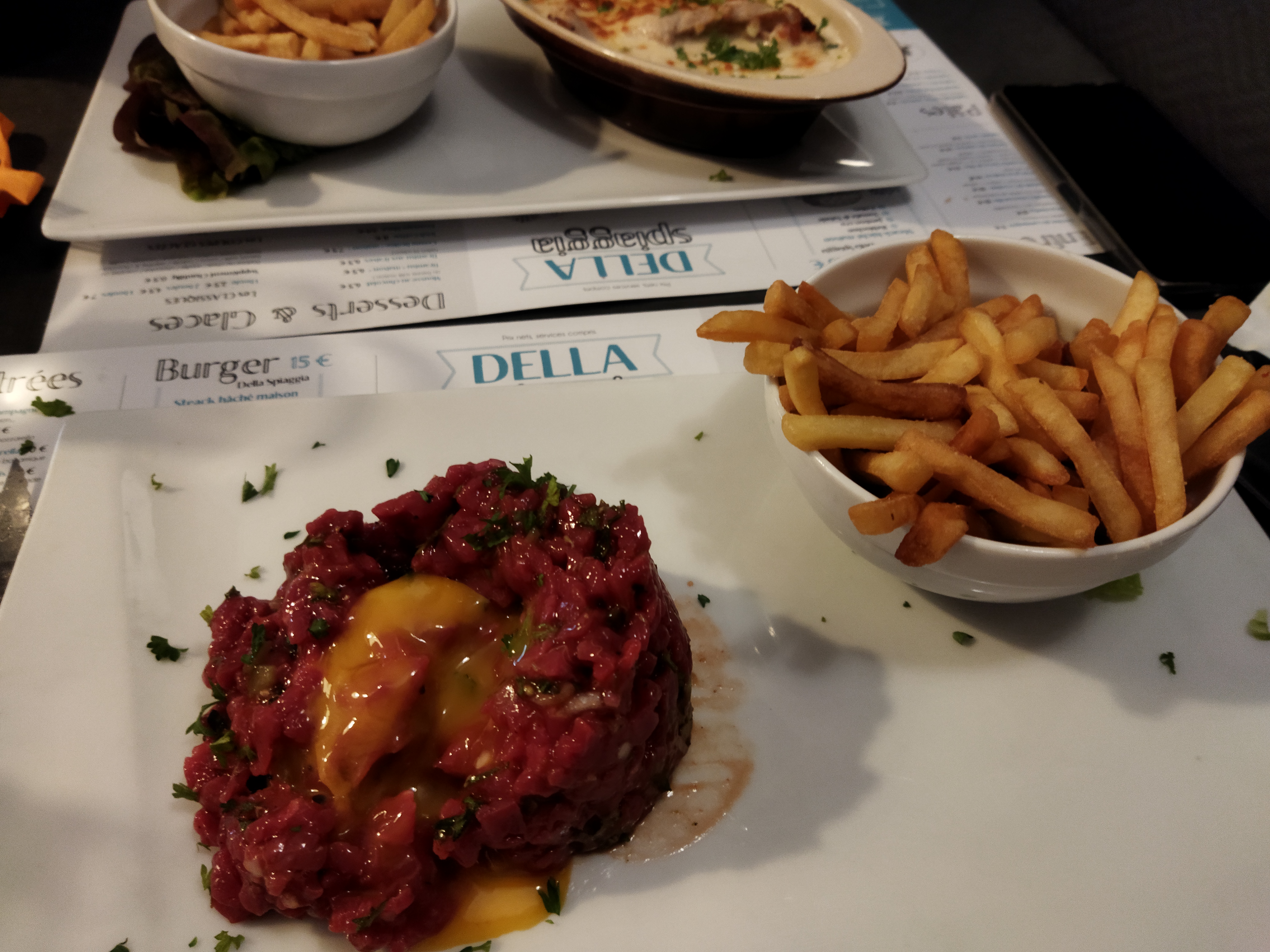 Serveur à l'écoute, bien que ne pouvant rien quant à l'emplacement de la table dans le courant d'air des portes. Jolie assiette terre et mer mais foie gras sans saveur et trop froid, frites non maison, tartare de boeuf au couteau avec goût de ketchup trop prononcé. Bof bof dans l'ensemble.