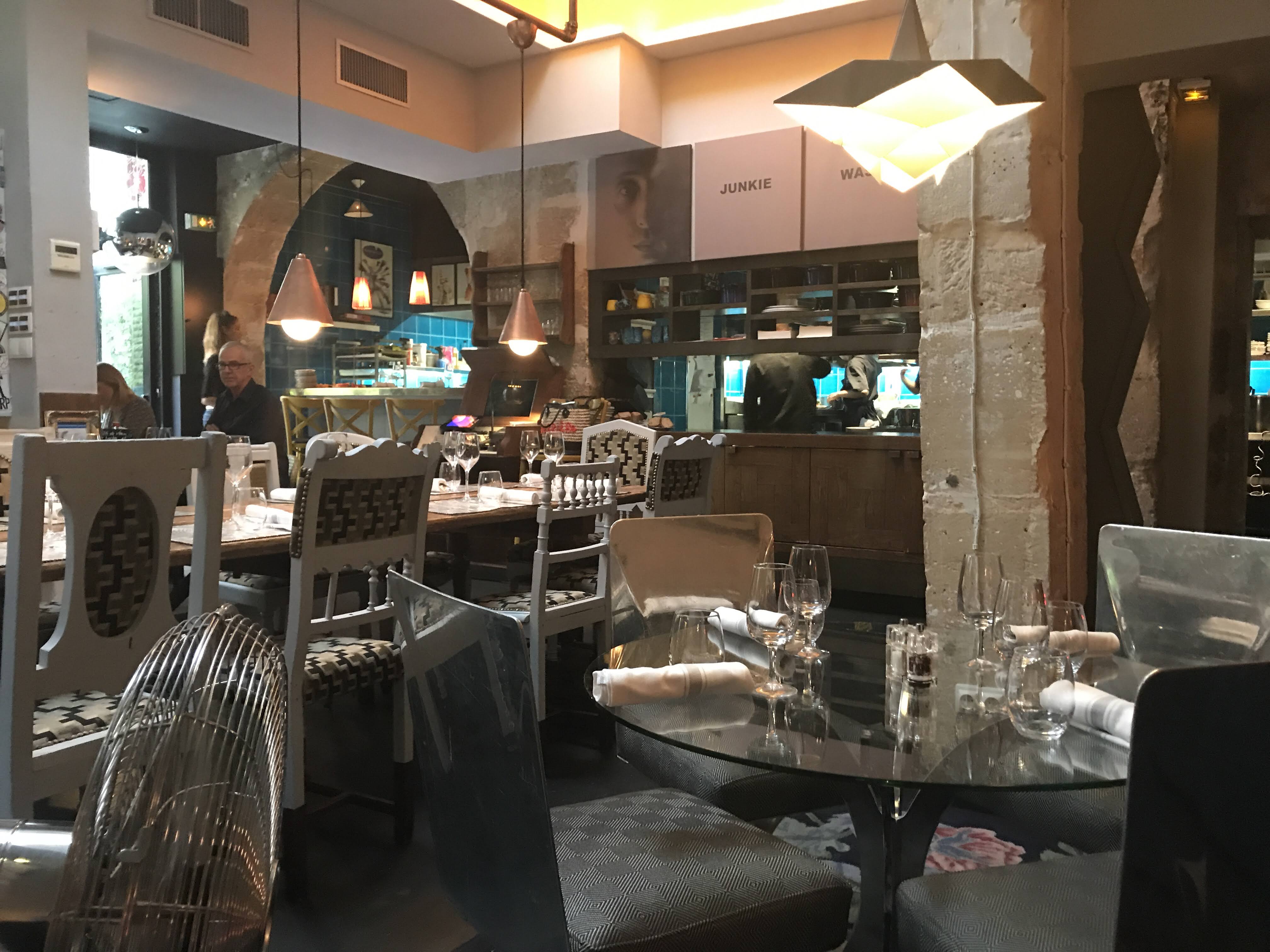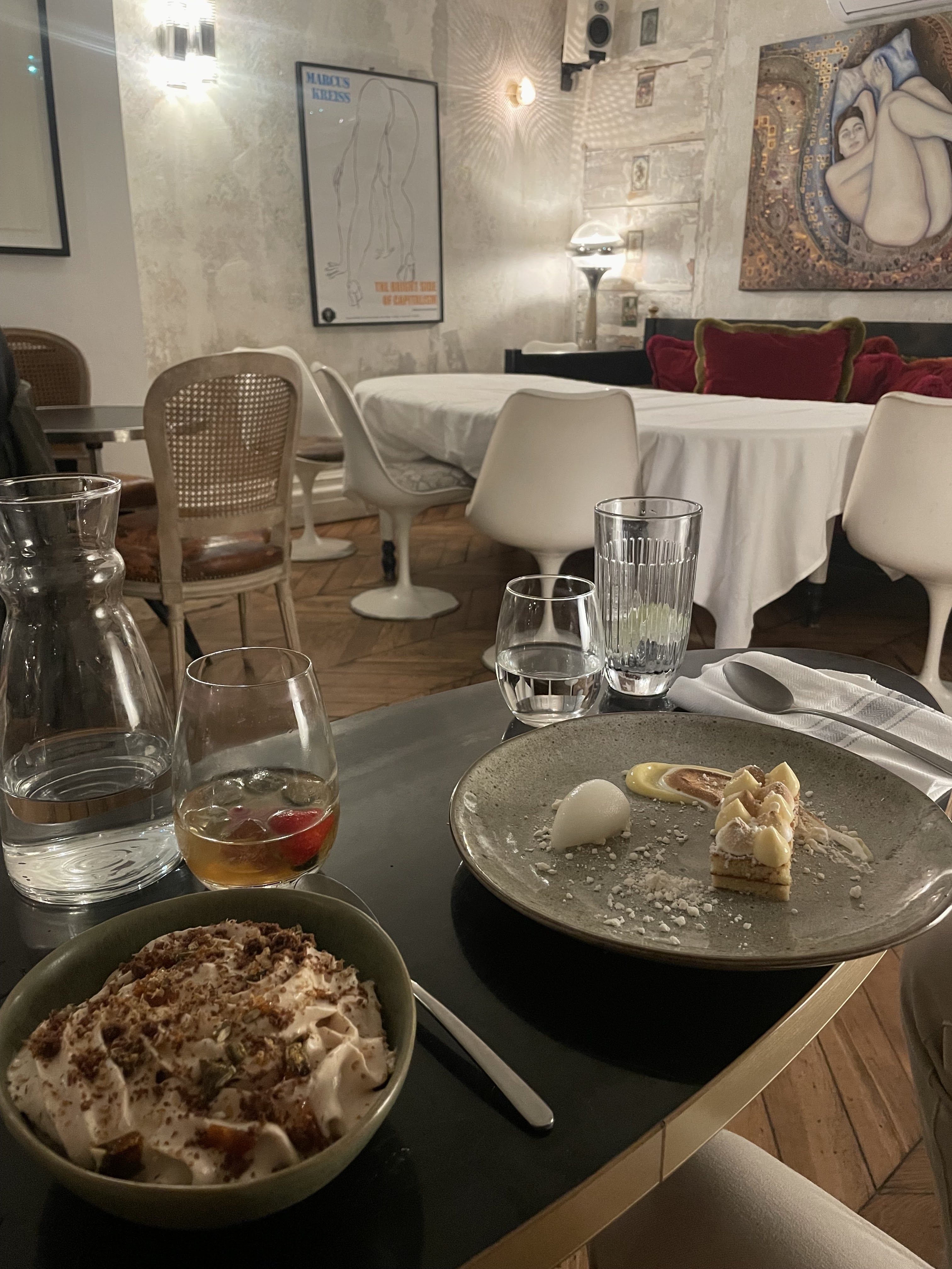 Une valeur sûre : je suis déjà venu 5 ou 6 fois, en semaine et le week-end, pour le dej et pour le dîner, et je n’ai jamais été déçu. C’est de la cuisine française traditionnelle élégamment réalisée, avec une petite pointe de modernité ici ou là mais sans dénaturer les plats. J’ai le souvenir que l’hiver dernier, par exemple, on s’était régalé d’une excellente blanquette. Hier soir nous avons chacun pris deux entrées et un dessert, et ainsi dîné froid. À notre menu : poireaux vinaigrette aux câpres pour moi, carotte rôtie pour madame, ceviche de bar (délicieusement assaisonné à l’orange) pour nous deux puis pavlova à la fraise et baba au rhum. J’adore le baba et celui-ci était très bien mouillé et servi avec une excellente chantilly et un carpaccio d’ananas. 120€ à deux avec boissons et cafés. Le service est toujours impeccable et c’est très agréable. Sinon la déco est très travaillée (en mode bohème / brocante) et elle fait souvent son petit effet. La salle peut être assez bruyante, surtout le soir quand il y a des américains (!). Il y a des petits salons à l’étage si on a un dej de travail. L’été la cours devient terrasse et est très agréable.