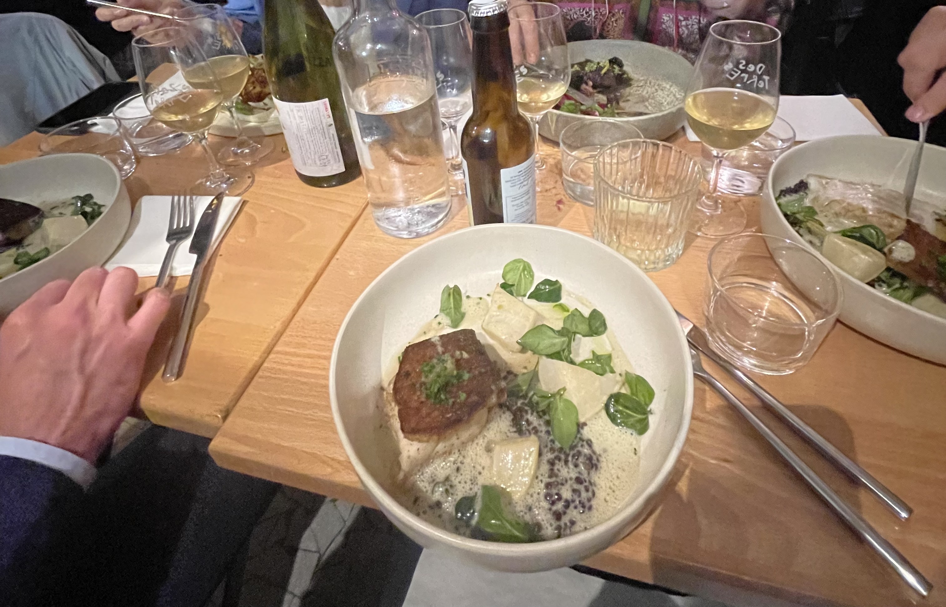 On est allés à ce joli restaurant pour un dîner d’affaire avec nos clients : oui l’ambiance était pas trop bruyante mais assez joyeuse ! On a commandé quelques entrées et chacun son plat : ce jour là, on avait 1) chou fleur rôti (végétalien) 2) cabillaud en peau de pain 3) bourguignon de bœuf au tahini J’ai commandé le cabillaud parmi ces trois là. Plutôt content de la sauce bien aromatisée mais pas trop graisseuse, qui marchait bien avec d’une peau de pain en mie croustillante. En étant un étranger qui n’est pas habituée au goût de la gastronomie française, je le recommande vivement à d’autres qui viennent d’arriver comme moi ! *Il faut juste pas oublier, on paie bien le prix parisien au restaurant sur Paris.