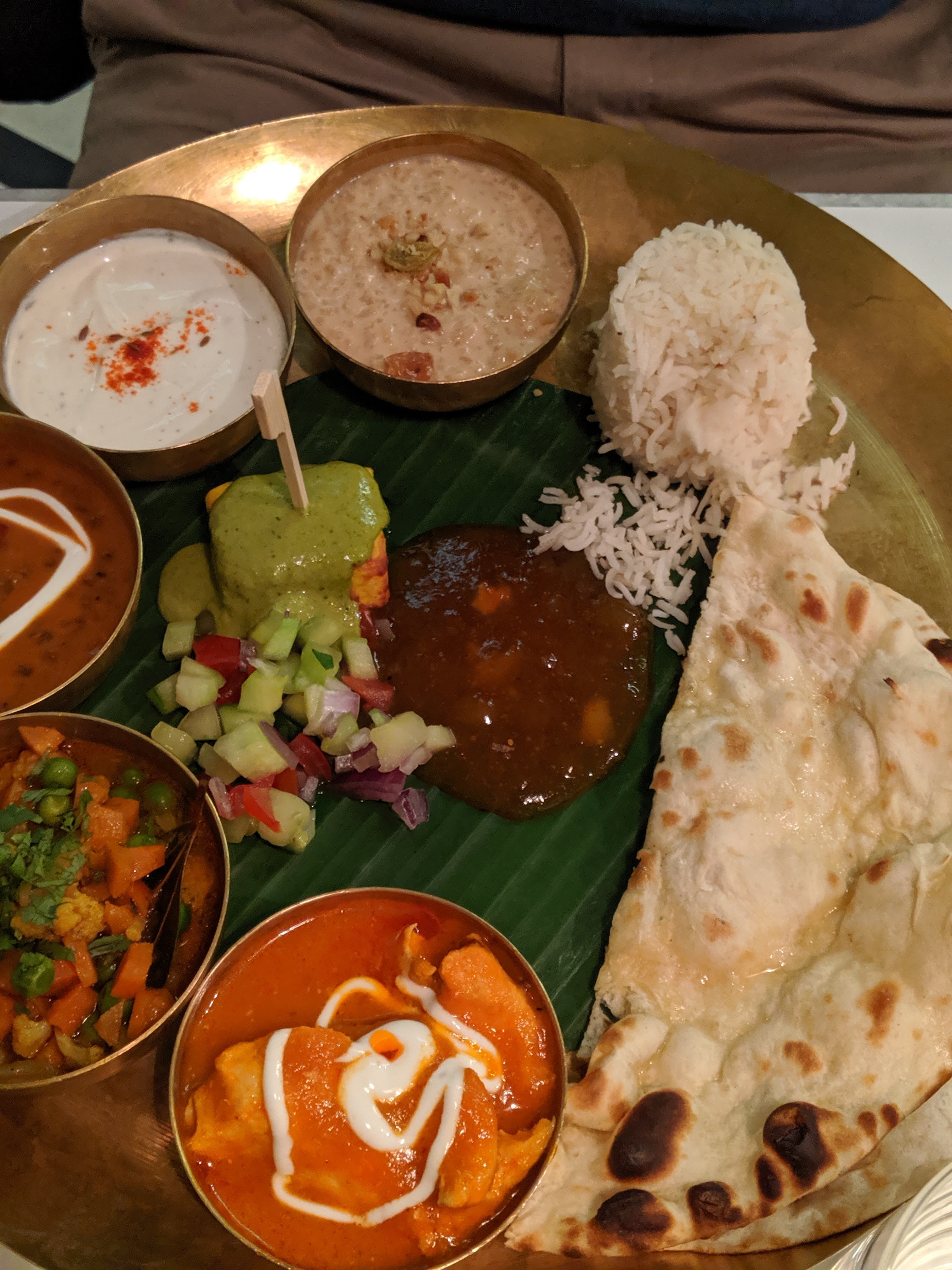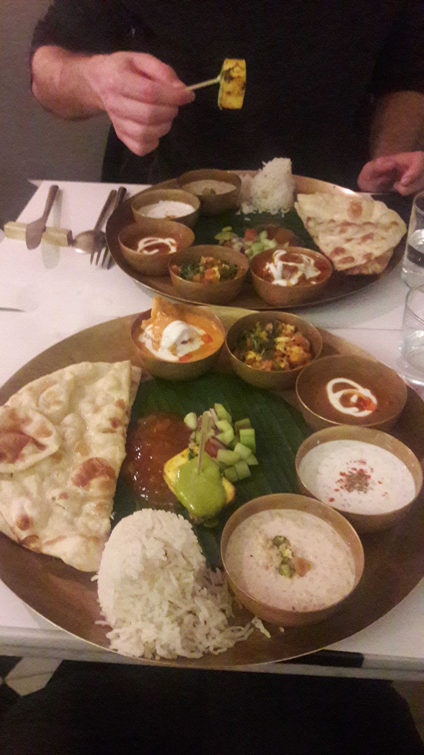 Service un peu froid, prise de commande rapide. Pas trop le choix en plat à moins de 27€, car ils proposent essentiellement des plateaux qu’ils appellent Thali, ou l’on trouve plusieurs petits bols, nous avons gouté celui à l’agneau et celui au poulet. Les nans sont en supplément, ce qui peut faire monter l’addition très vite, compter 40€ par personne environ avec la boisson… pas donné pour un resto indien. Un bon mais pas sure que j’y retournerai.