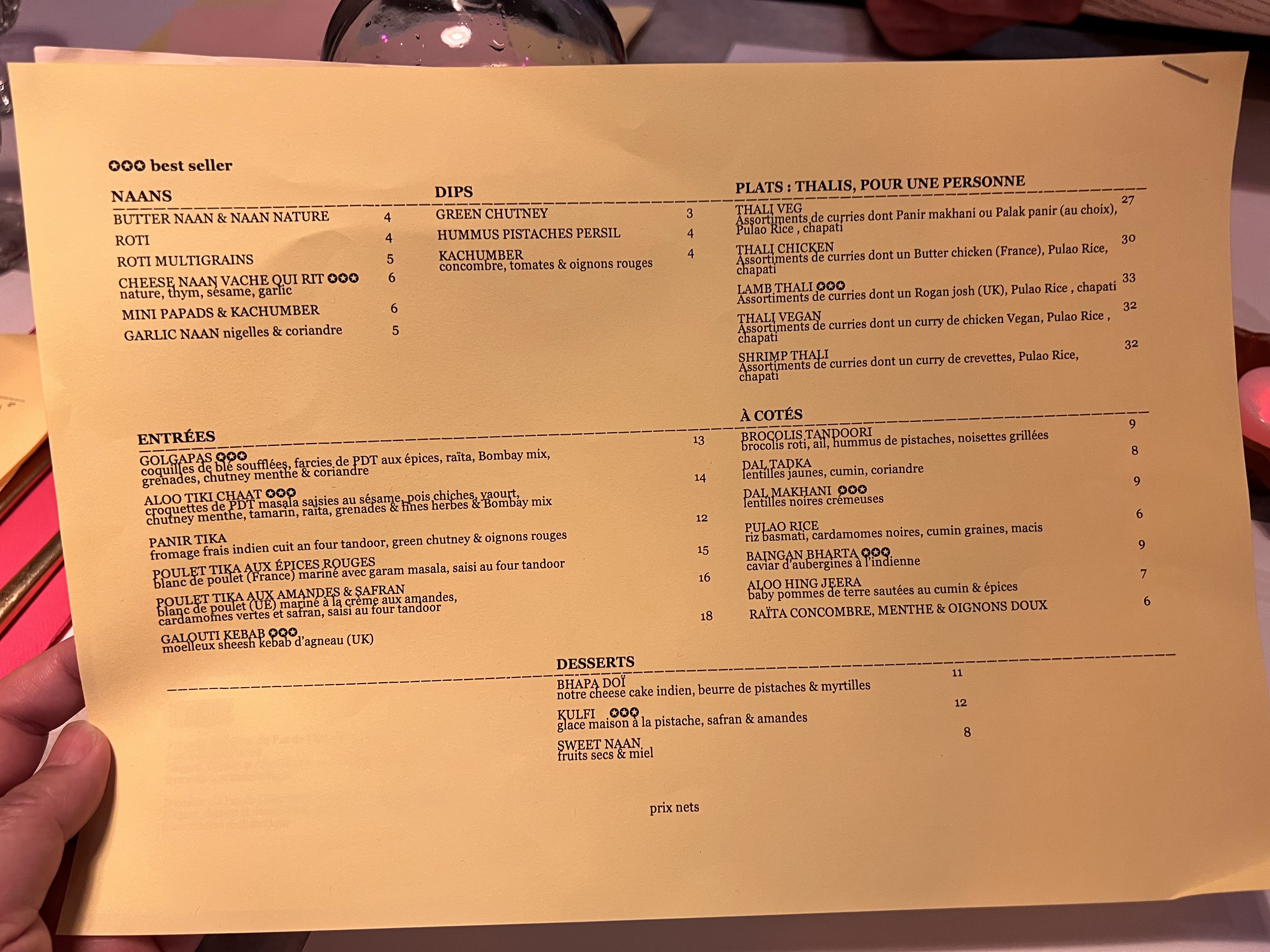 Malheureusement, l'addition est incroyable... 100€ pour un dîner indien assez basique... Du jamais vu à Paris !