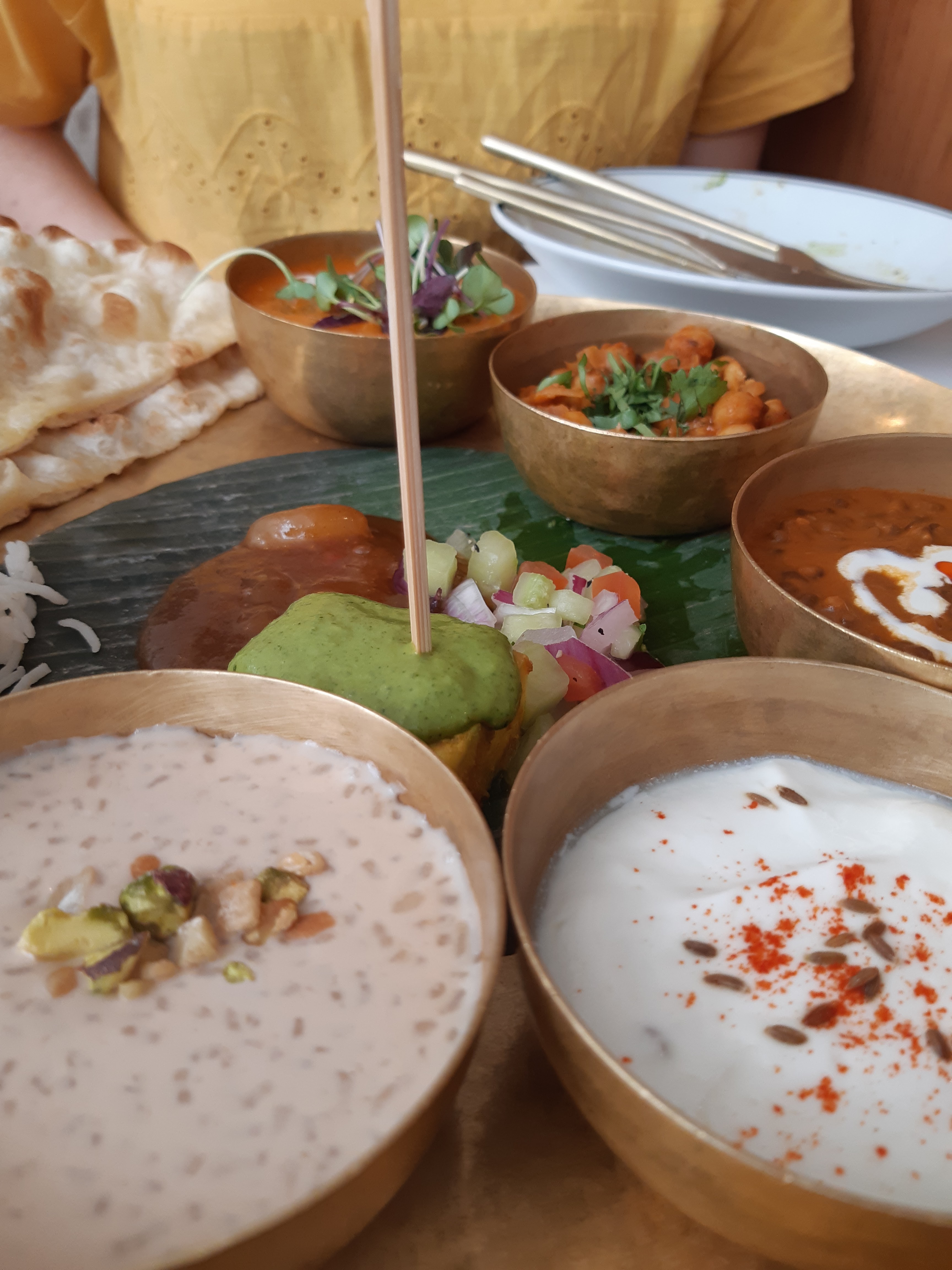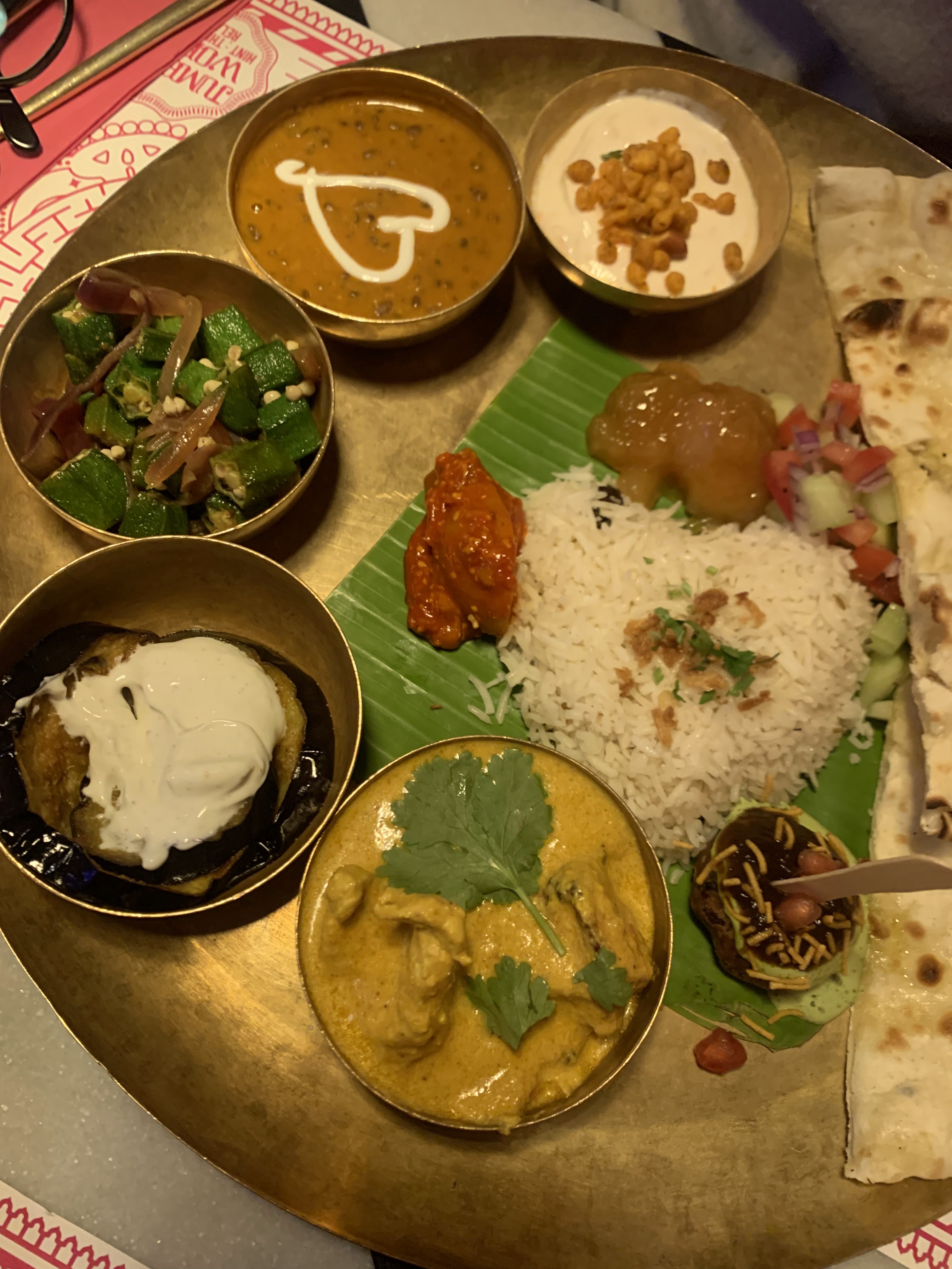 Bien que cher si on y réfléchit, un Thali coûte entre 24 et 34 € ! Vous êtes bien nourri, avec des plats délicieux. Je dirais du Lamb Thali, le naan est léger et facile à manger. Ce n'est vraiment pas comme le type épais qui vous remplit de glucides et qui est médiocre, il est léger et peut contenir de la nourriture dessus. L'agneau lui-même, j'ai trouvé la viande bonne, mais la sauce est vraiment gagnante. Je l'ai récupéré avec mon naan, je l'ai bu avec ma cuillère, c'était vraiment incroyable. Ensuite, il y avait le plat de ragoût de type chou-fleur et pois. assez léger, aqueux et meh. Pas de déjeuner de saveur ici. Le daal, incroyable. Délicieux avec le riz, le naan ou seul. Vraiment génial. Je l'aurais volontiers comme plat à lui seul. Le panoramique était bon, ni mauvais ni étonnant. La sauce verte était délicieuse mais la sauce pétillante et collante n'était pas géniale pour moi... Quelque chose me rappelle le coca cola (que je n'aime pas) Puis le yaourt, crémeux, léger et aérien avec une touche d'épices. Et le dessert, un riz au lait crémeux que je pourrais aussi bien avoir comme plat à part entière.