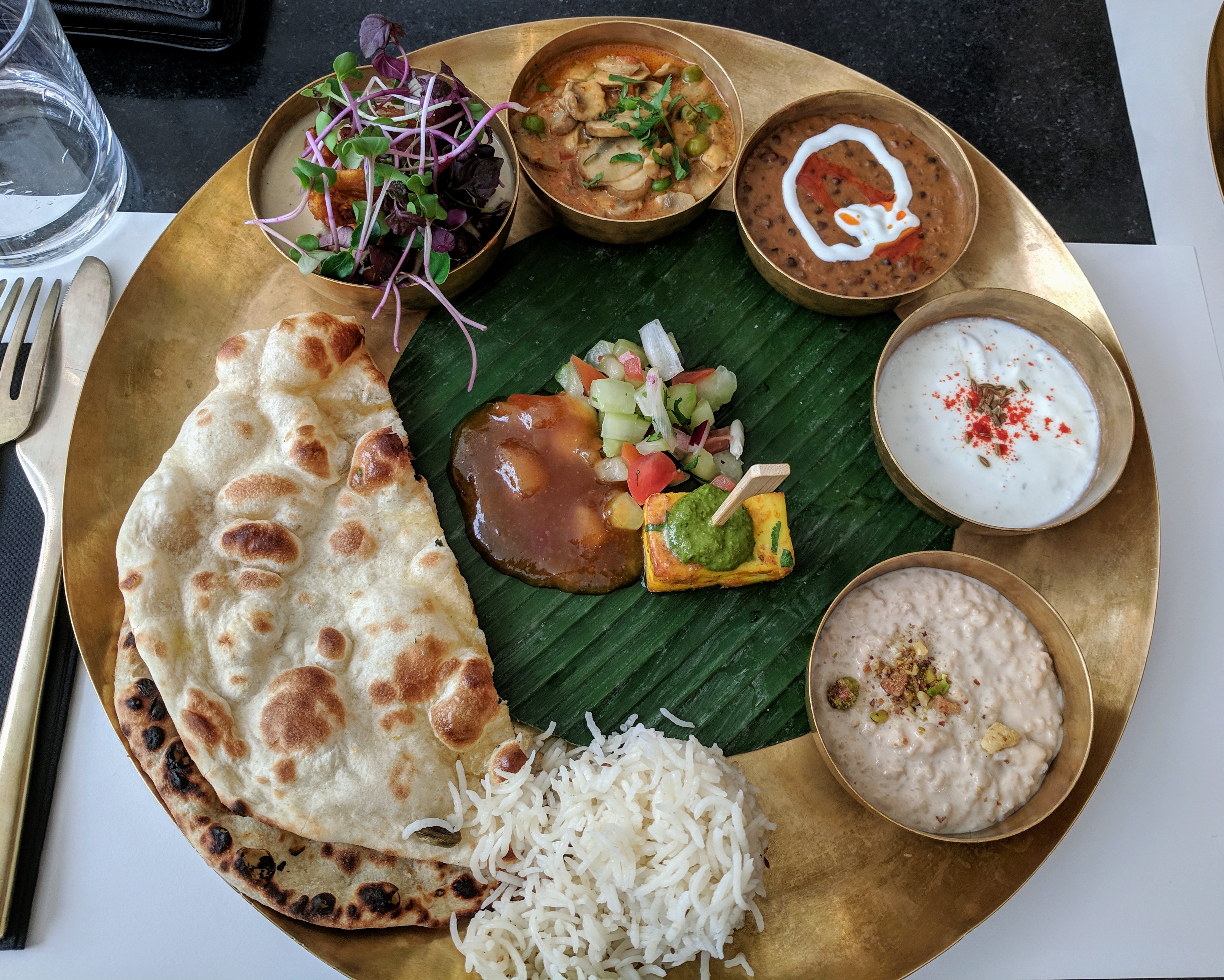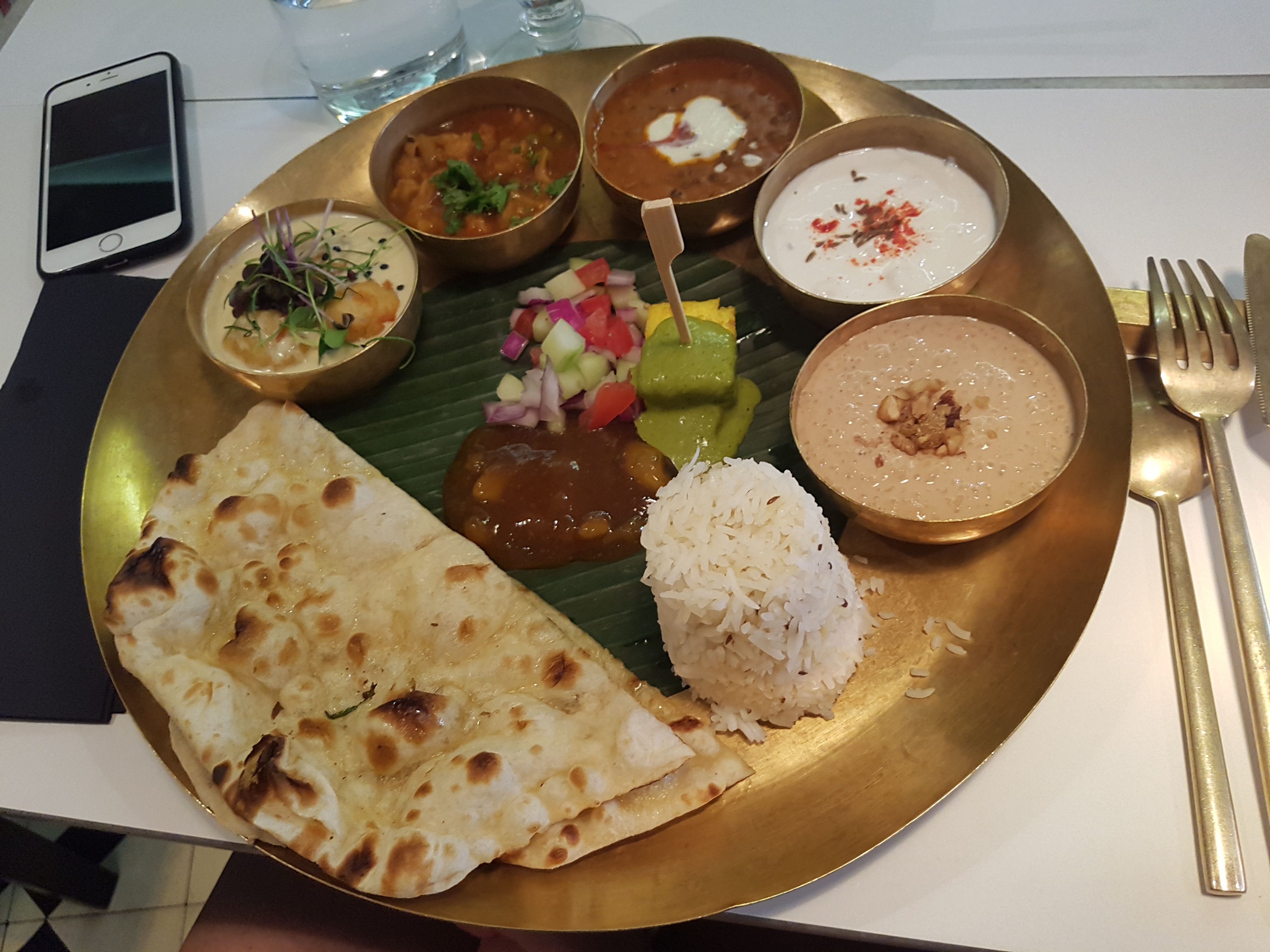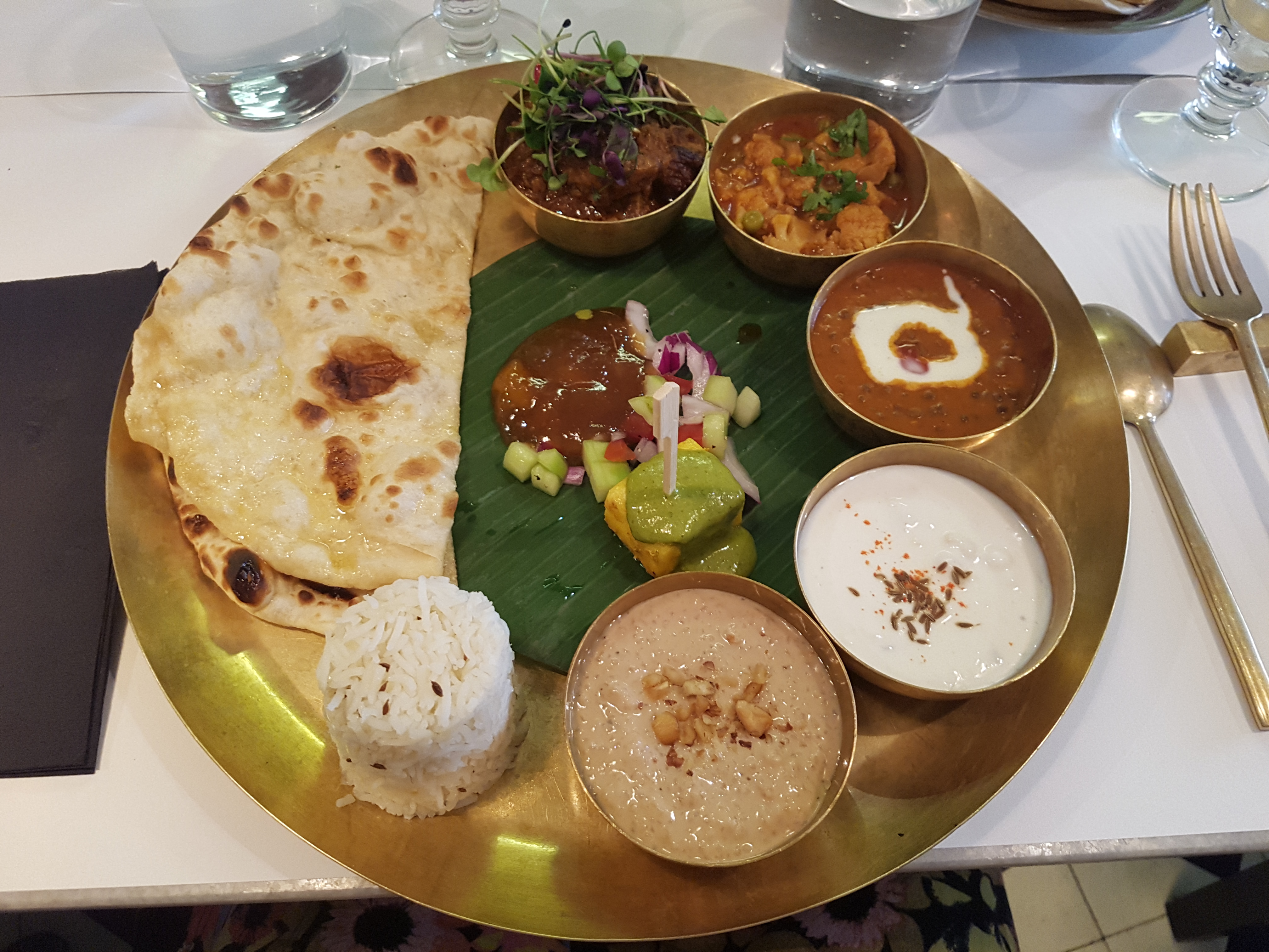 Restaurant indien sympathique situé en bord de Seine, pas loin de Saint Michel Notre Dame et qui propose un Thali vegan, soit un assortiment de petits plats dont un dal tadka, une recette de riz, des currys dont un aux pois chiches, kachumber salad, chapati (ça vient du site, la description). C'était très copieux, la présentation était vraiment superbe et l'accueil agréable. Le seul bémol a été le service un peu long ce jour là, surtout avec les personnes de la table d'à côté qui ne cessait de parler plutôt fort, ce qui a dégradé un petit peu l'expérience... (la salle est assez petite, si je me souviens bien).