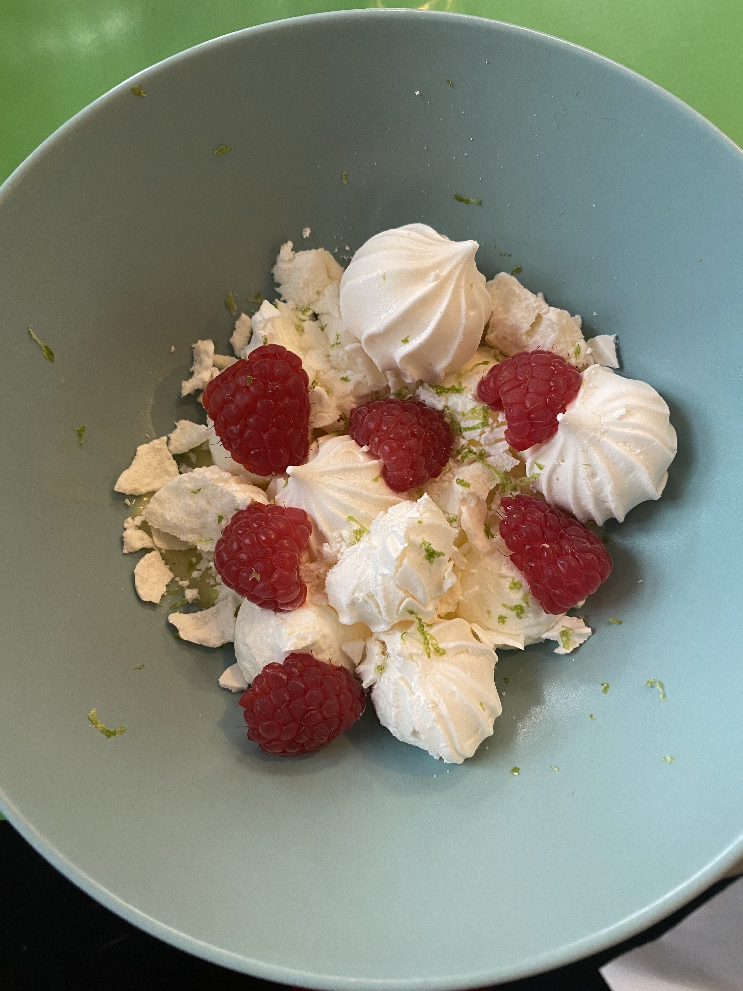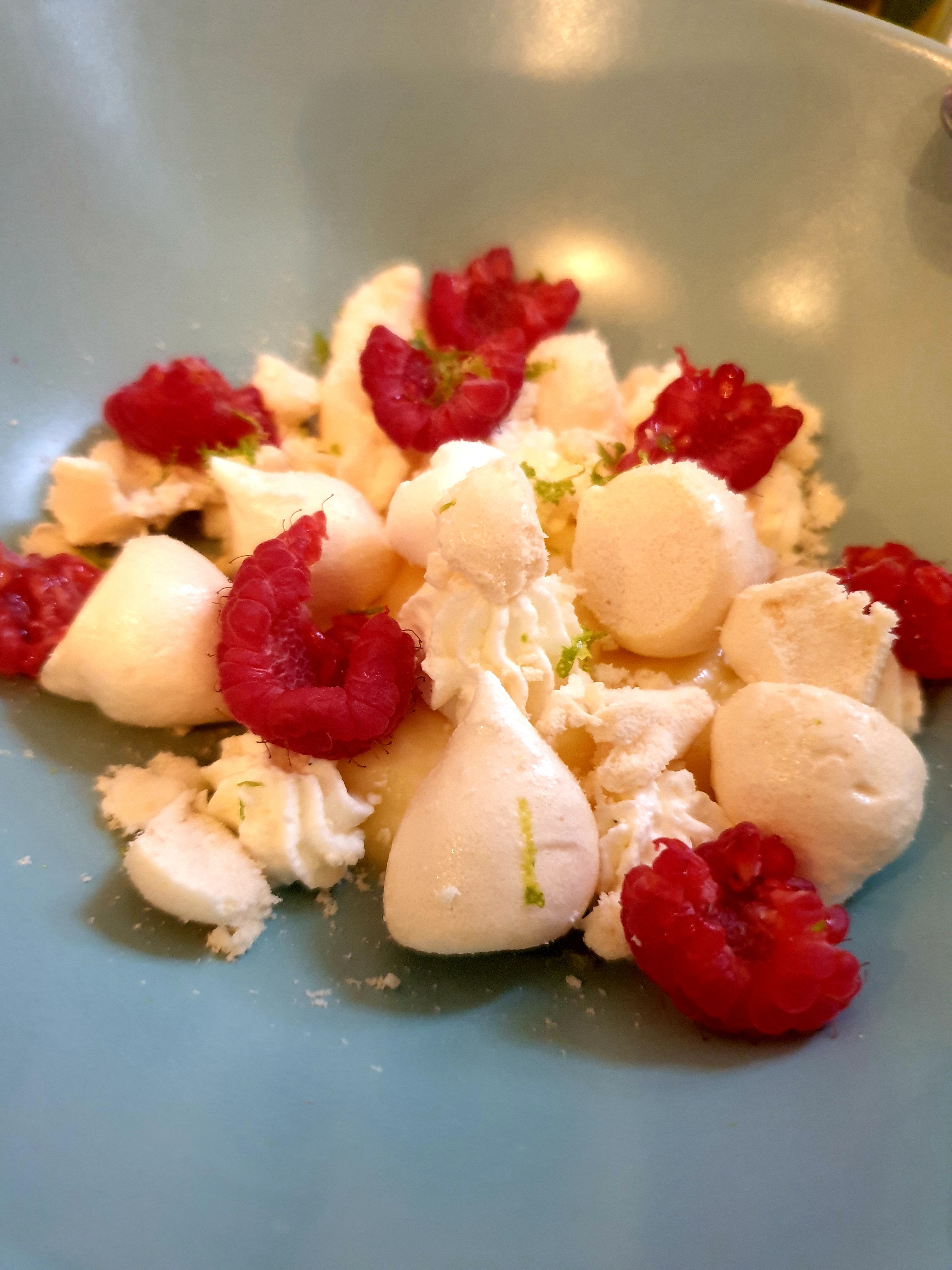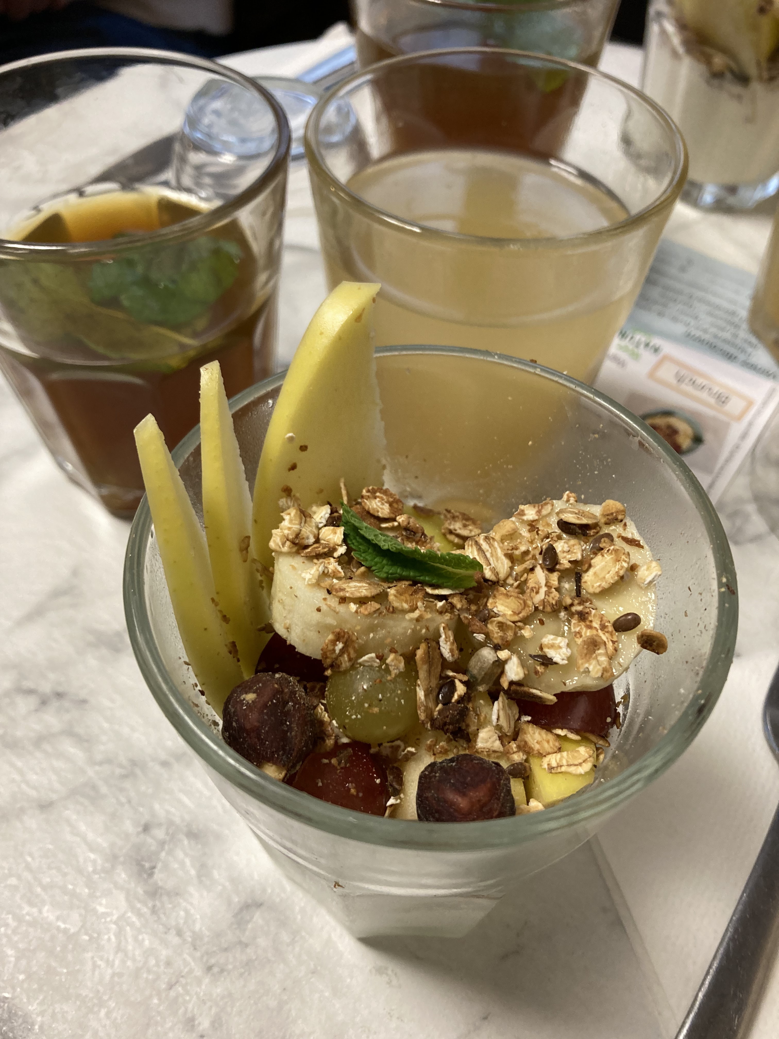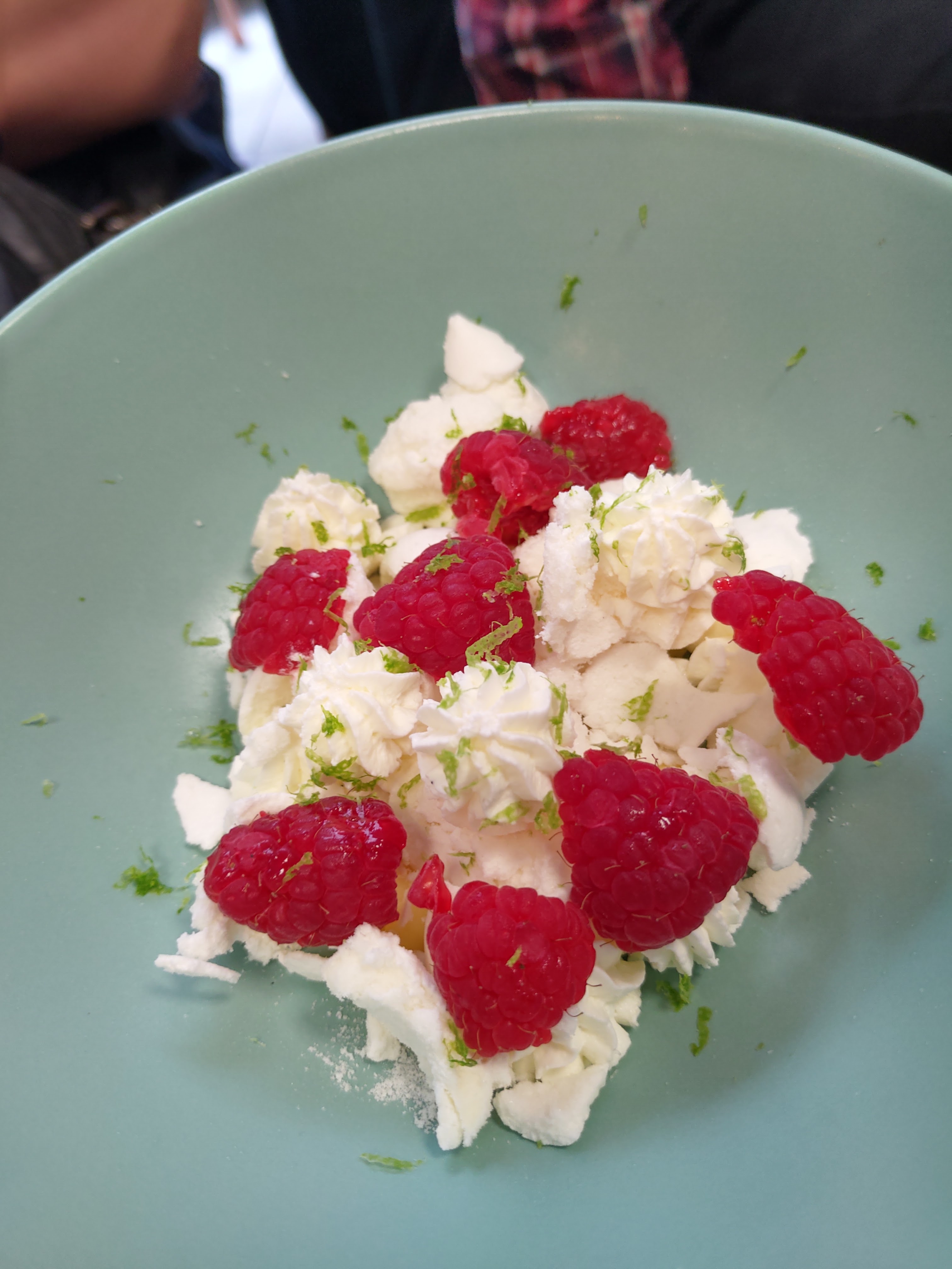 Merveilleux brunch! Fruits frais de saison, magnifiques champignons et dessert Pavlova, même le thé à la menthe est meilleur que ce que l'on trouve habituellement ailleurs ! Mon préféré absolu en France jusqu'à présent 😍 Rien de comparable au standard baguette-confiture-jus d'orange, c'est ce qui doit devenir un nouveau standard de l'industrie 😀