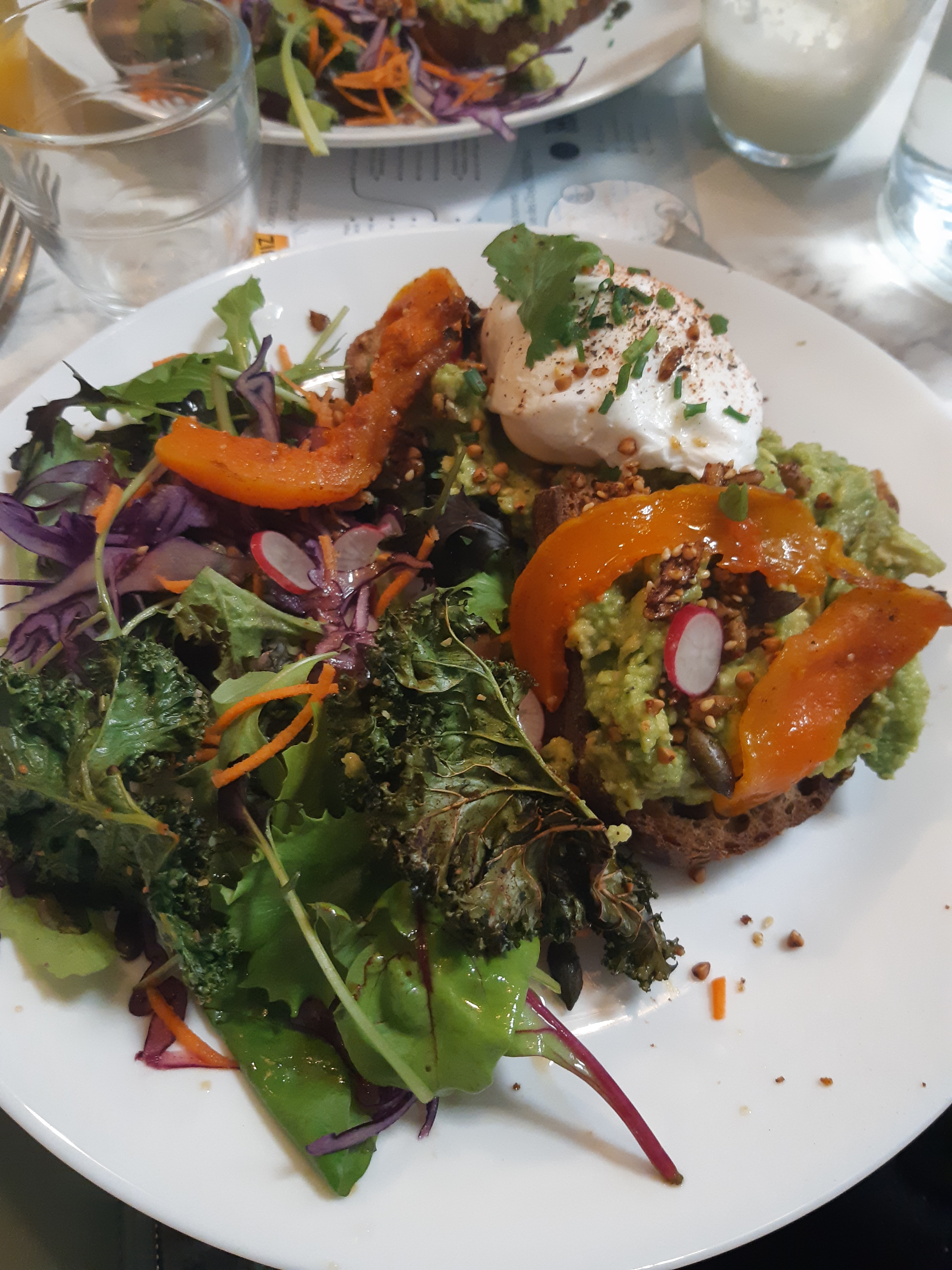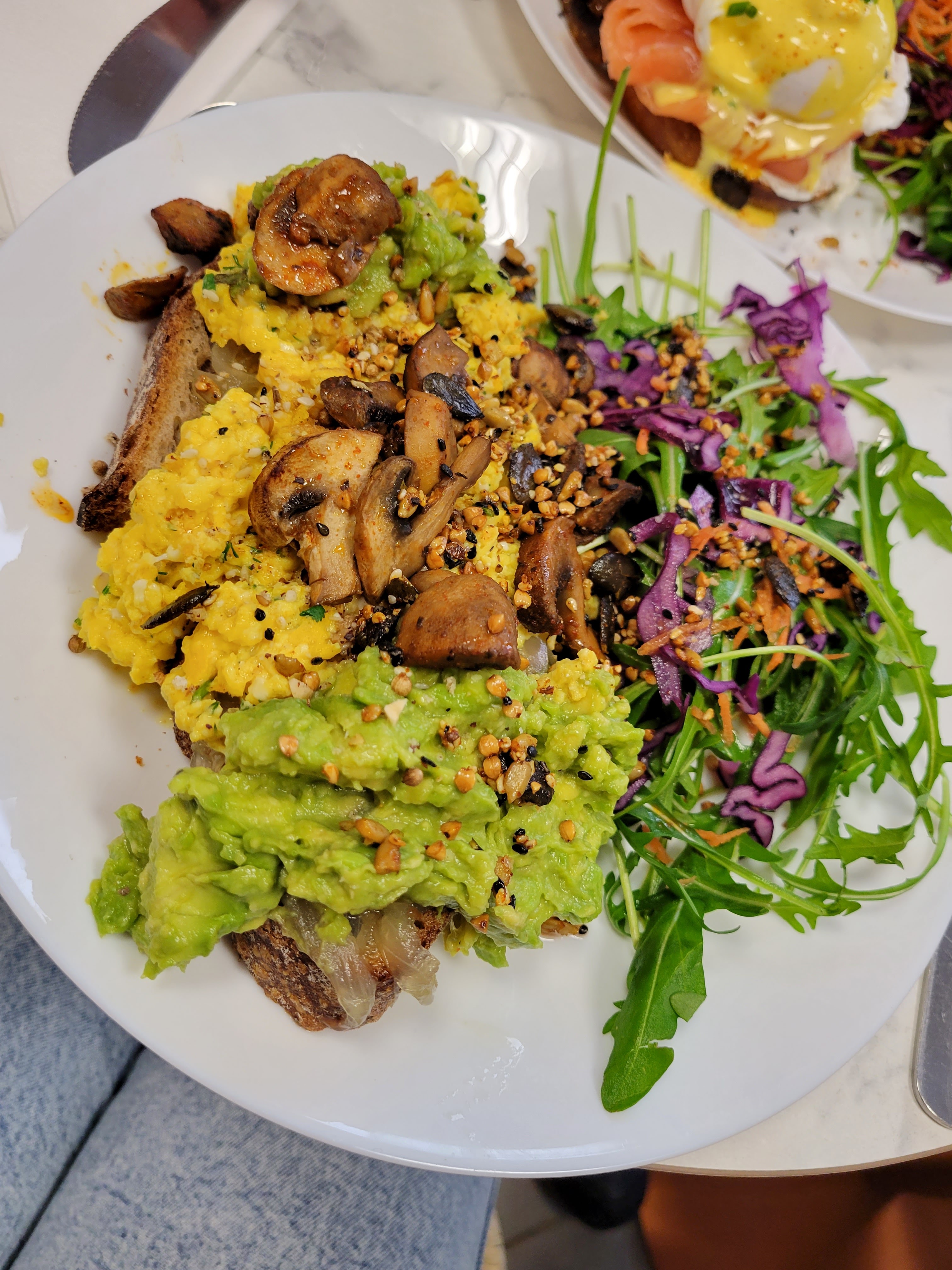 J'ai beaucoup apprécié ce brunch ! La nourriture était vraiment délicieuse ! Si je devais choisir, même si c'est assez difficile, je dirais que j'ai préféré les œufs brouillés sur pain au levain, avocat, avec champignons, dukkah & salade 🥗 🥰🤤