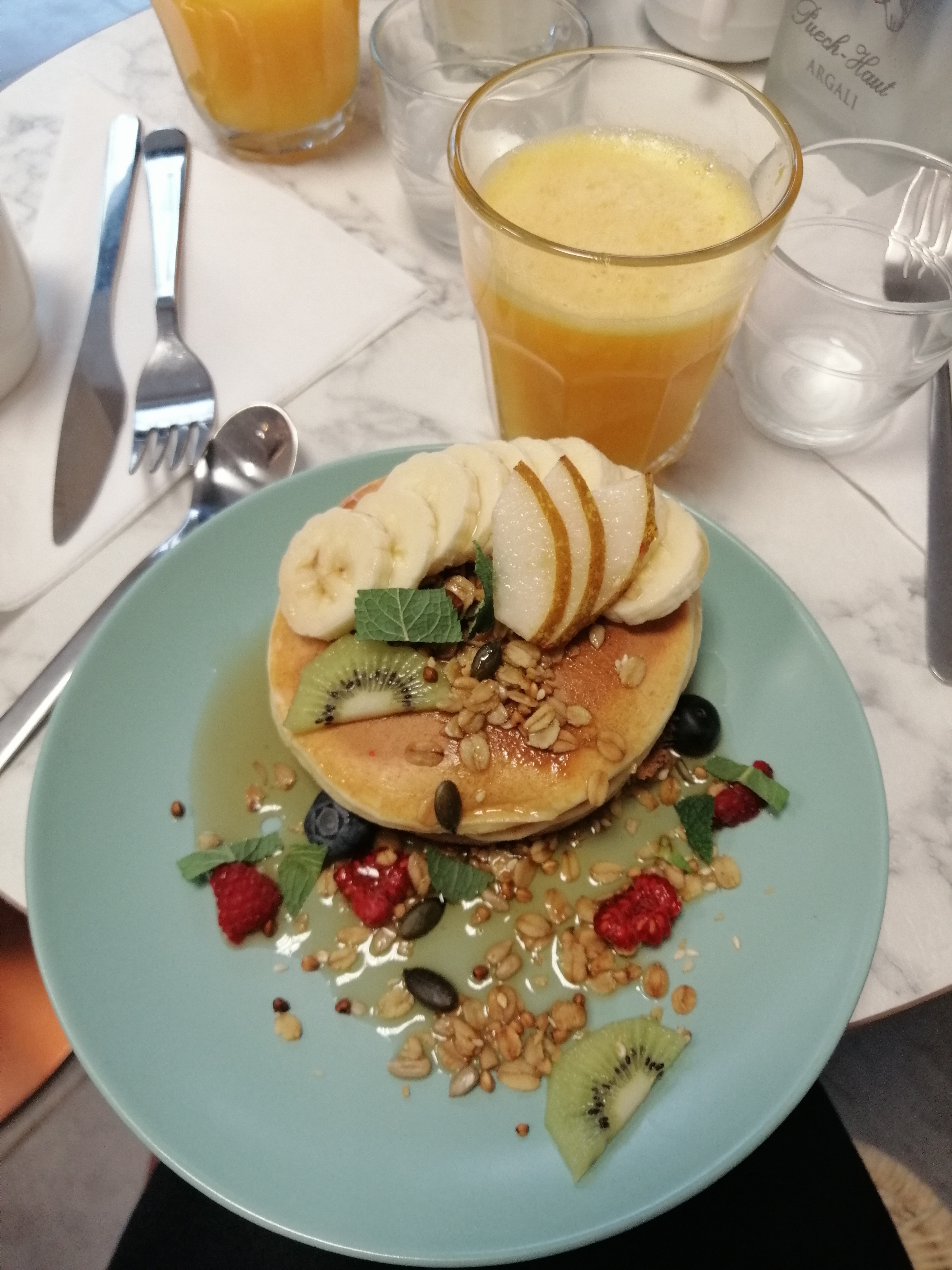 Très bon brunch, bien copieux. Petit bémol pour les pancakes (pas assez fluffys et de sirop d'érable à mon goût ^^). Par contre, le cookie choco noisettes était délicieux 😍😍