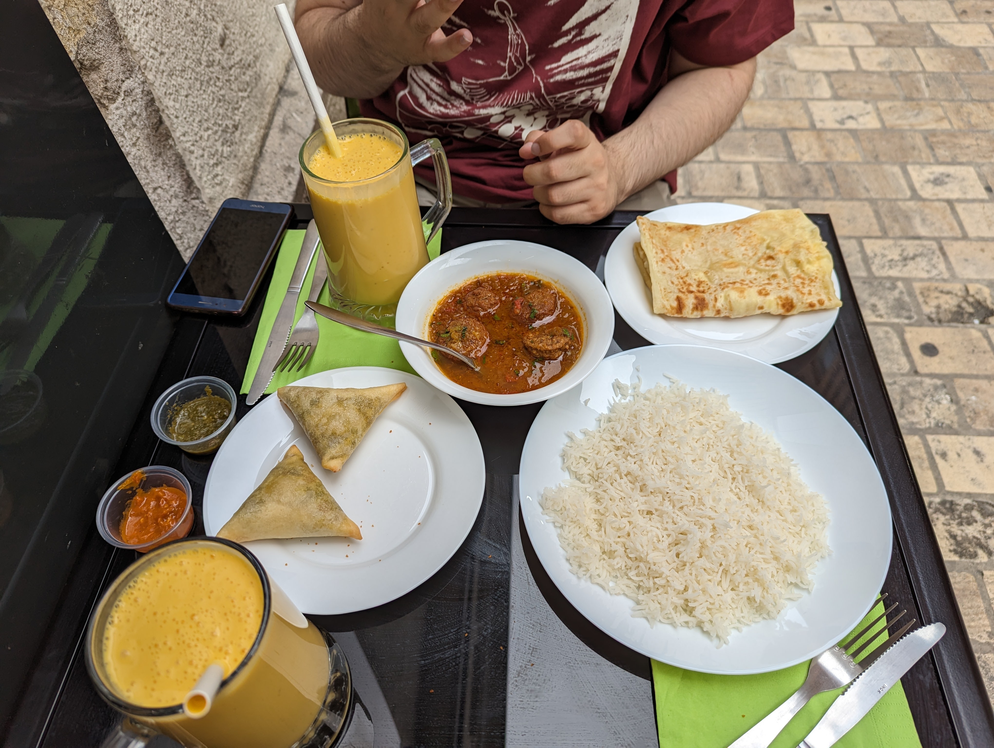 Super découverte !! La gérante est adorable et c’était vraiment délicieux 👌😊 Nous avons testé le poulet au curry avec du riz, les légumes aux pommes de terre, les samossas aux légumes, les desserts sucrés et le lassi mangue. C’était copieux et fort épicé comme on aime !! On en a eu pour 43€ pour 2 donc c’est un bon prix pour tout ça. Nous reviendrons sans hésiter 😊👍