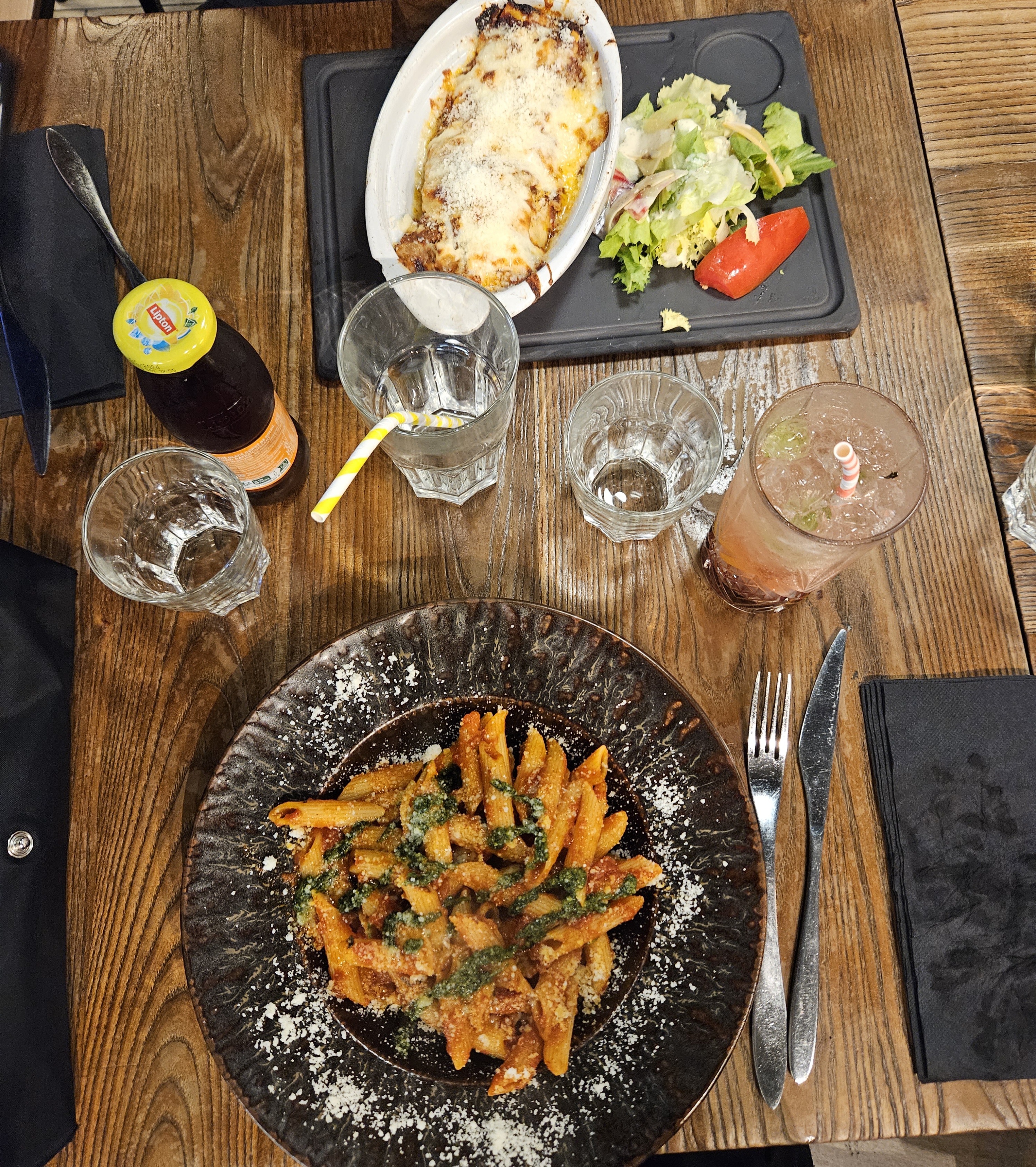 Les penne arabiata étaient faites avec de la tomate concentrée et non de la vraie tomate, ce a quoi on ne s'attende pas dans un restaurant italien surtout à 13e l'assiette. Les pâtes n'étaient pas fraîches non plus. Dans l'ensemble, je donnerais 0/5 pour les pâtes. La pizza et le dessert étaient corrects mais un peu chers quand meme