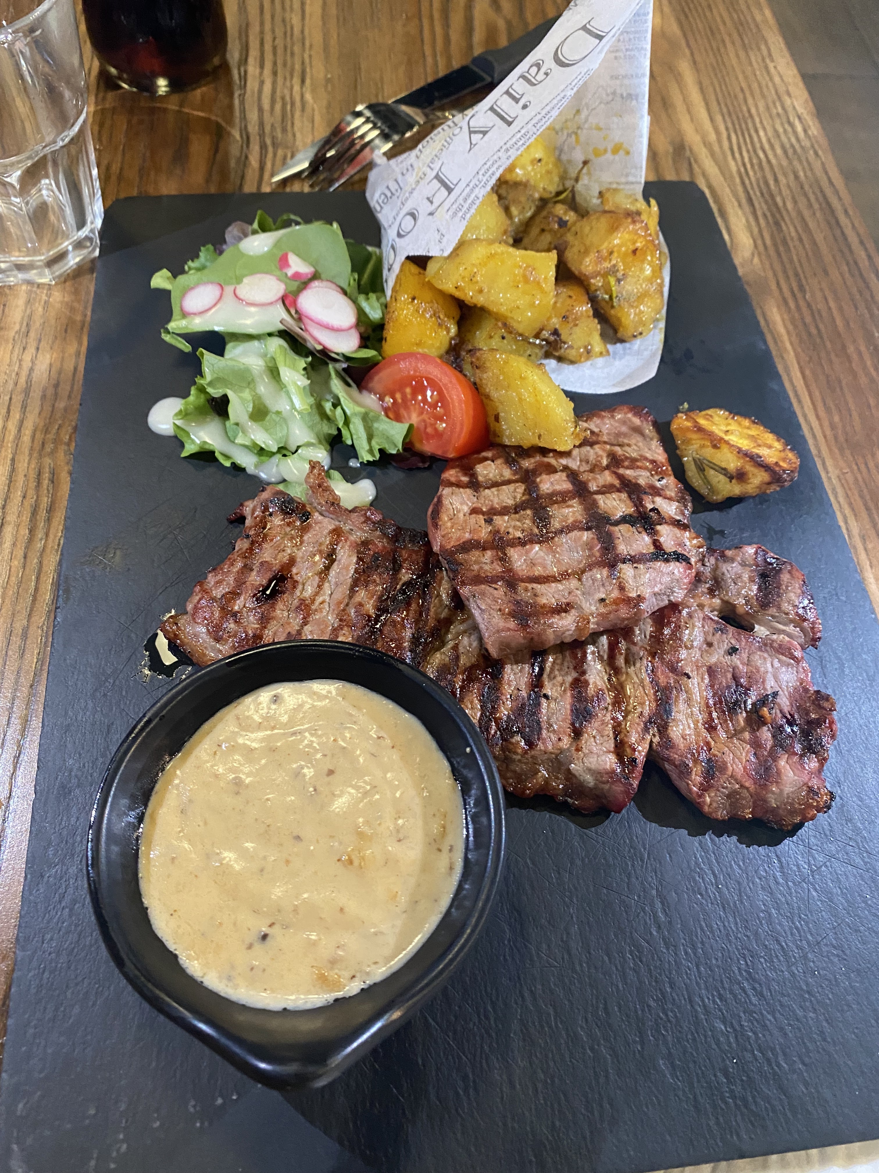 Réservation pour 20h30 donc on arrive 5 minutes avant, nous avons été reçu à 20h45 et servies à table à 21h15, les côtelettes d’agneau sont en réalité des os sans viandes accompagné de frites surgelés ! Et quand on le signale à la serveuse elle nous confirme que effectivement il n’y a pas beaucoup de viande (cela ne change rien au tarif de 24€ payer en caisse à la fin du repas). Très déçu par ce restaurant, je ne comprend pas les nombreux avis positif.