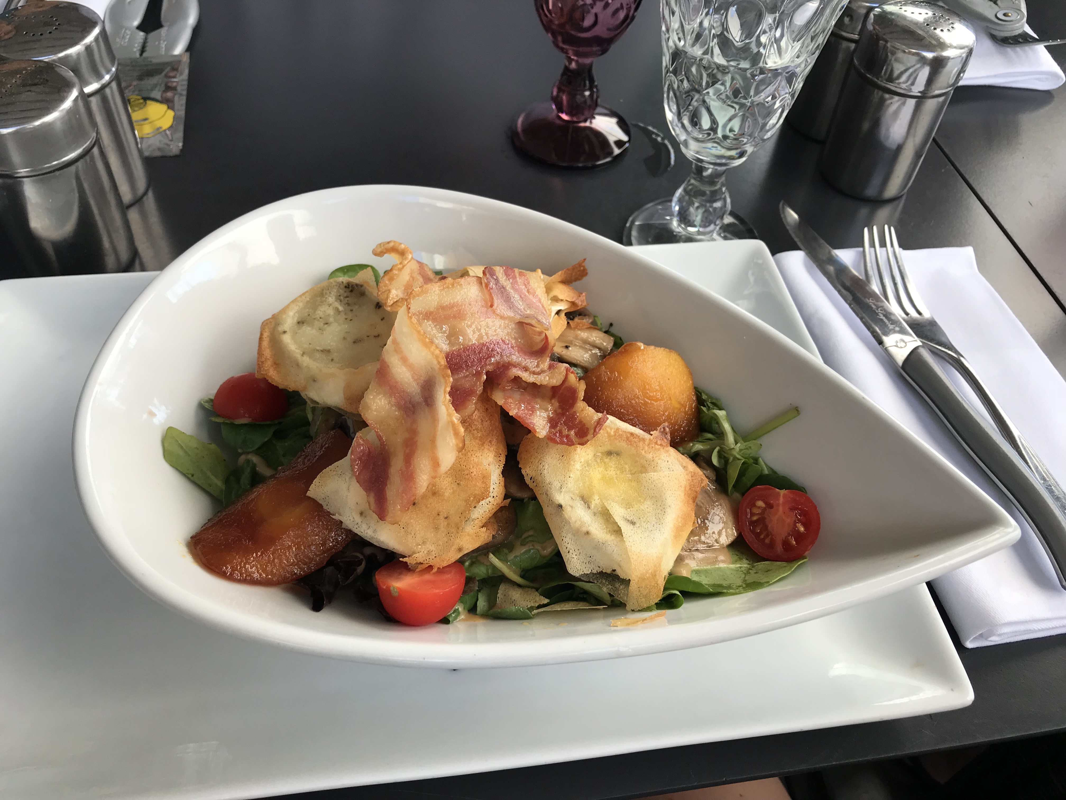 Excellente salade mais le serveur d'abord antipathique puis très gentil et la patronne attablée à côté de nous qui chochotte à l'oreille de son personnel en montrant des clients me laissent perplexe...