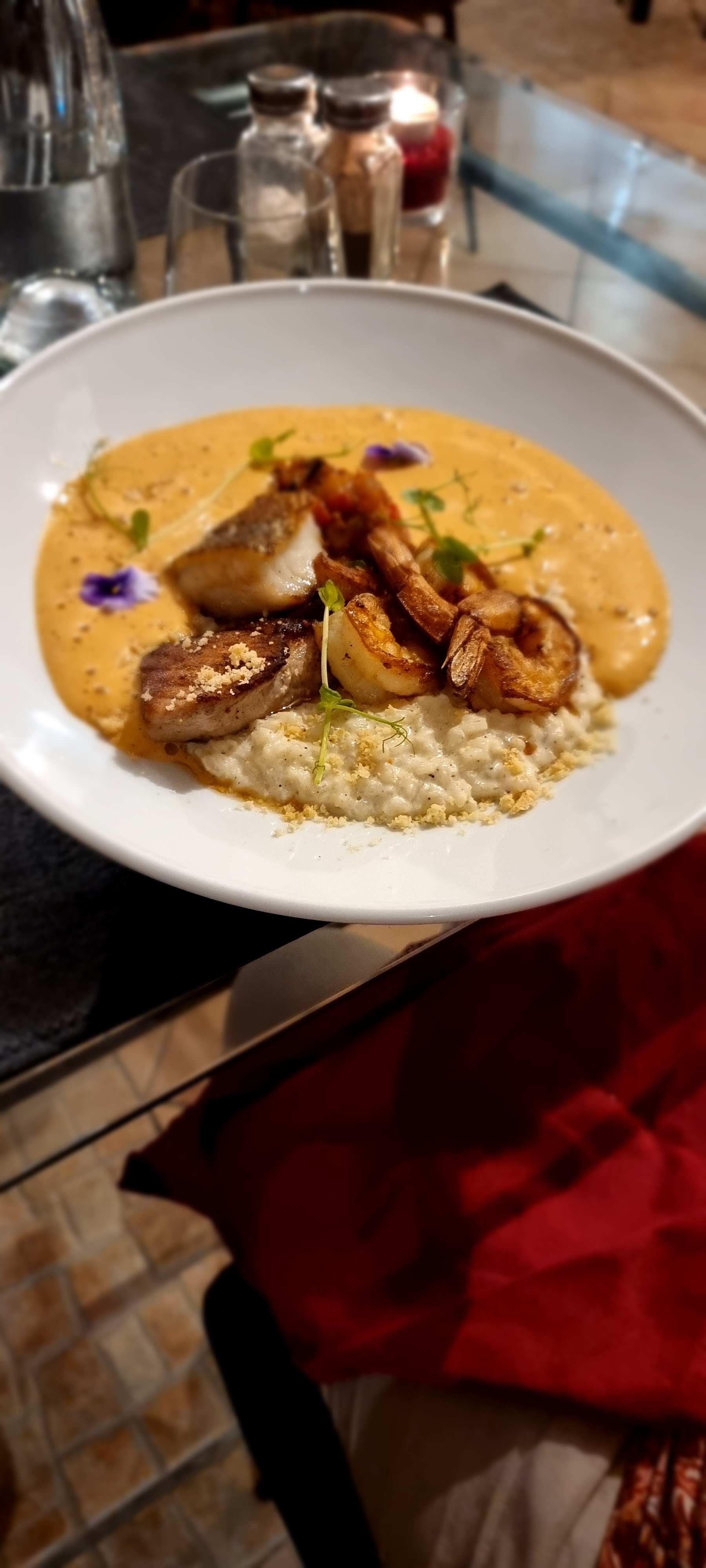 Nous sommes allés au joli petit restaurant pour un petit déjeuner. Nous avons pris un vin mousseux en entrée. Elle ne brillait pas du tout, elle était restée ouverte trop longtemps. Ensuite nous avons pris le foie gras. C'était très bon. Le vin rouge était ouvert minimum 2 jours. Le plat suivant était un risotto aux fruits de mer. (30€) C'était le paradis et l'enfer. Le poisson était parfait. Les coquilles Saint-Jacques étaient très bien faites mais pas de bonne qualité. La langoustine était vieille et trop cuite. Le rouleau de printemps était non seulement salé, mais tellement salé qu'on ne pouvait pas le manger. 😭 Le rapport qualité/prix était tout simplement mauvais. Et il y a eu de grosses erreurs de qualité et de préparation. J'en ai parlé au propriétaire/directeur. Il n'était pas vraiment intéressé 🙄