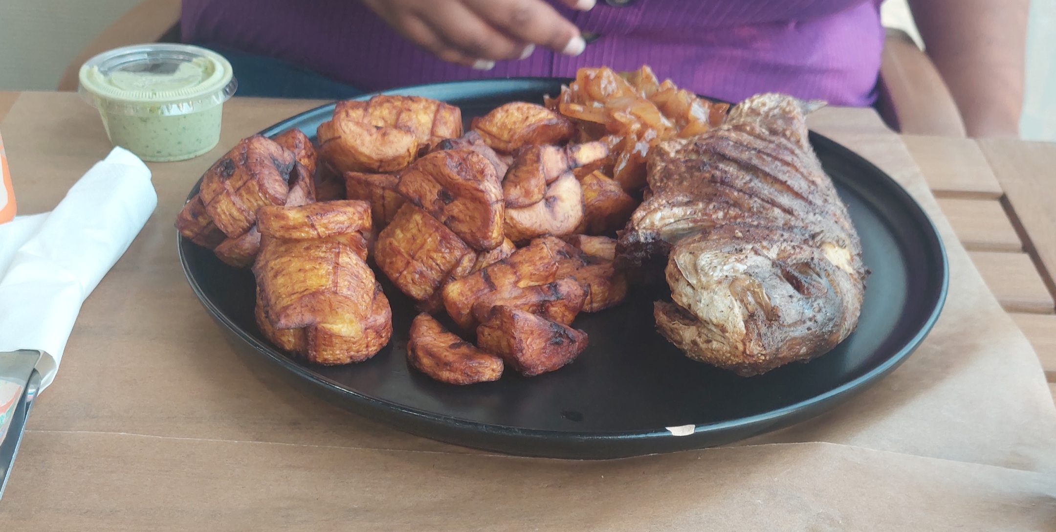 Un très bon poisson bien cuit ,j’ai pris comme accompagnement du athieké et alloco c’était trop délicieux,je recommande