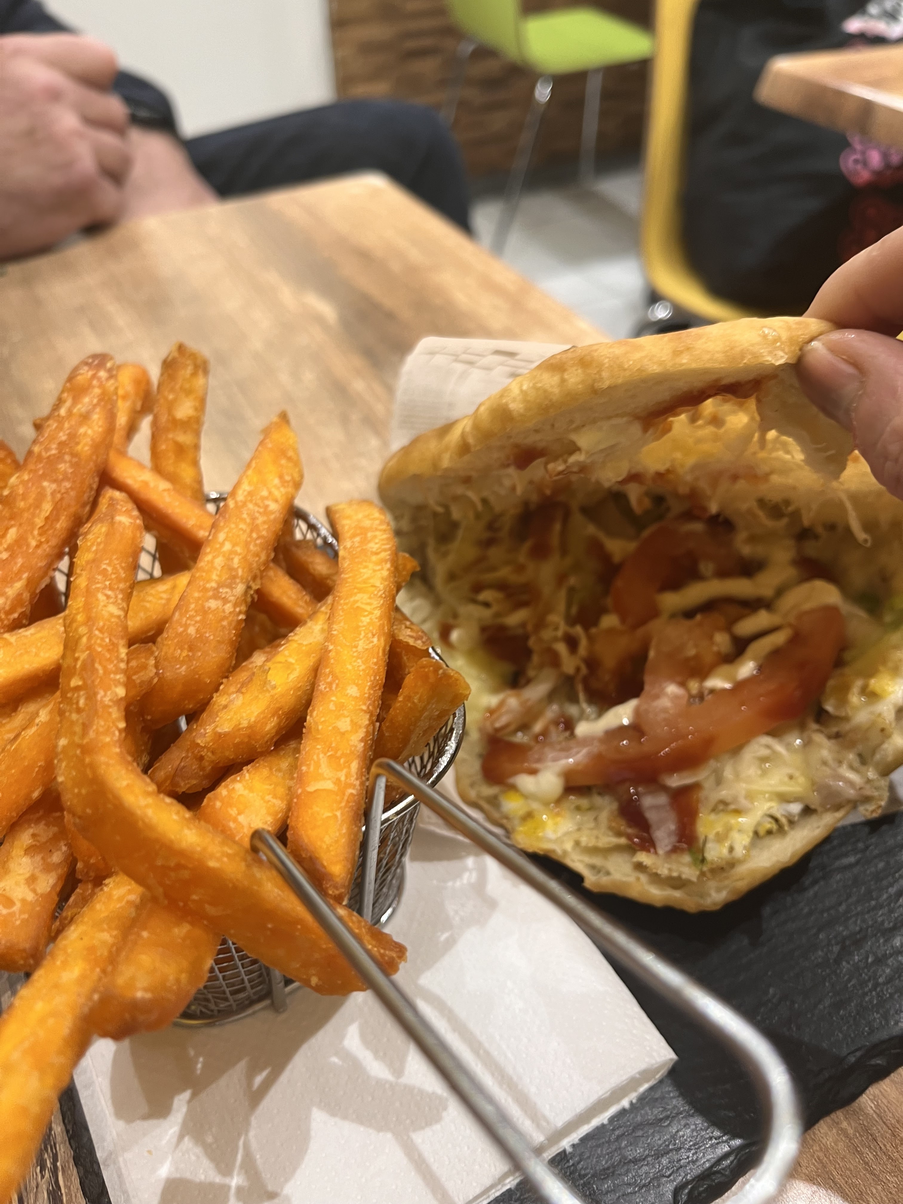 -Un sandwich pas trop gras avec beaucoup de goût 👍. -Des frites de patates douces savoureuse . Je recommande