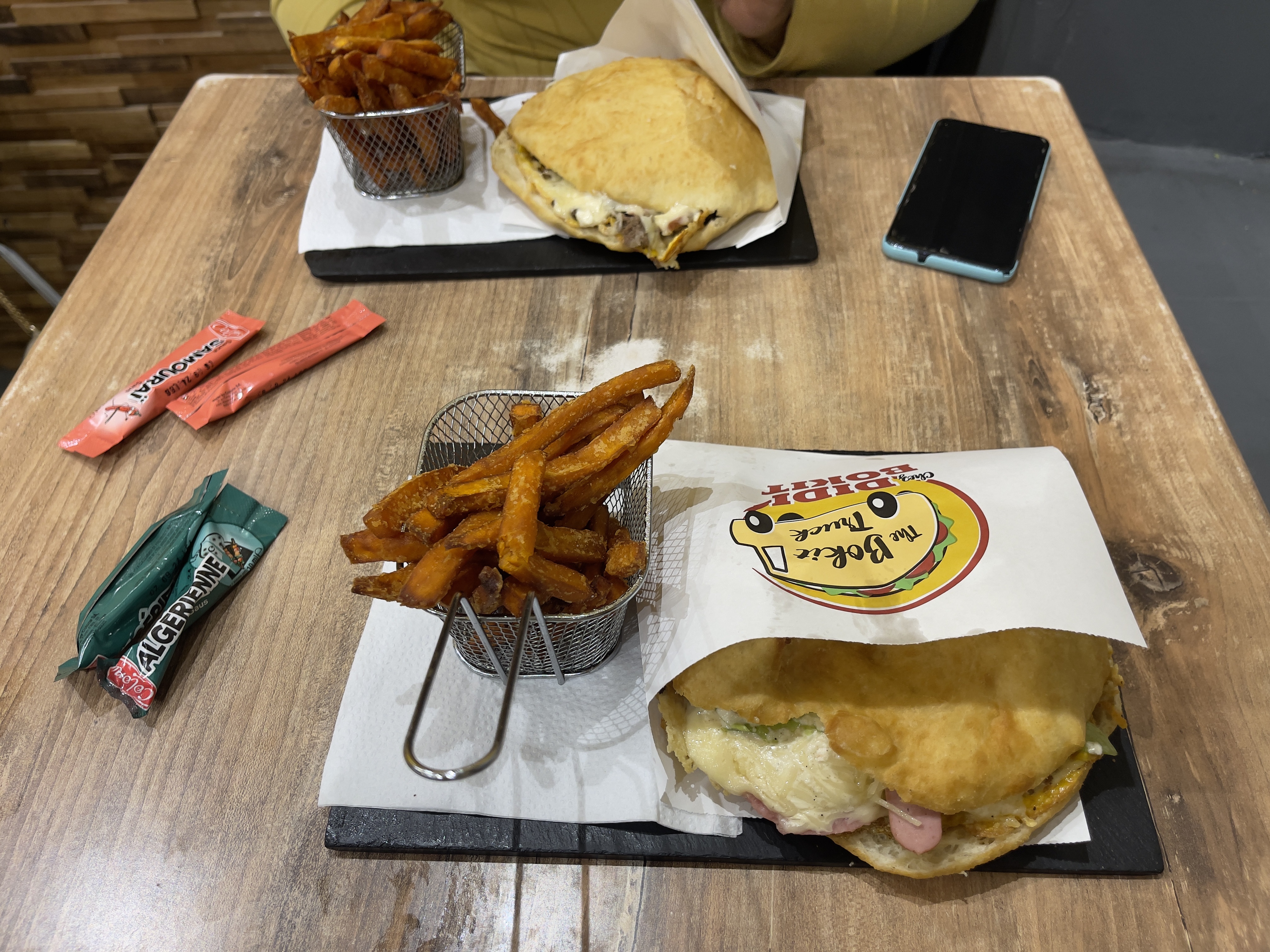 Sortie de Cergy pour venir tester le Didi Bokit. Arriver beaucoup de difficultés pour se garer. Lieu très petit à l'intérieur, mais des places à l'extérieur en plus. À peine arrivée, on annonce qu'il y à plus de menu, ça veut dire plus de frite,ni frite patate douce,déception. Je commande quand-même 1 classique poulet et un complet,des chichi et un jus de canne. Les bokits sont assez bon dans l'ensemble, par le poulet, la sauce chien et le piment. En contre partie je trouve le bokit assez plat avec très très peu de garniture, au vue du prix je m'attendais à autre chose,encore déçu de se côté,voire les photos, en tout cas je les préfère avec plus de mie et plus consistant. Les chichis passe mais avait plein de truc noir, je penses que la même huile est utilisée pour la friture des bokits et les chichis. Jus de canne pas assez frais, de plus la bouteille avait du gras dessus. Bokits bon,proposition de jus boisson pays,dessert comme du sorbet,et aussi des crêpes salées. Ps: Toutes les personnes en cuisine avaient une charlotte en tête, c'est très bien pour éviter les cheveux dans les bokits. Mon avis est mitigée, mais je recommande quand-même.