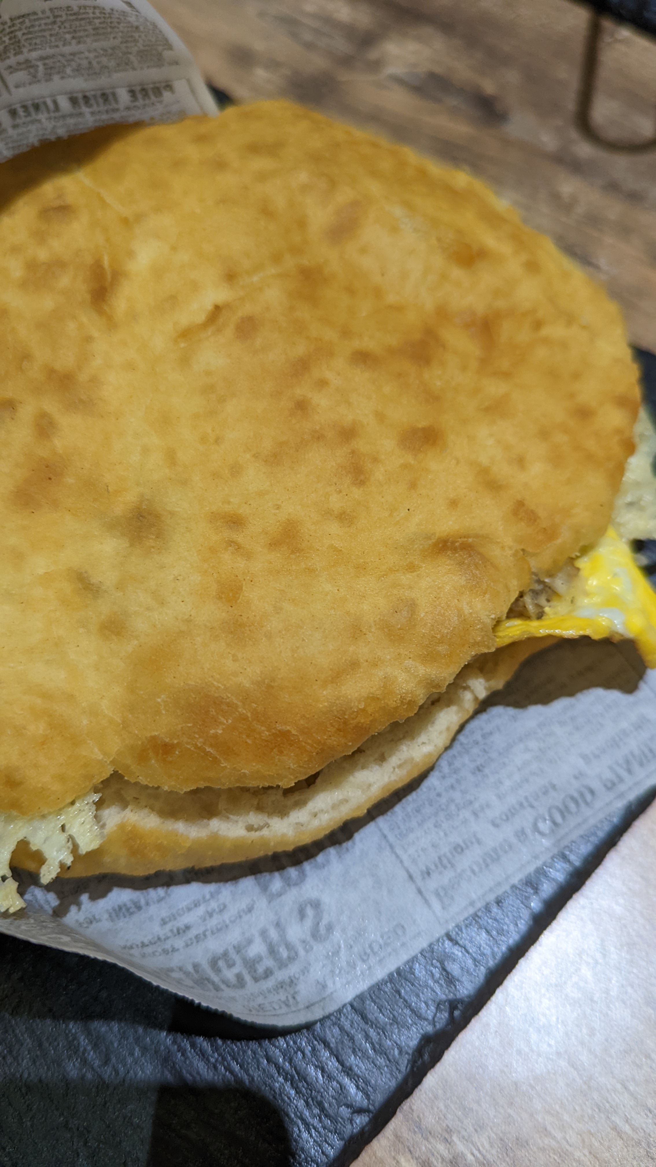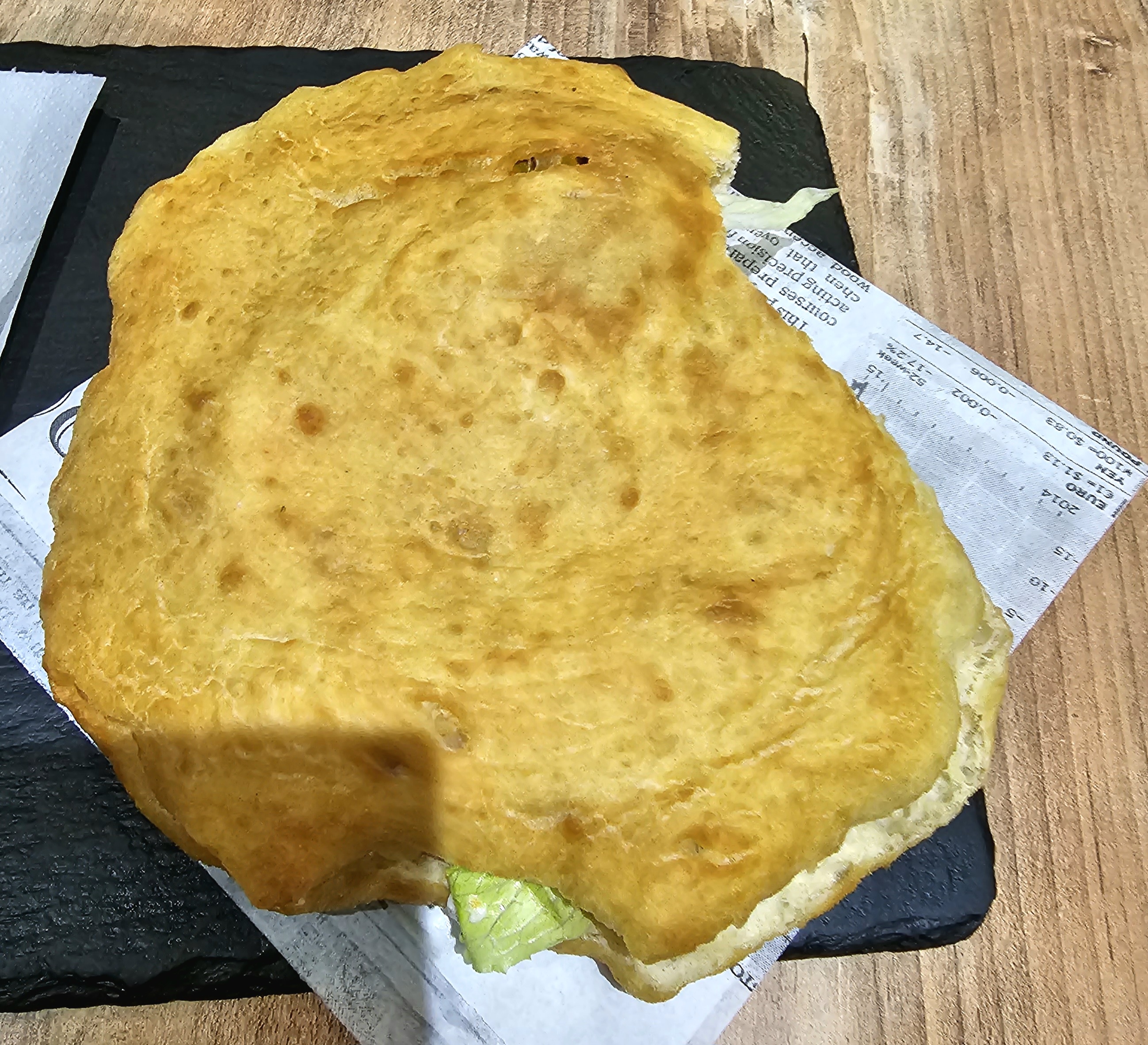 J’ai commandé un Bokit poulet, j’ai eu un bokit jambon fromage. Le pain frit pas terrible. On appelle ça un pain laboue. On dirait pas qu’il a été frit.