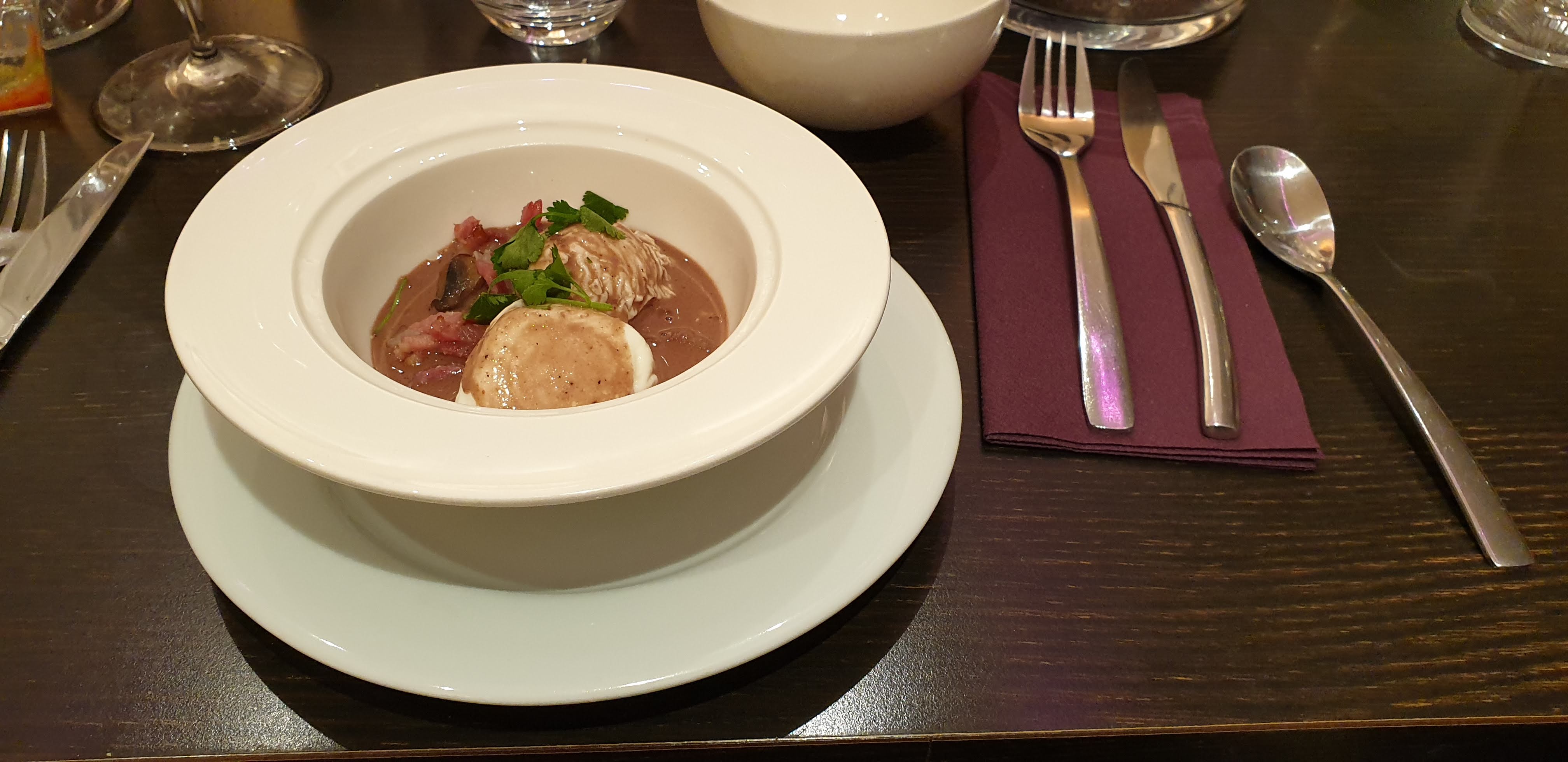 Repas de fin d'année organiser par notre entreprise, salle du haut quasi privatisée pour nous, apéritif soupe de champagne, foie gras, très bon, souris d'agneau fondante, dessert fondant chocolat avec boule de glace. Moment sympa, équipe disponible et serviable. Je recommande cet établissement.
