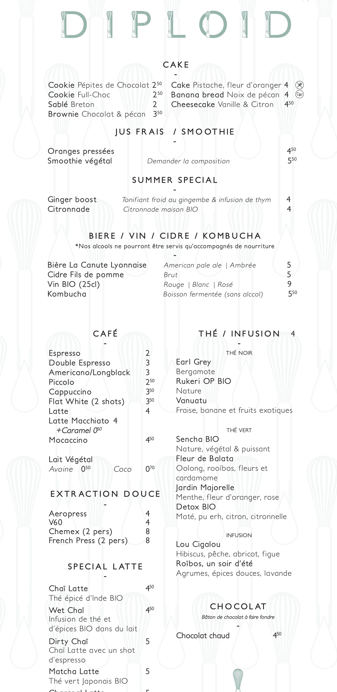 A la recherche d’un endroit où on peut déguster un petit déjeuner en mode brunch en semaine nous sommes tombés sur DIPLOID Dernière commande possible jusque 11h30 Leur carte est riche et variée et surtout de qualité. Un + pour leur choix éthique de ne pas proposer des toasts avocat saumon tout au long de l’année. L’endroit lui est juste parfait: cosy, calme et reposant. Possibilité de rester en terrasse ou dans la cours intérieur qui séduit. Je conseil vivement le toast au haloumi qui est une découverte. Les prix eux sont abordables. Mention spéciale pour leur cake (banana bread & citron pavot) et surtout le GRANOLA qui est juste délicieux (on y trouve tout les fruits sec sans modération) Je recommande à n’importe quel moment de la journée Une étoile en moins : la formule brunch du dimanche offre moins de choix ce qui est domage