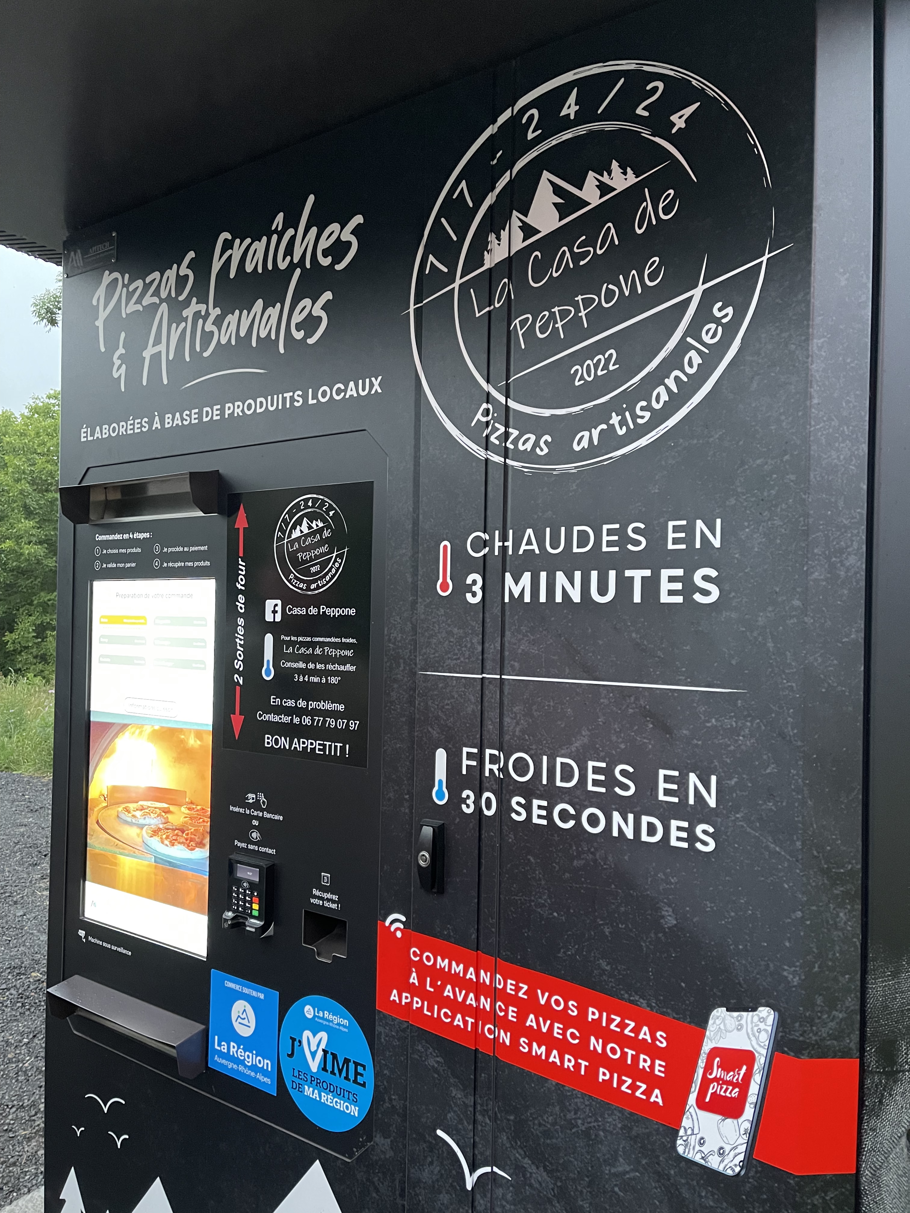 Première expérience de distributeur de pizza. Nous étions au premier jour de nos vacances familiales dans un superbe gîte à proximité. Nous cherchions une pizzeria et nous sommes tombés sur ce distributeur. Il y avait la queue, donc nous avons pris l’option de scanner le qr-code pour installer l’application et commander nos pizzas directement en ligne. C’était parfait en terme d’expérience et ergonomie, y compris le paiement en ligne très pratique. Une fois la machine libérée des clients précédents, nous avons pu demander à la machine de récupérer nos 6 pizzas. Attention, elle peut préparer que deux pizzas à la fois. Et il faut compter entre 3 et 4 minutes selon les pizzas pour la préparation et la cuisson. Au niveau du goût, très bonne surprise sur la qualité. Tout le monde a été conquis. Bravo !