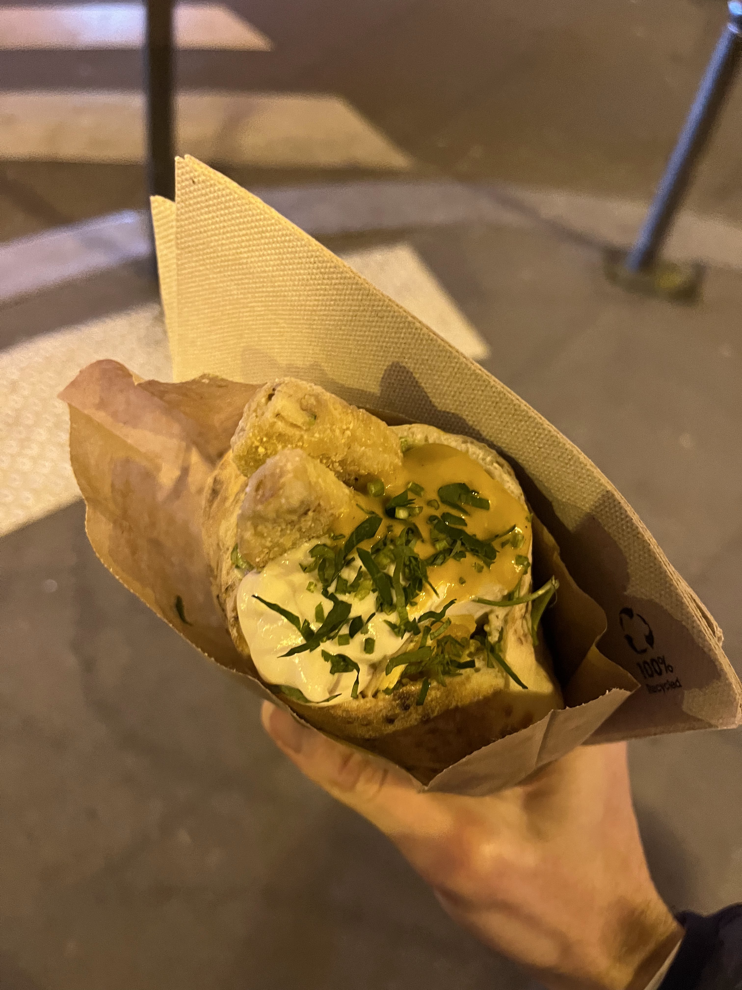 C'est bon, frais et ça change du traditionnel falafel. Prix un peu élevé, 9€ le sandwich