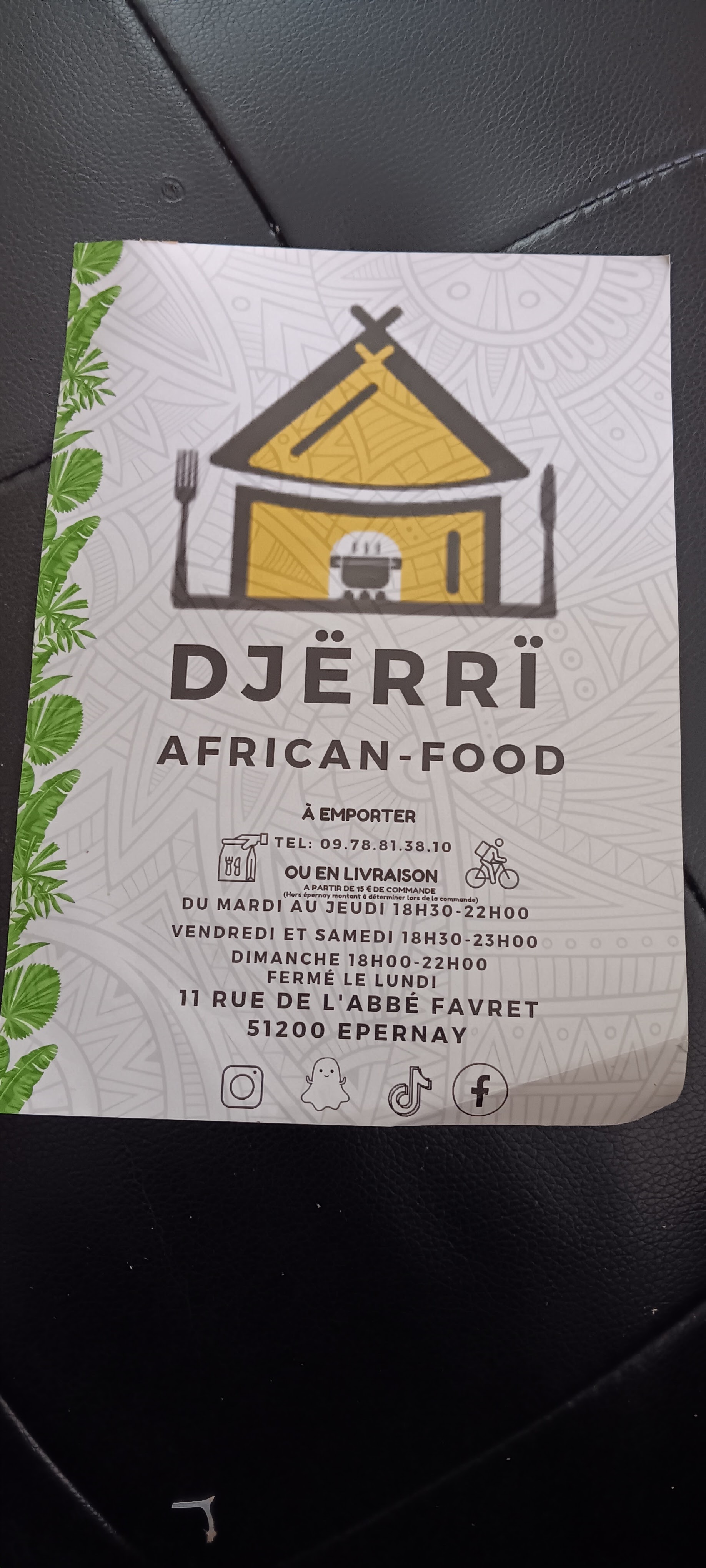 Voici toutes les informations sur le Restaurant africain DJËRRÏ AFRICAN-FOOD qui ce trouve au 11 Rue de l'Abbé Favret, 51200 Épernay (51). Sur cette fiche vous trouverez les photos, l'adresse, les horaires d'ouverture, le numero de téléphone et les avis clients.Vous pouvez églement rédiger un avis si vous le souhaitez en bas de page.