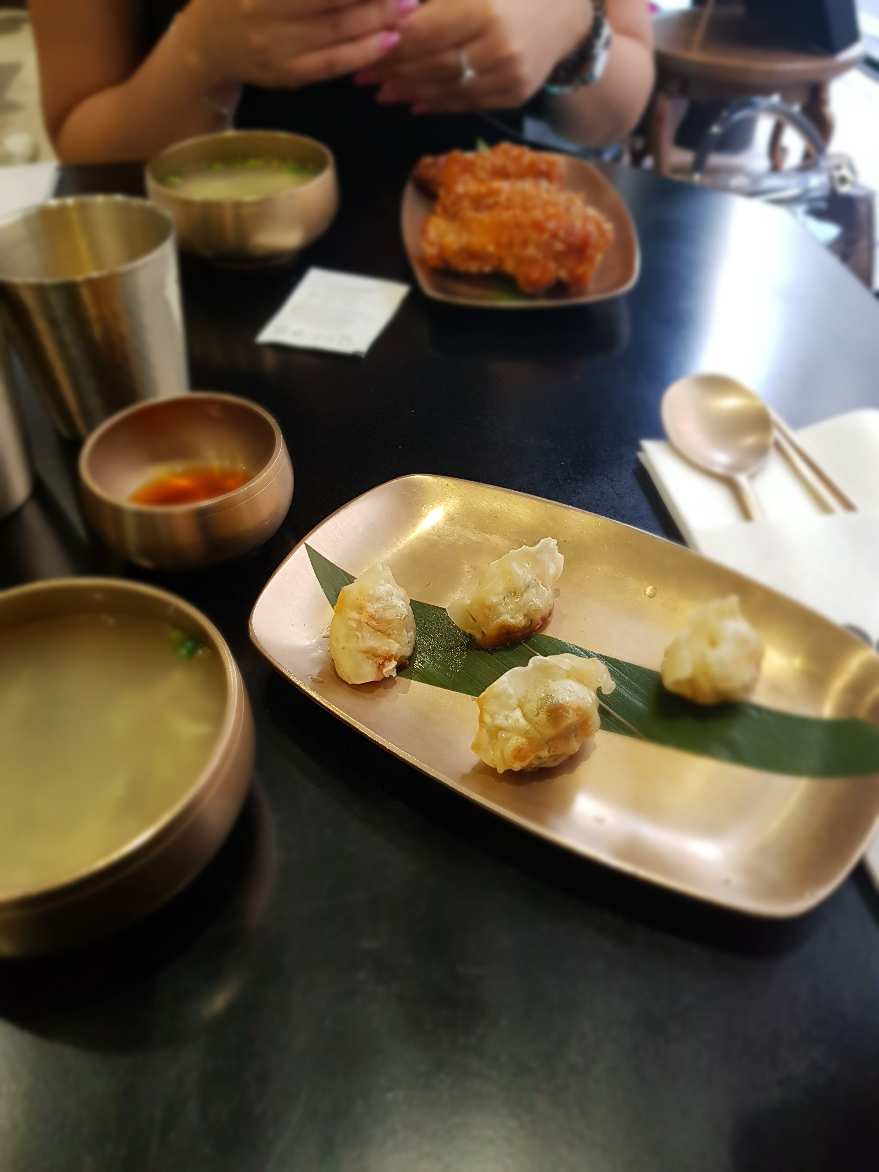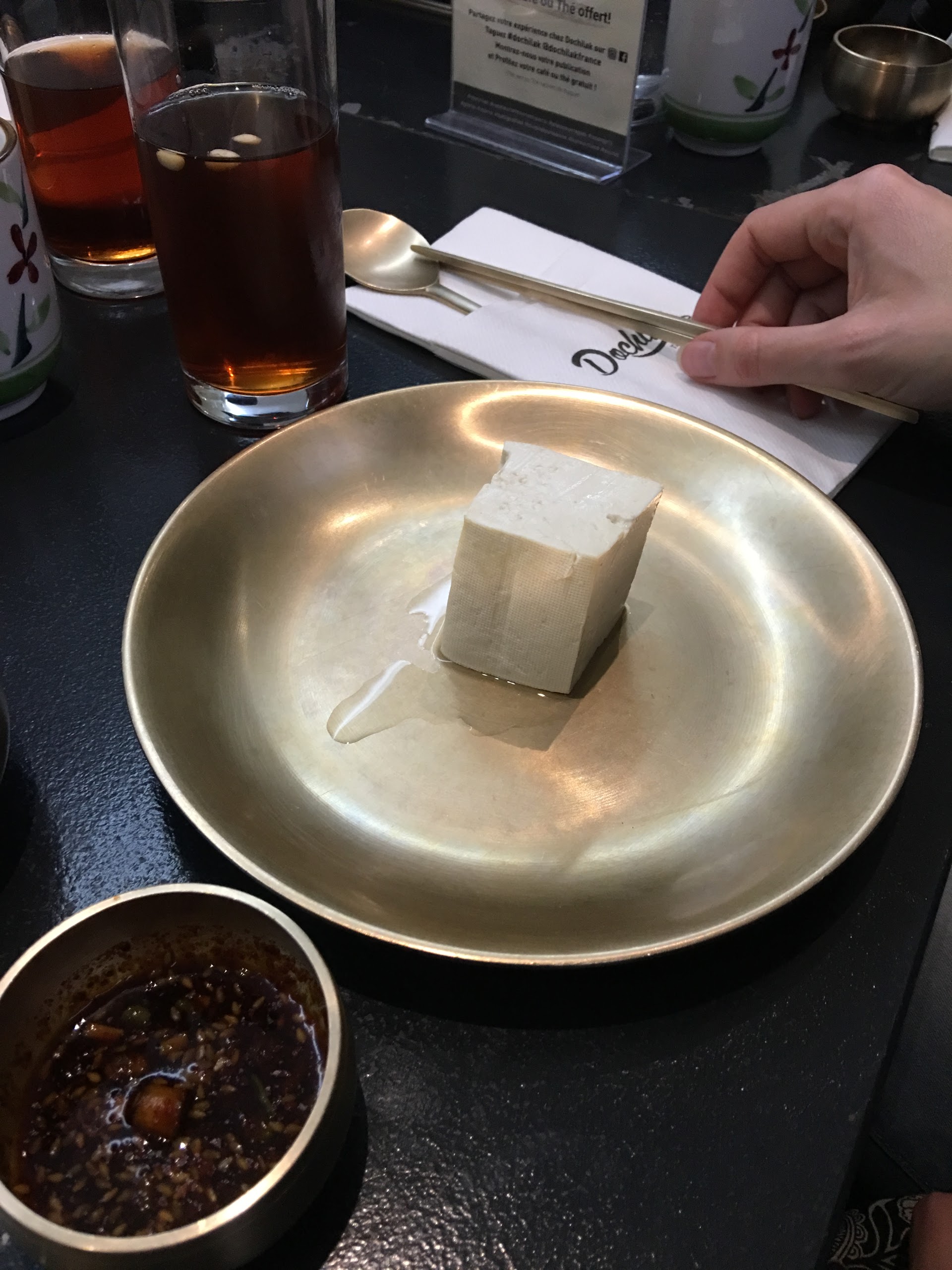 Quand on entre on entend tout de suite les bips dés micro ondes qui servent à réchauffer vos plats... résultat les raviolis aux crevettes proposés en entrée dans les menus sont immangeables car la pâte est devenue totalement élastique et durcie... si vous choisissez le tofu frais vous aurez... un morceau de tofu posé au milieu d’une assiette avec absolument rien d’autre. La glace au sesame noir n’a pas beaucoup le goût de sésame.. Le bibimbap n’était pas mauvais à mon goût, mais je ne suis pas une experte de ce côté là. Côté prix, une vingtaine d’euros par personne pour entrée plat dessert boisson. Un peu cher pour des produits « traiteur »