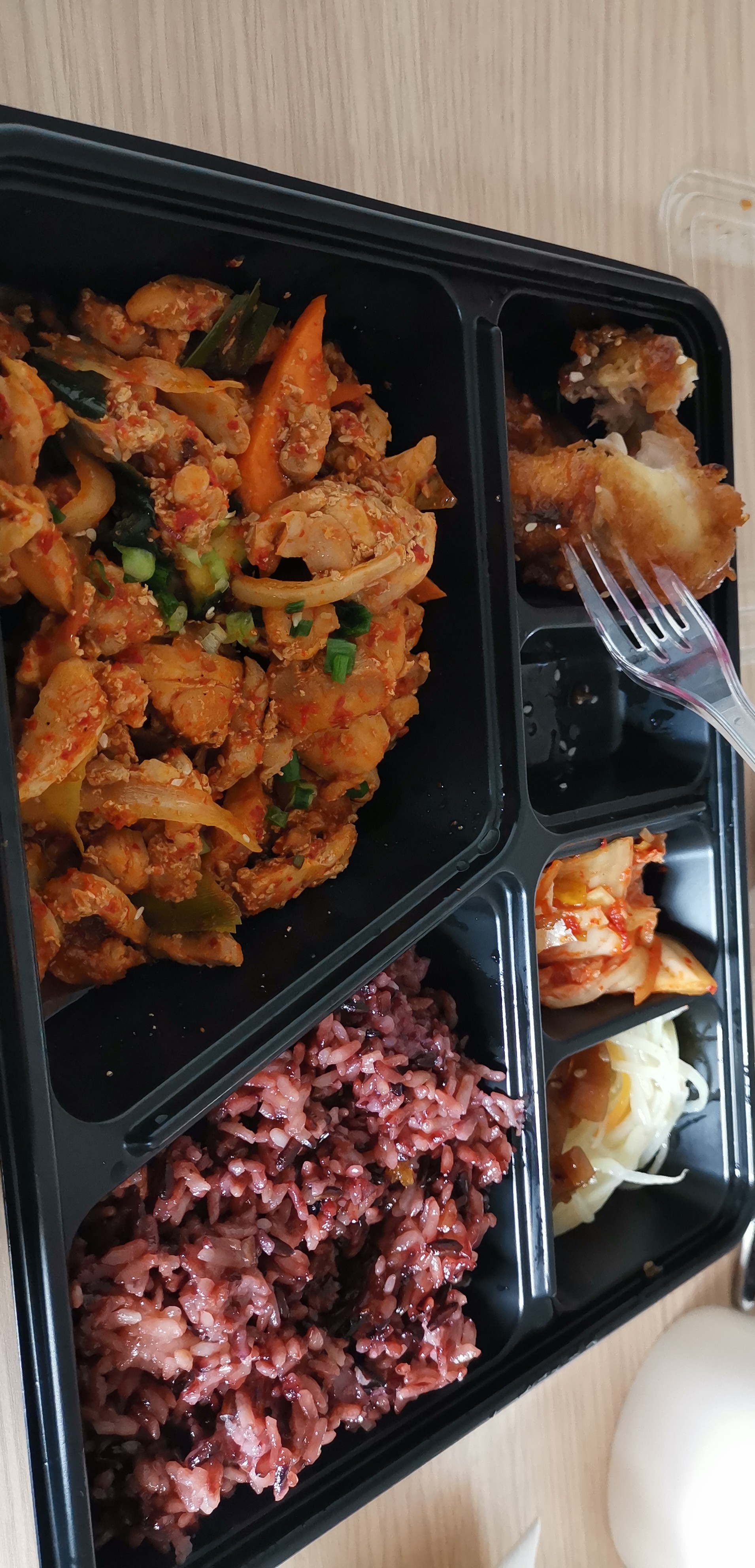 Petit resto très sympa La déco et la présentation sont top Les plats sont très bons notamment les ailes de poulet frit et le bibimbap au riz noir accompagné de condiments. Les menus sont intéressants. Petit bémol sur l'organisation.