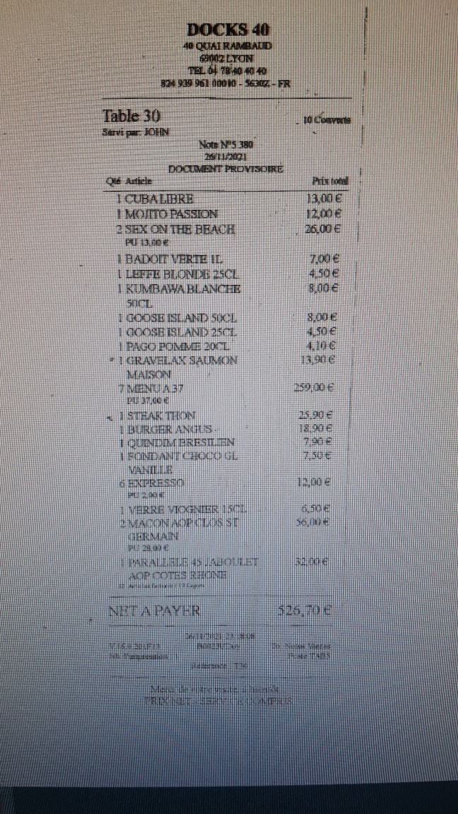 Venus prendre aperitif. au menu planche de charcuteries et vin. Attendons toujours appel du responsable, suite mauvais comportement téléphonique de Sophie des Docks 40... avons vérifié avec un serveur agréable que vs avez nos coordonnées. Et pensez à nous envoyer vos dates de soirées à thèmes Svp si possible rapidement. Y revenons une dernière fois en juillet. Prévoyez que Sophie évite de communiquer avec nous dorénavant. Merci d' avance. M+R de Corbas