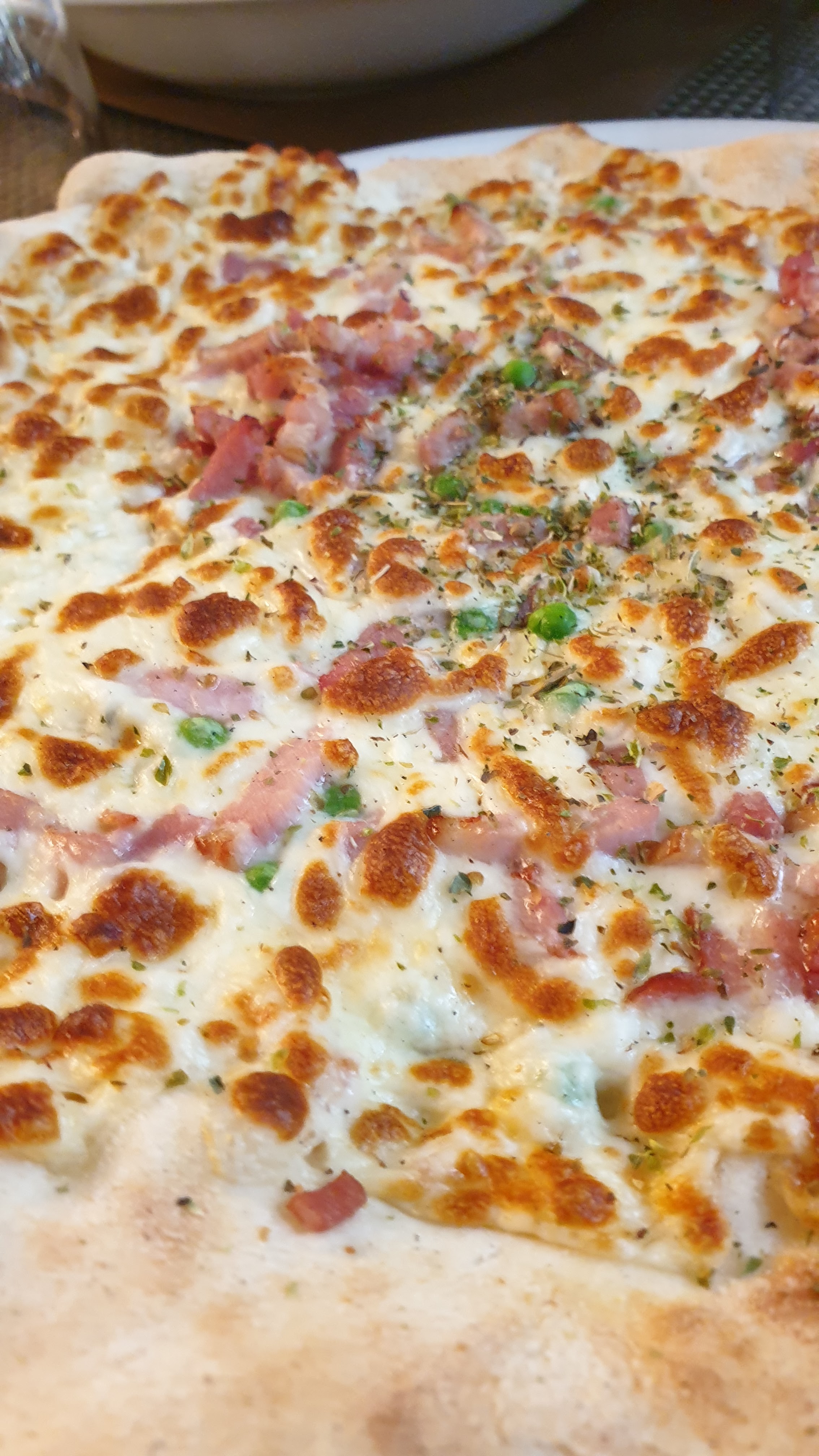 Nous avons pris des pizzas au saumon. La pate était impossible à couper. La pizza n’avait pas vraiment de goût. Nous n’avons jamais mangés de pizza si peu bonnes, vraiment déçus.