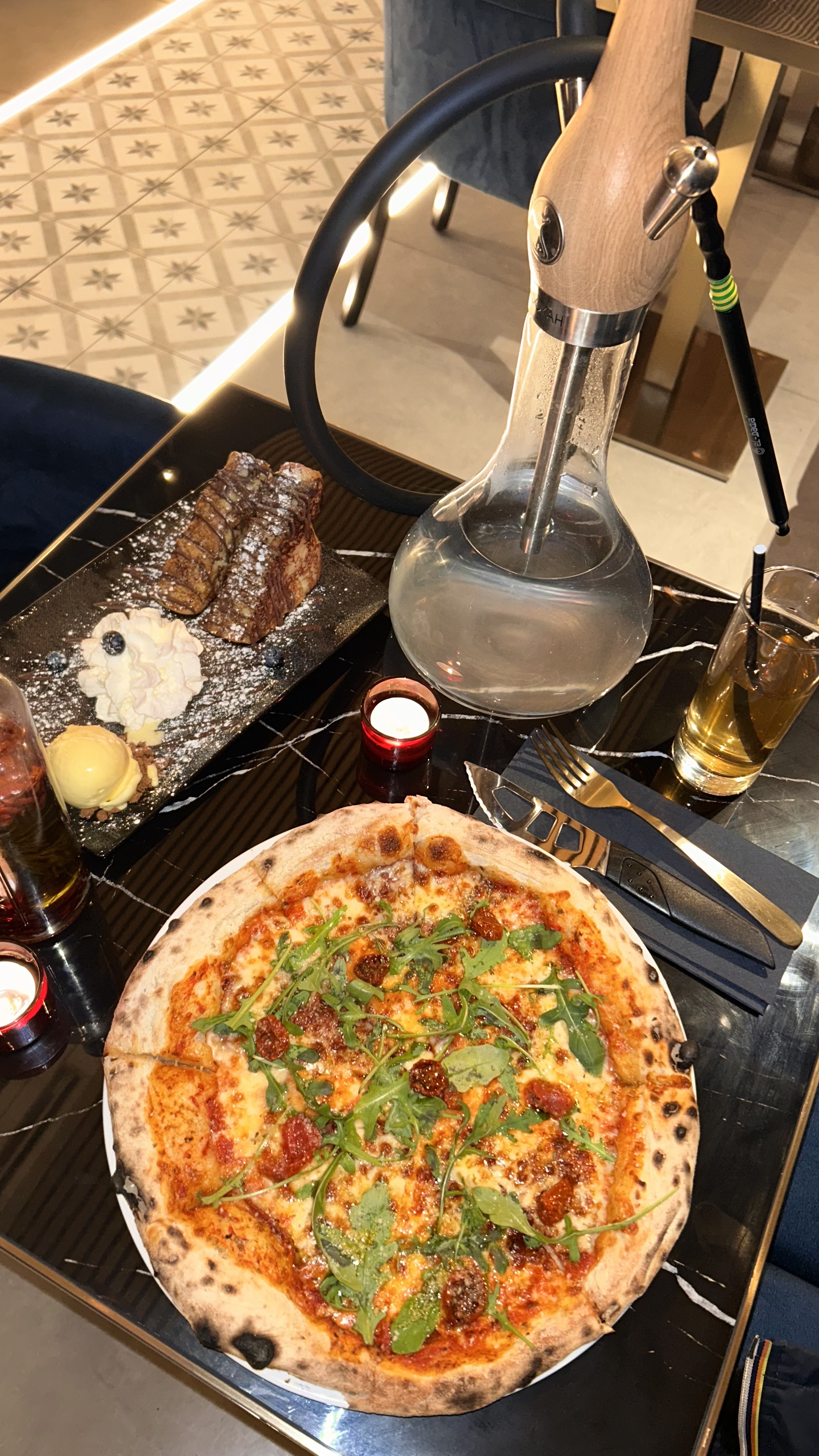 Nous avons reservé une table pour 6 personnes, arrivées sur place aucune résa pour 6 personnes, nous avons attendu puis ils nous ont placés sur une table de 4 personnes, soit 2 personnes débout, jusqu’à ce que la table à côté se libère. Ensuite, nous avions pour certaines commandées des entrées, et d’autres des plats directs, nous avons été servies aléatoirement, personne n’a mangé en même temps… sur 6 personnes 3 ont été servis, et la serveuse a osé nous demander s'il manquait quelque chose, bah oui nos plats du coup. Nous avons dû réclamer du pain 4 fois. Puis sans parler de l’attente qui était très longue… si nous souhaitons un dessert, évidemment la serveuse ne vient pas à vous, il faut l’appeler pour commander. Bref, ce qui sauve, c’est que la pizza était bonne. Mais sinon 1/10, le côté lounge chicha est mieux gérer que la partie restaurant qui laisse a désirer…